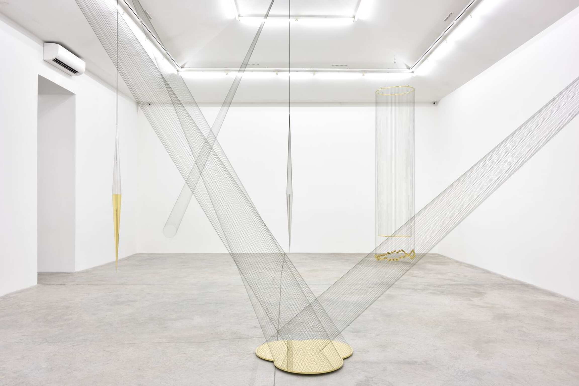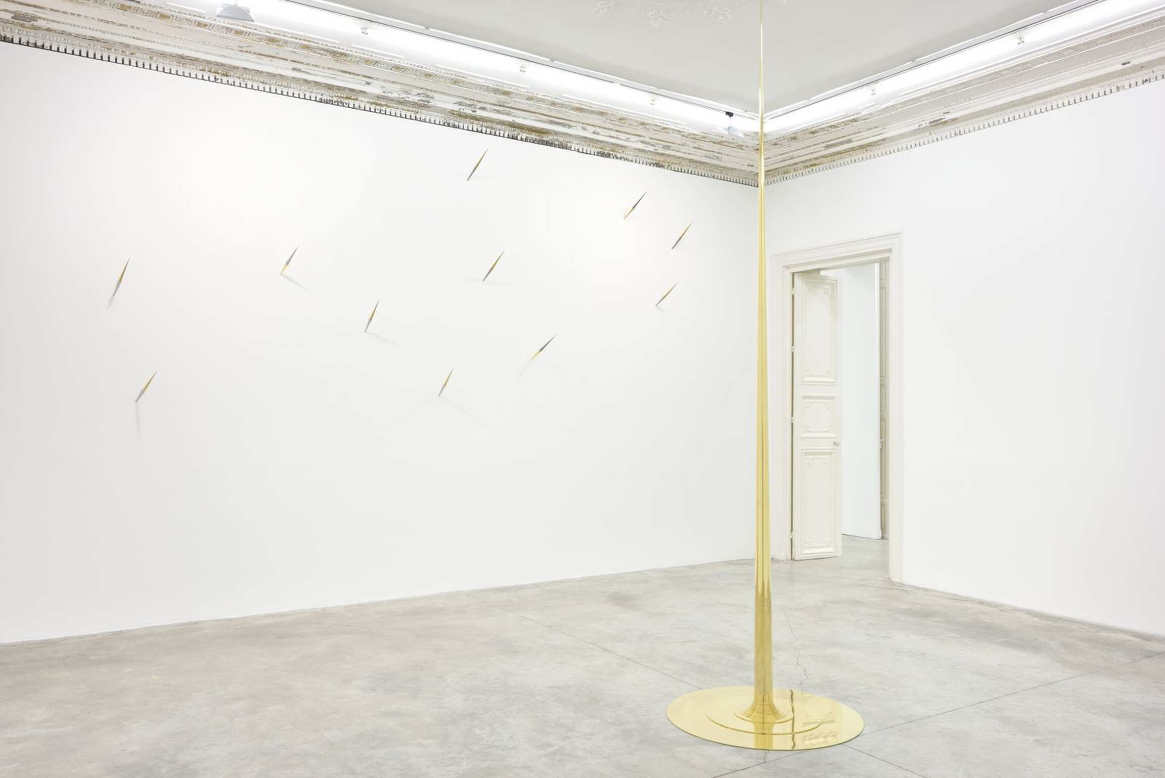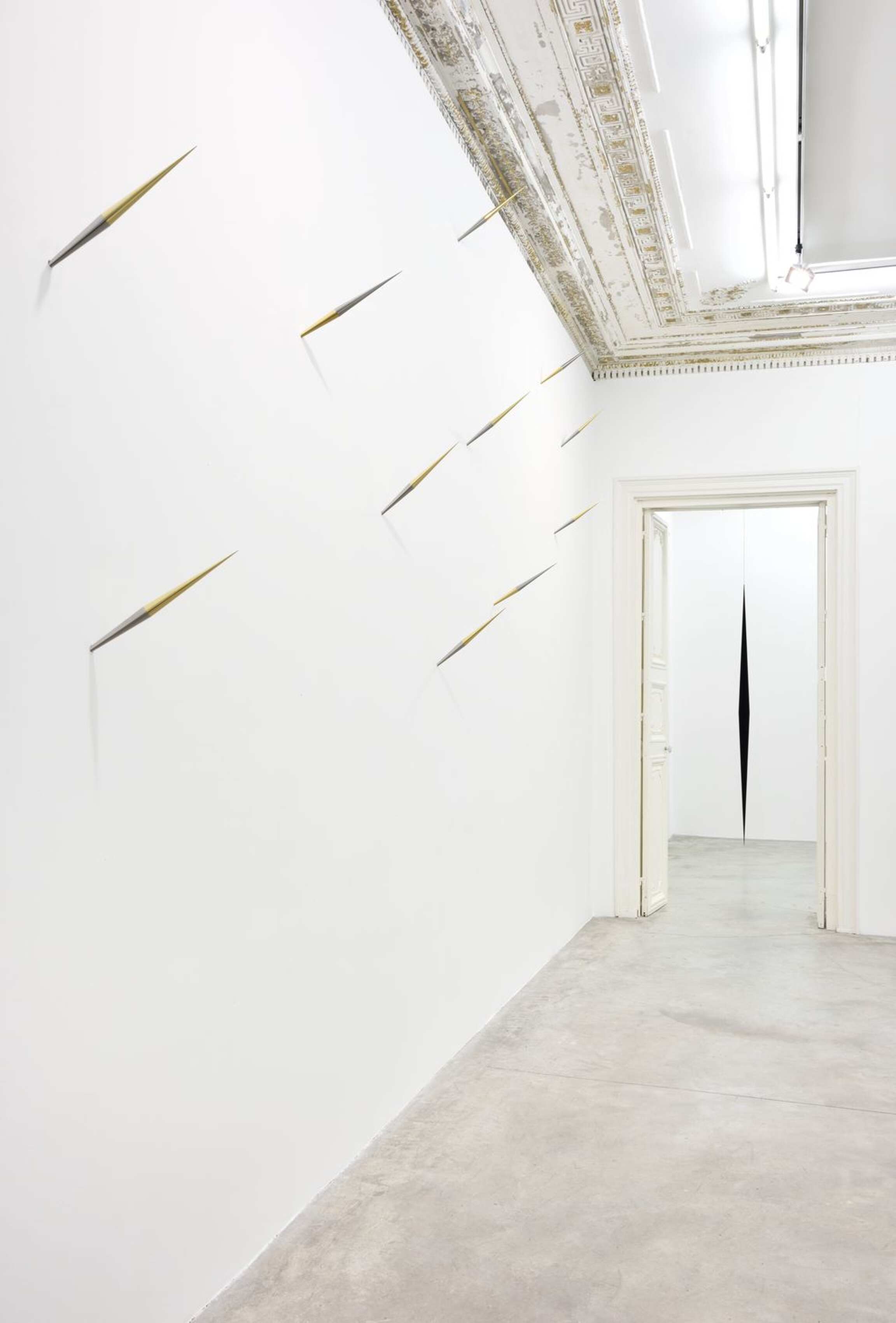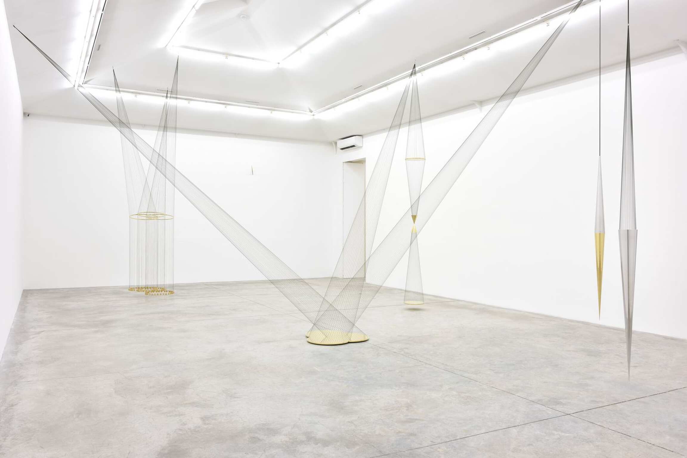 The arrangement across the gallery’s three rooms composes a constellation, interpreted by the artist, which invites the beholder to a kind of astral voyage. The stars converse, repel and attract each other. Here, the references and suspension will not fail to remind visitors of Foucault’s pendulum hanging from the Pantheon dome, and the experimental origin of this attempt to demonstrate the earth’s oscillation without external observation is reminiscent of Sextante, Alnilan or even Cardenal in its ability to express forces beyond our understanding. Lescher’s pieces are all the more fascinating as their extreme precision and formal execution, along with their relationship to the architecture, beyond their own geometry, also reflect the extreme relativity of time and space…