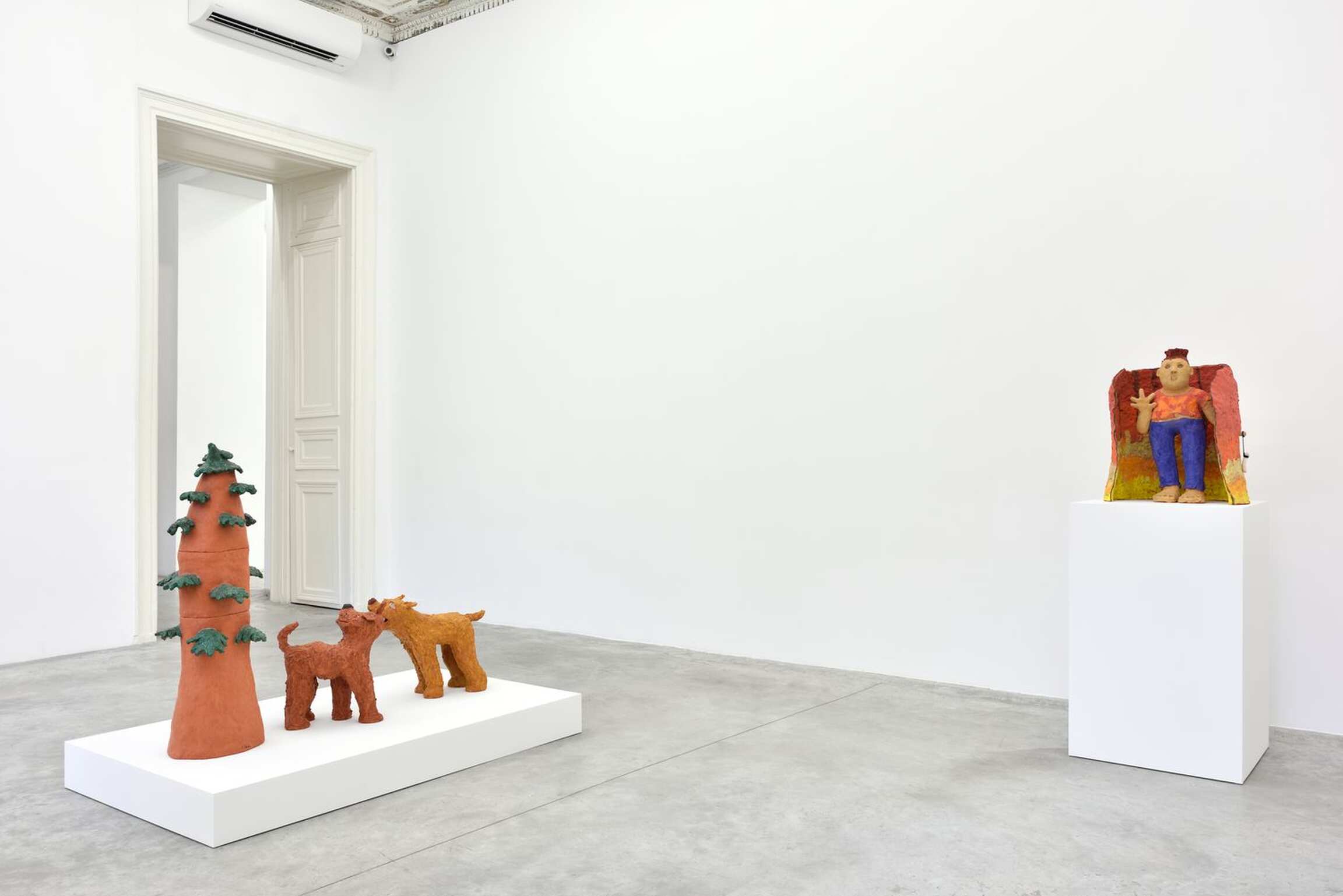 Certaines de ses oeuvres de grande taille, telles que Framing (2019) et Dog Fight (2000 - 2019), dépassent la condition de figures et deviennent un véritable ensemble scénographique. S’élevant du sol, les deux sculptures, dont les personnages semblent issus de films d’animation, racontent une histoire.