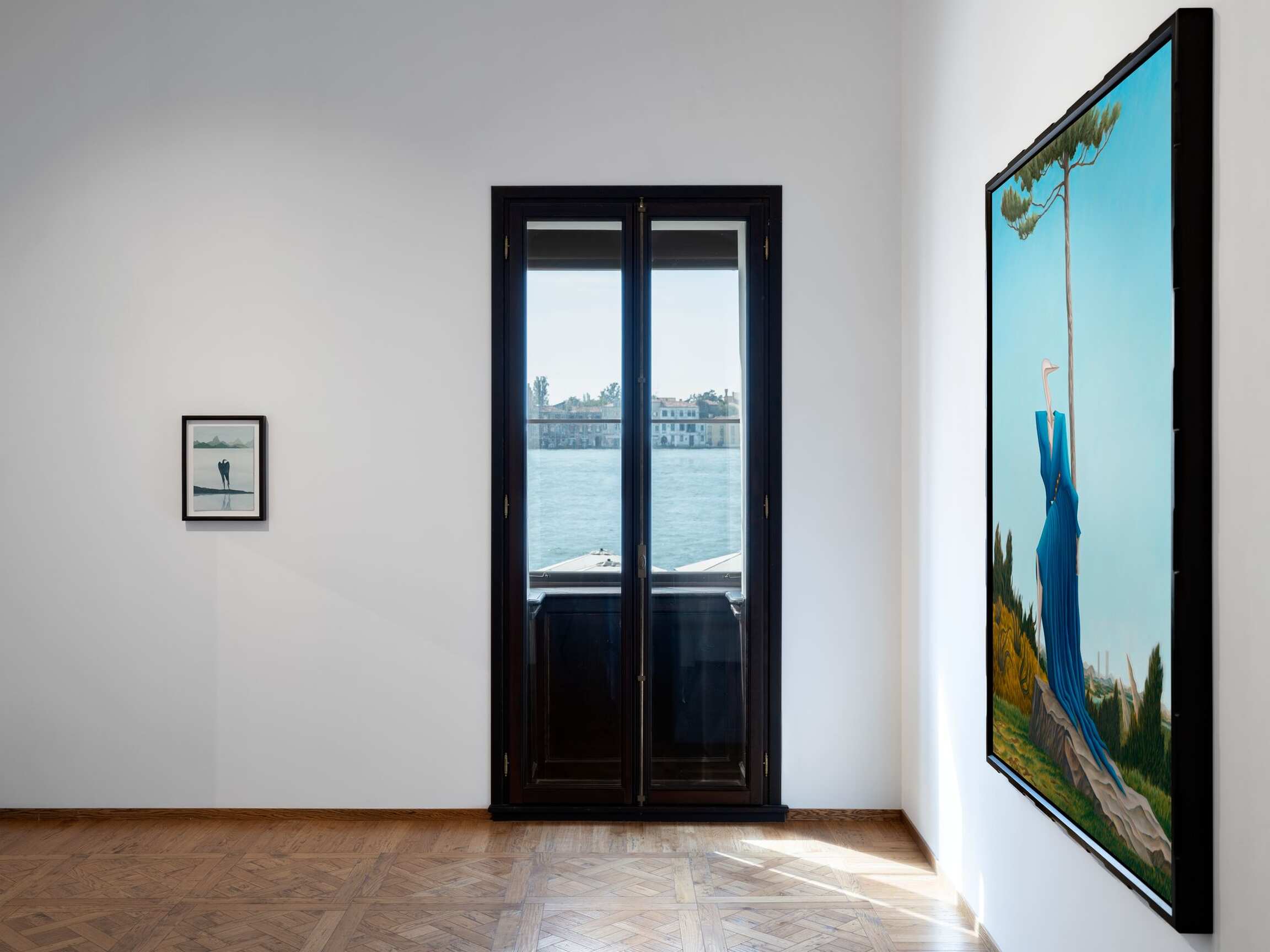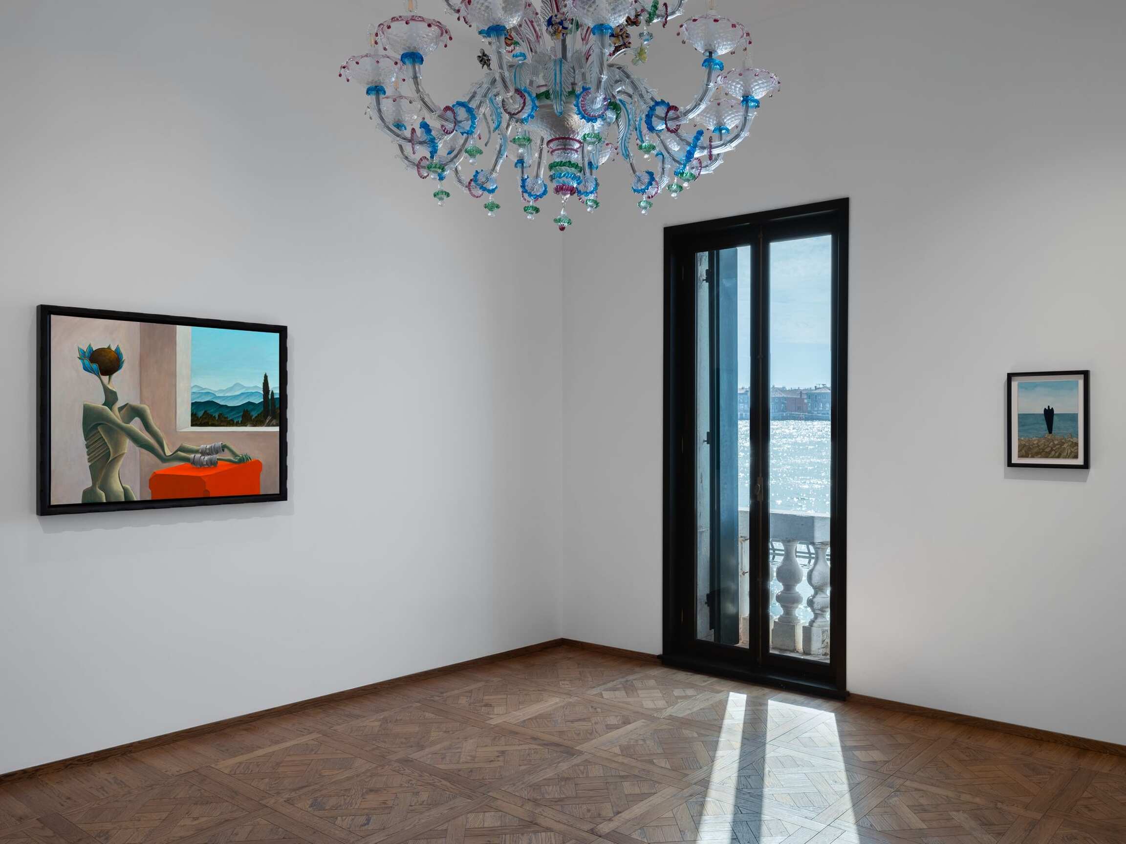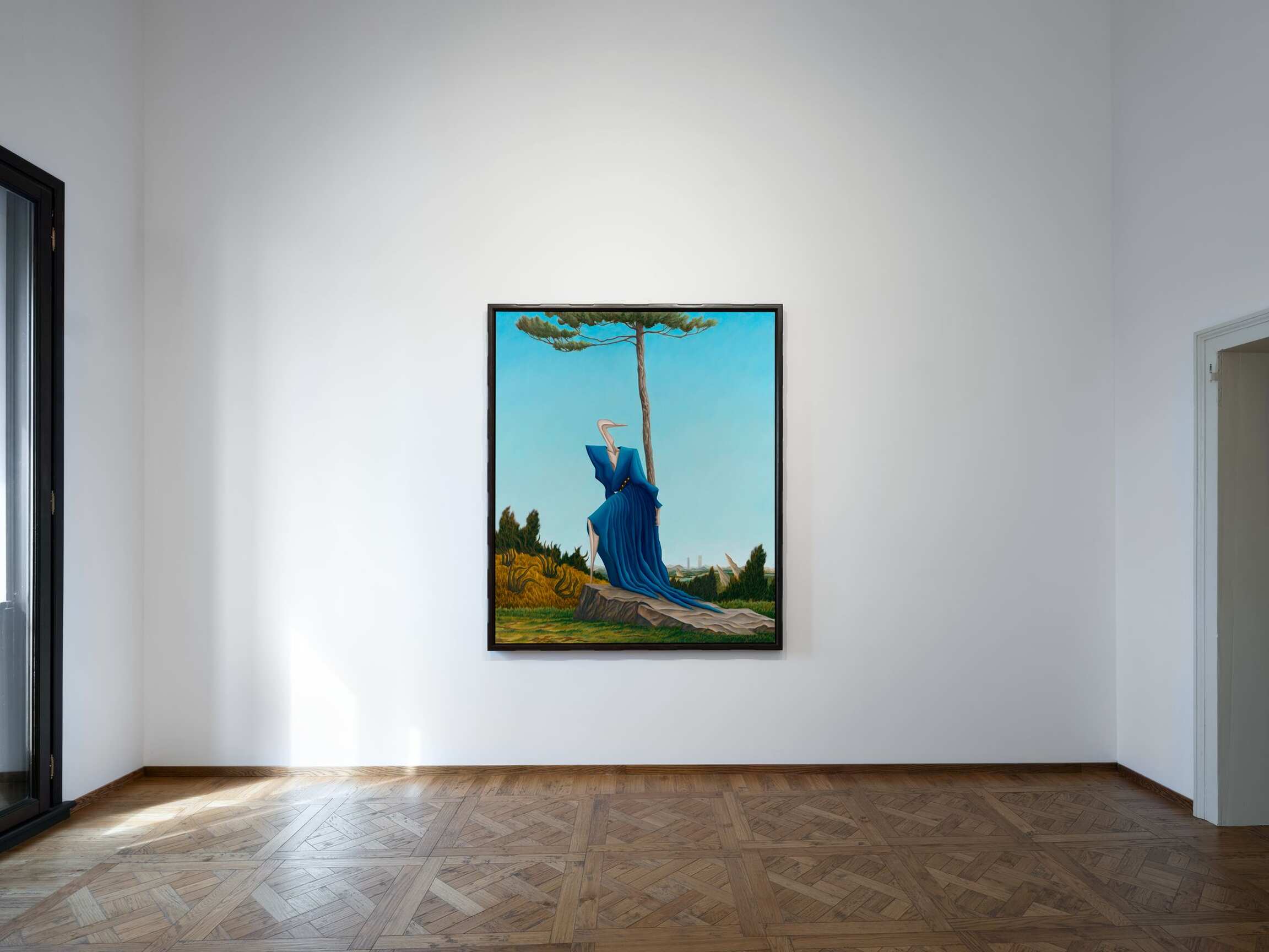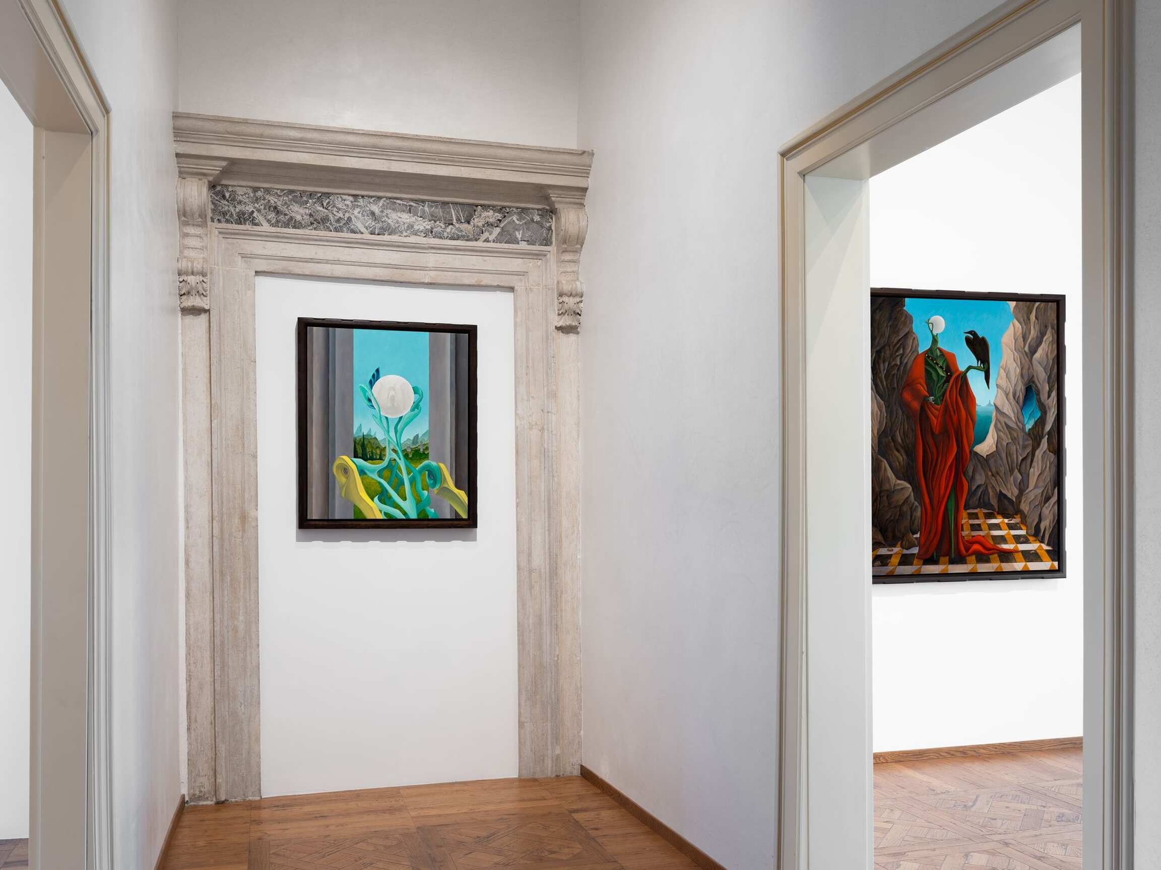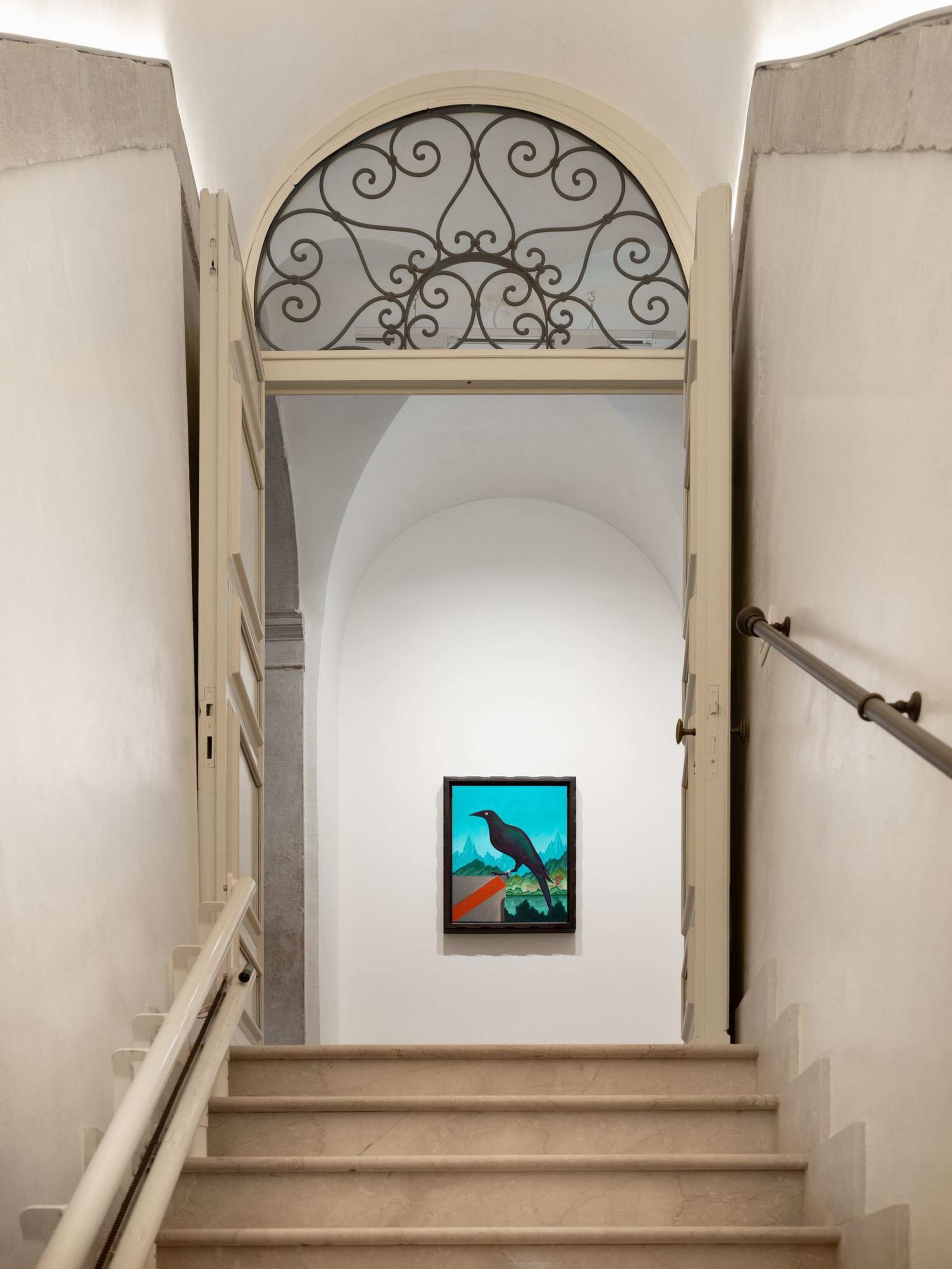 A shamanic figure is the protagonist of The Witch (2023), which merges different artistic references: while the title and the pose remind the homonymous Max Ernst's painting (The Witch, 1941), the protagonist in Cardenas' version refers to the figure of the curandero, the traditional native Latin American shaman and healer. It holds a black bird and looks imprisoned in a cave, symbolizing a constrained world. The theatrical, evocative scene of the rocks has roots in late nineteenth-century Symbolist painting. It opens on a deep distance view which suggests a prominent linear perspective, emphasized by the sumptuous tiled floor that clashes with the rocky backdrop of the work.