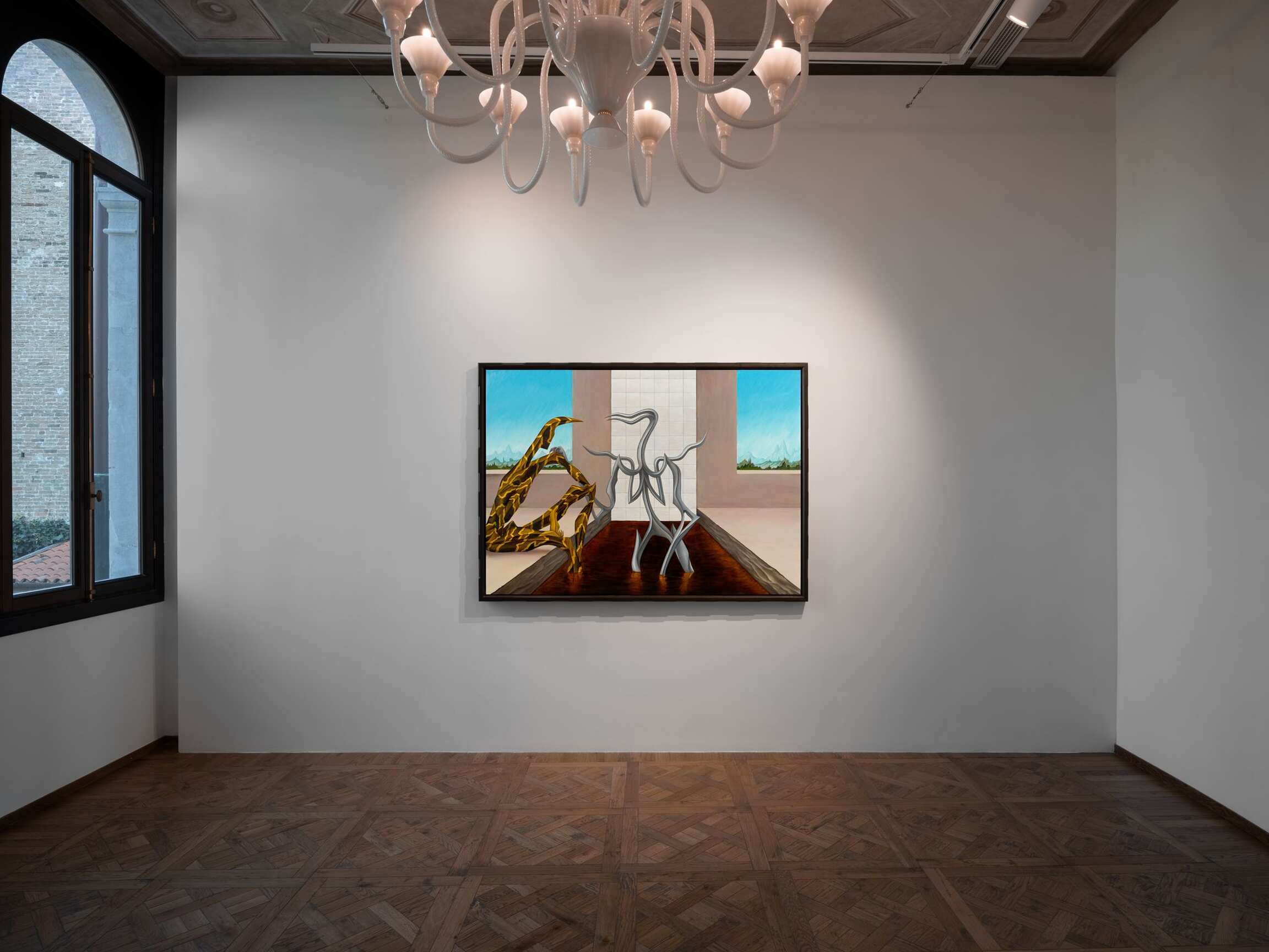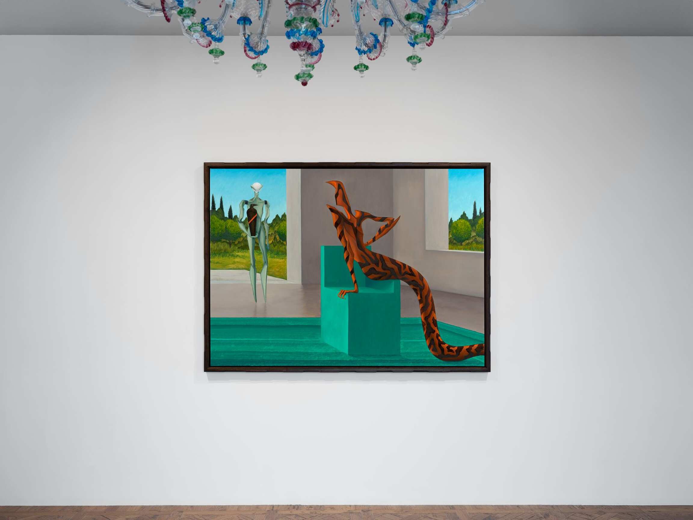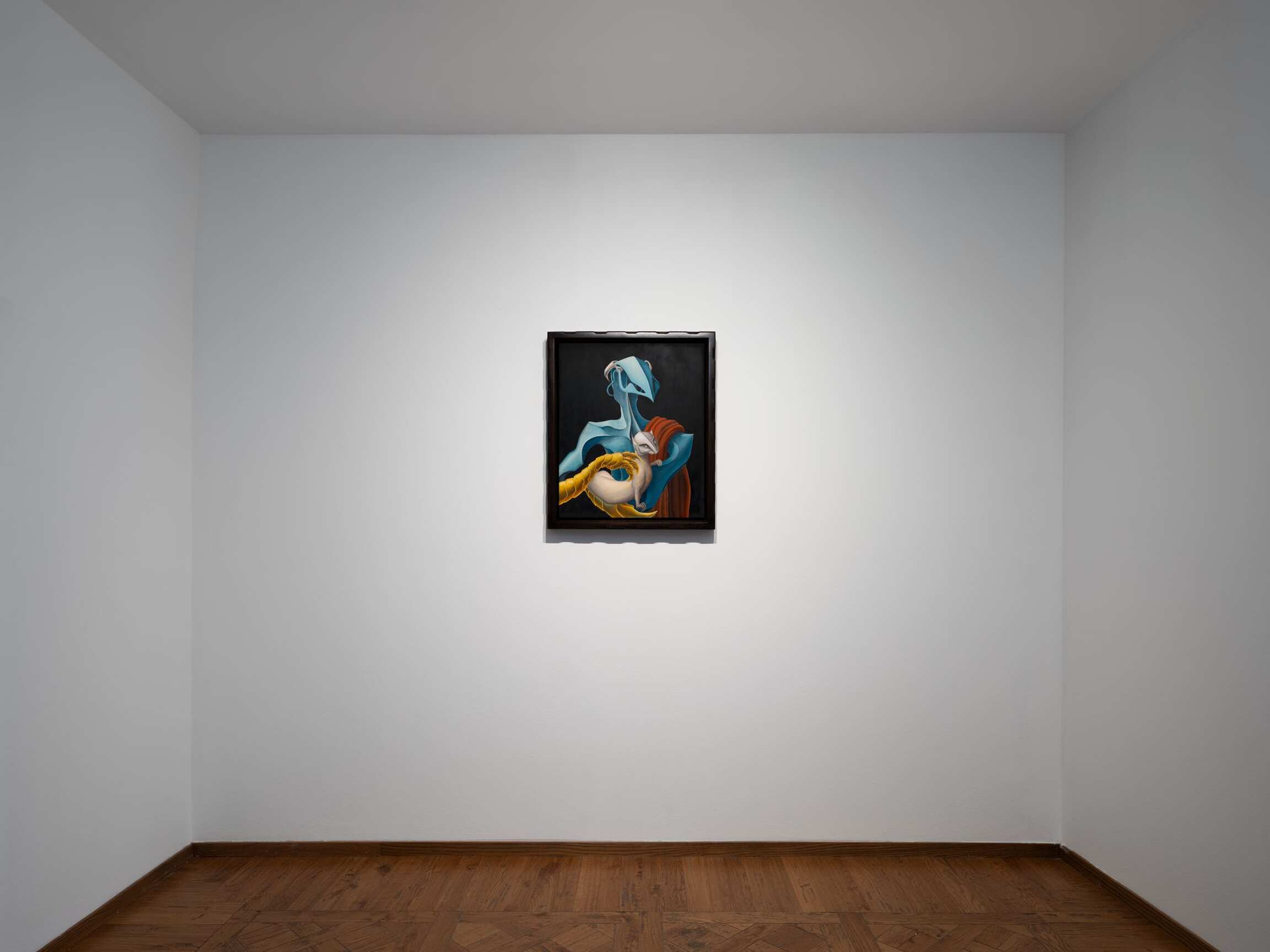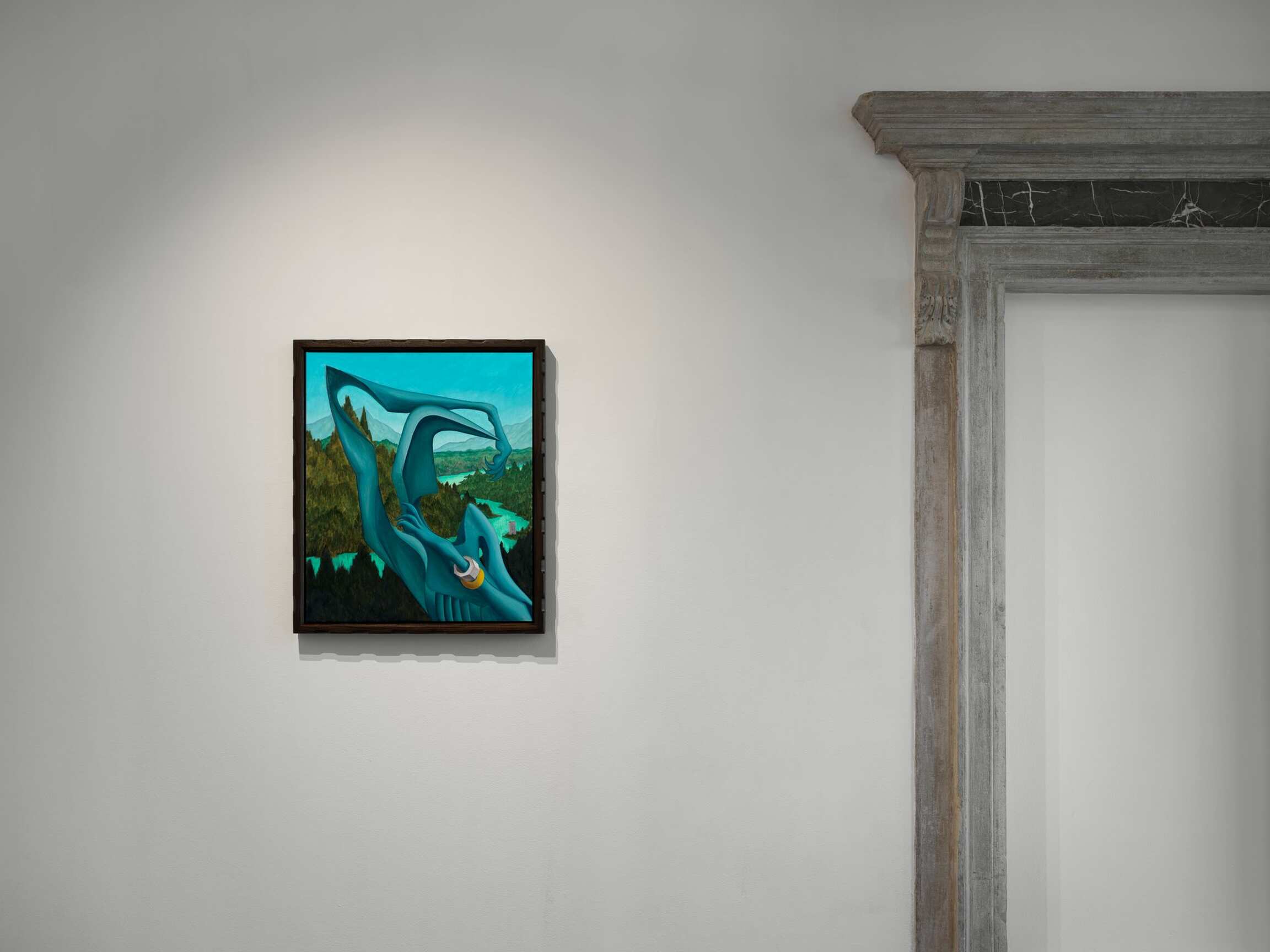In the Regent and A View of the Mountains (both 2023), Cardenas recuperates the metaphor of a window on the world to emulate the vision of a specific moment in time and space. During the Renaissance in Italy and Northern Europe, windows negotiated the relationship between microcosm and macrocosm and, by extension, the relationship between the figure situated indoors and the cosmos beyond. In these two works, inspired by Erwin Panofsky's 1924 essay "Perspective as Symbolic Form", the window is not a simple architectural element that can stress the background with distant mountains or mark the composition but also functions as a metaphor for stepping into the unknown. The reclining pose of the first painting and the gesture recalling a praying figure in the second contradicts the organic forms of the figures portrayed, whose knife-sharp edges, compact twisted shapes, and stretching points remember the sculpture of Henry Moore, as in many Cardenas’ paintings.
