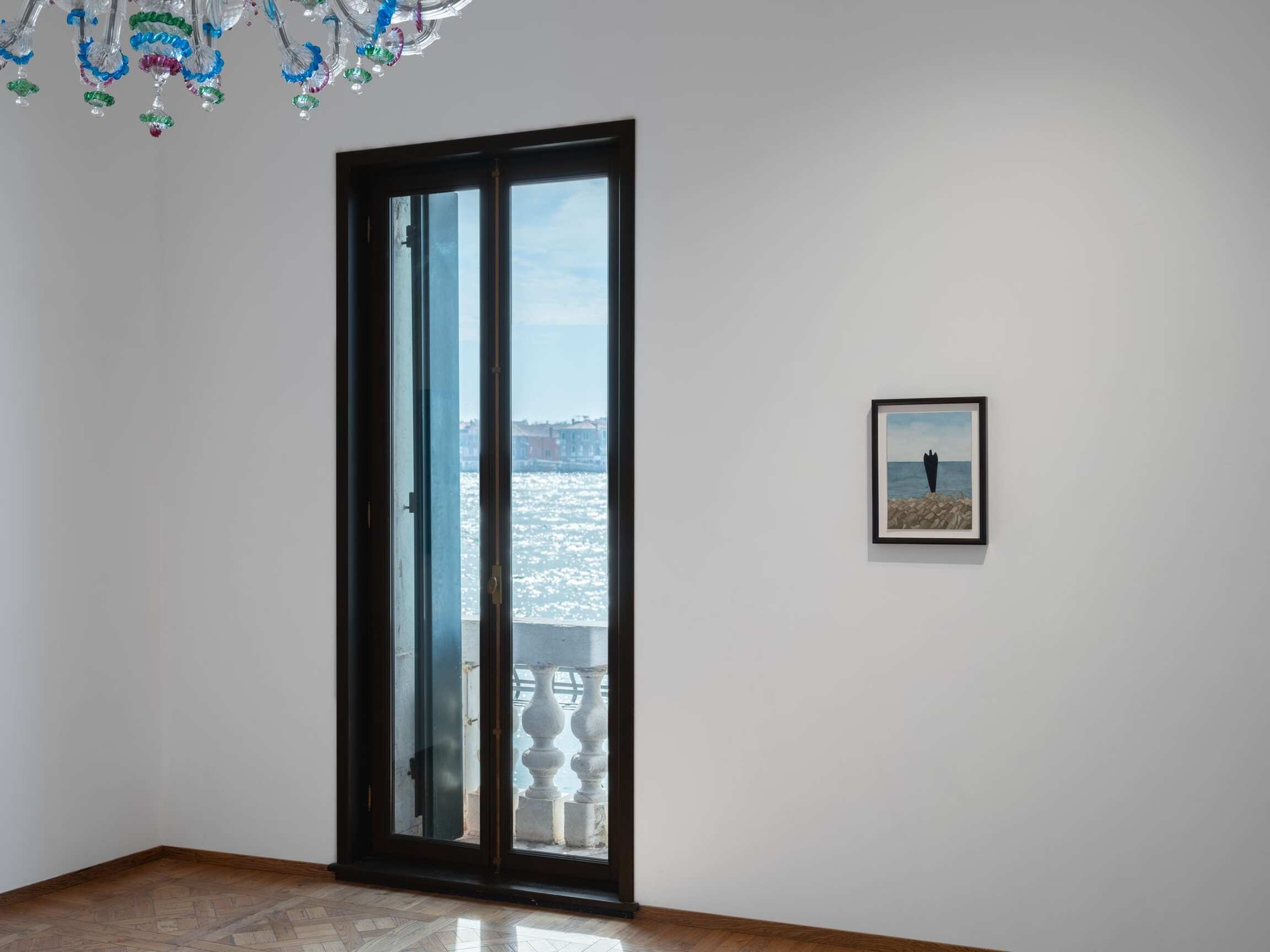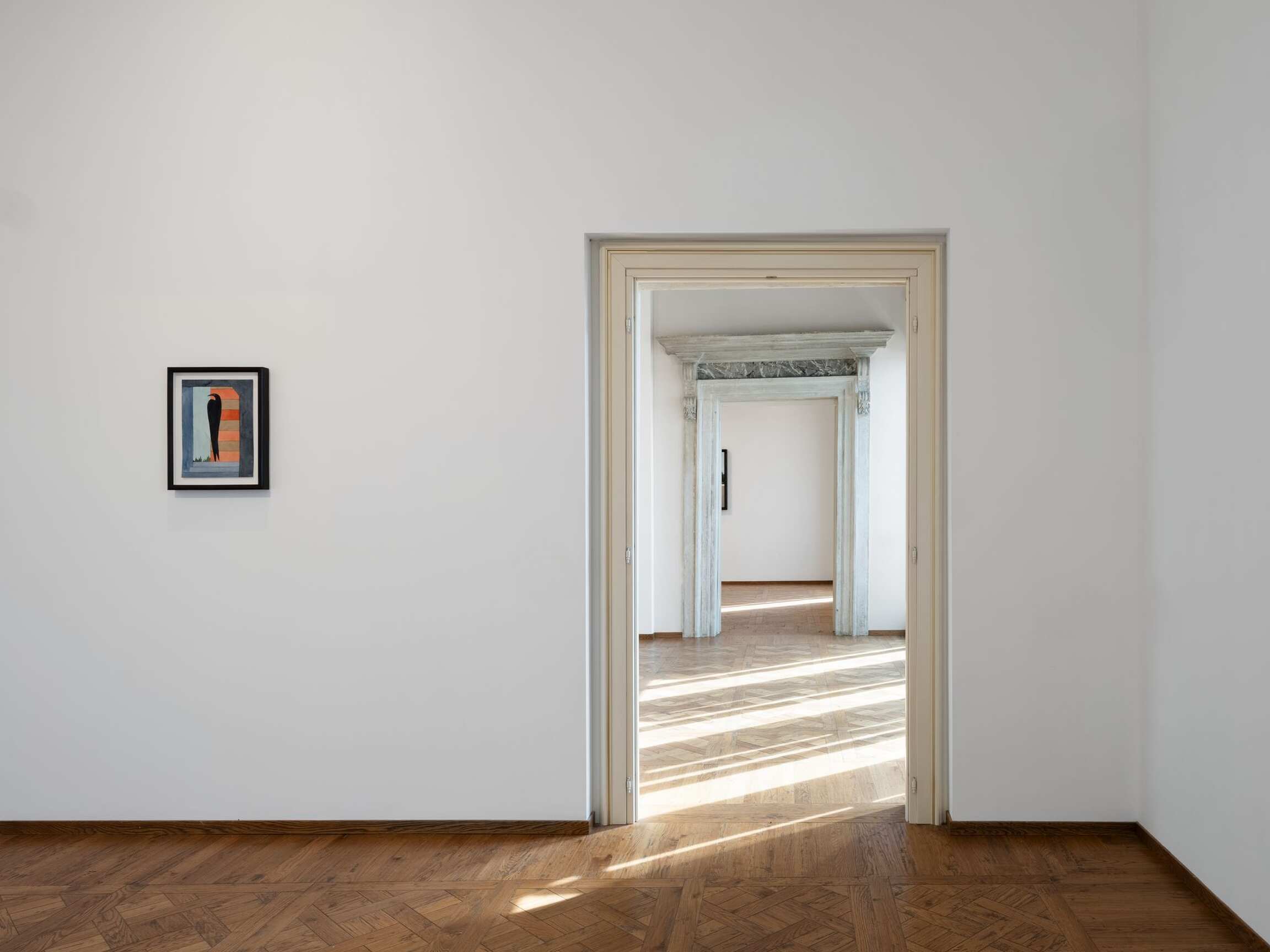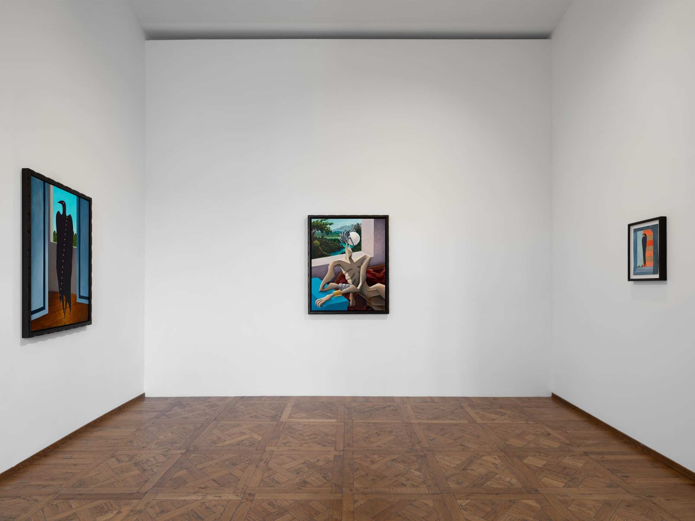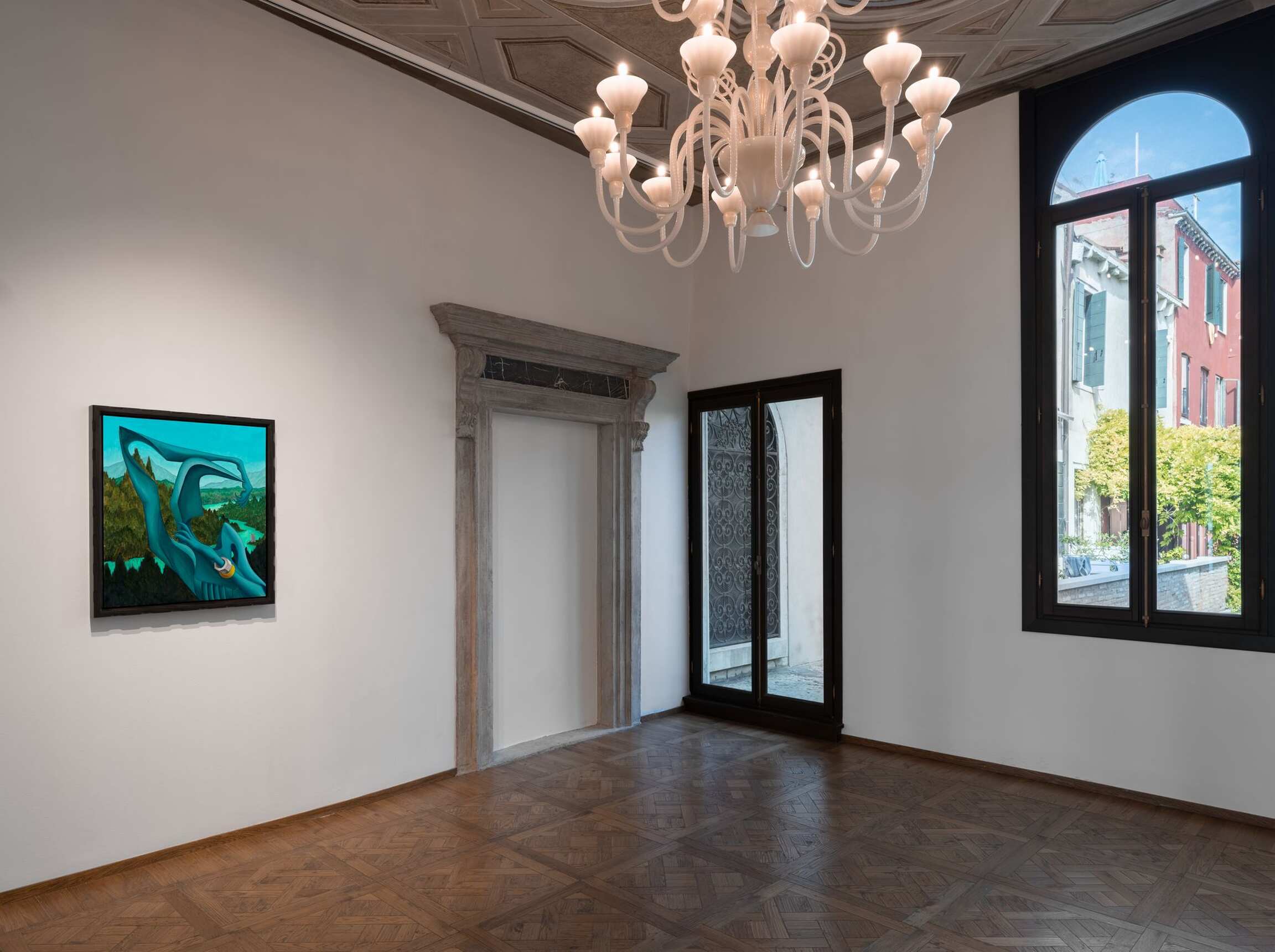 In the Regent and A View of the Mountains (both 2023), Cardenas recuperates the metaphor of a window on the world to emulate the vision of a specific moment in time and space. During the Renaissance in Italy and Northern Europe, windows negotiated the relationship between microcosm and macrocosm and, by extension, the relationship between the figure situated indoors and the cosmos beyond. In these two works, inspired by Erwin Panofsky's 1924 essay "Perspective as Symbolic Form", the window is not a simple architectural element that can stress the background with distant mountains or mark the composition but also functions as a metaphor for stepping into the unknown. The reclining pose of the first painting and the gesture recalling a praying figure in the second contradicts the organic forms of the figures portrayed, whose knife-sharp edges, compact twisted shapes, and stretching points remember the sculpture of Henry Moore, as in many Cardenas’ paintings.