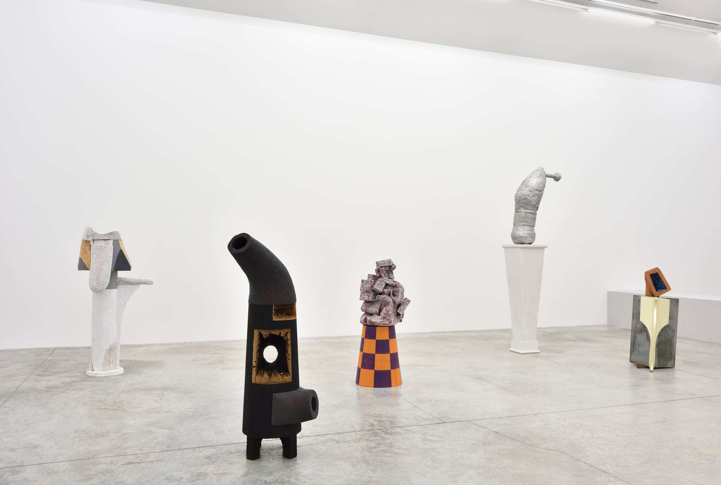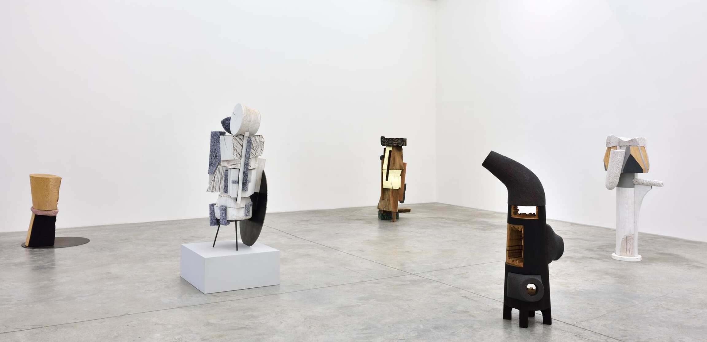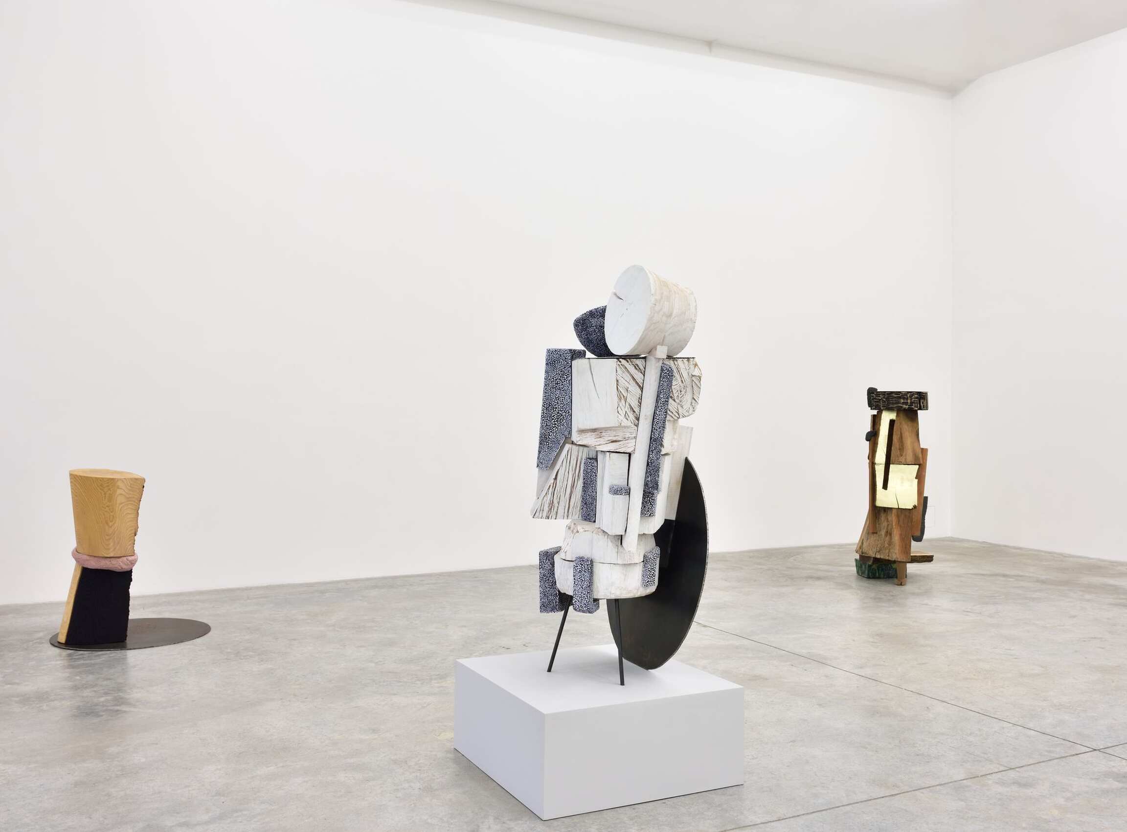 Dans la salle principale, des sculptures exécutées entre 2015 et 2018 témoignent du caractère singulier du langage visuel de l’artiste : les associations et les assemblages foisonnent devant nous. Exploitant la psychologie de l’espace transitoire, chacune des œuvres provoque une empathie immédiate chez celui qui l’observe ; comme par exemple, la sculpture intitulée The Body is an Ear (2016) avec les mouvements implicites et les froissements humoristiques d’une jupe de bois. Transpercée asymétriquement par un vide linéaire – l’oreille, le sexe, la fenêtre, le plan absent, l’espace de l’imagination – The Body is an Ear fait référence tant à l’architecture, qu’aux personnages, aux costumes et au mobilier du XVIIIème siècle. Visuellement maintenue par une feuille d’or éphémère, cette impressionnante construction s’équilibre sur un sabot sculpté et un bloc de céramique émaillée. Equal Time (2017), une œuvre faite exclusivement de noir, blanc et gris, renvoie au constructivisme avec son agrégation de formes élémentaires miraculeusement assemblées. Arlene Shechet déploie dans ces compositions brutes aux formes mouvementées un vocabulaire esthétique raffiné et parfaitement maîtrisé.