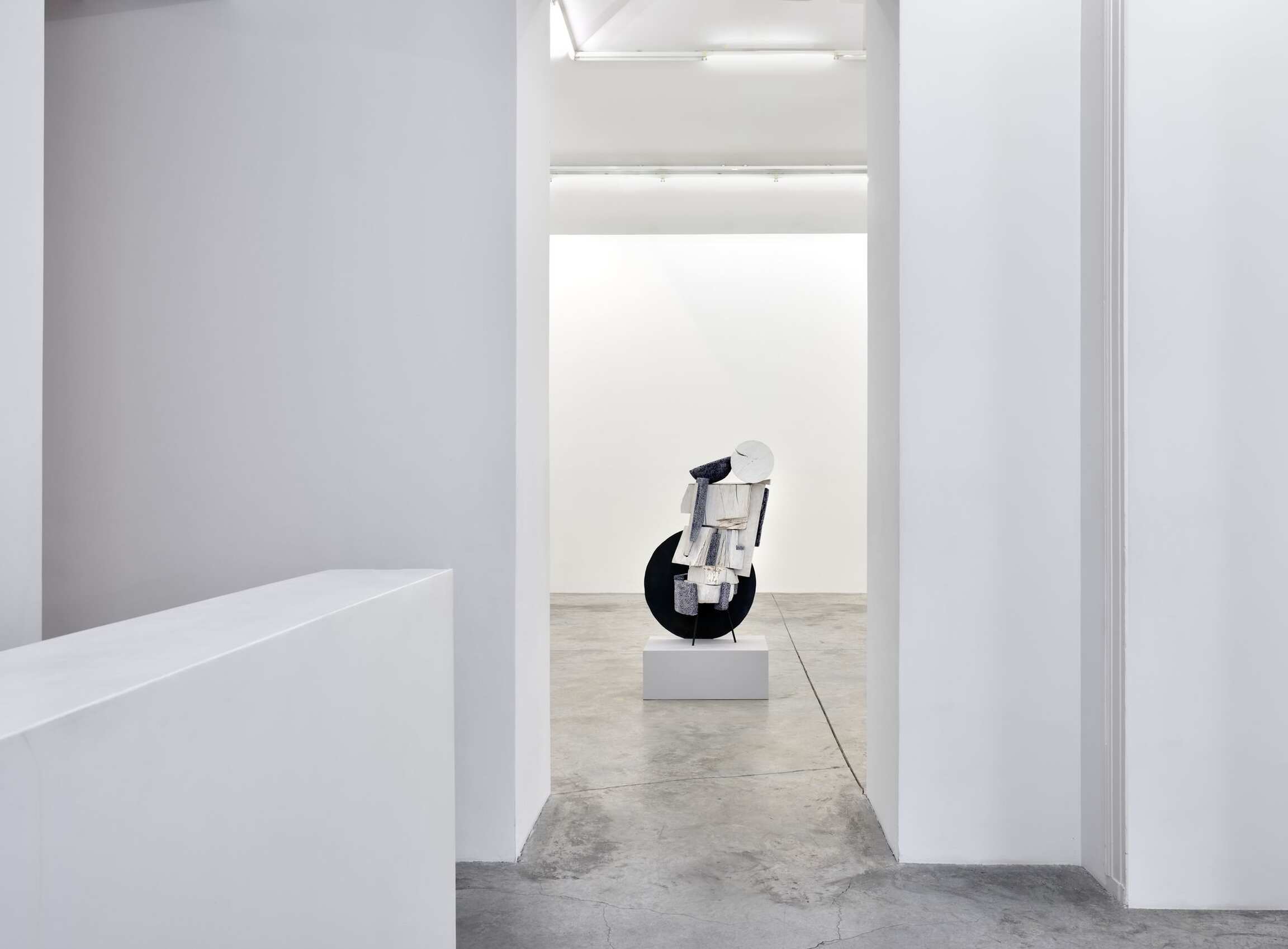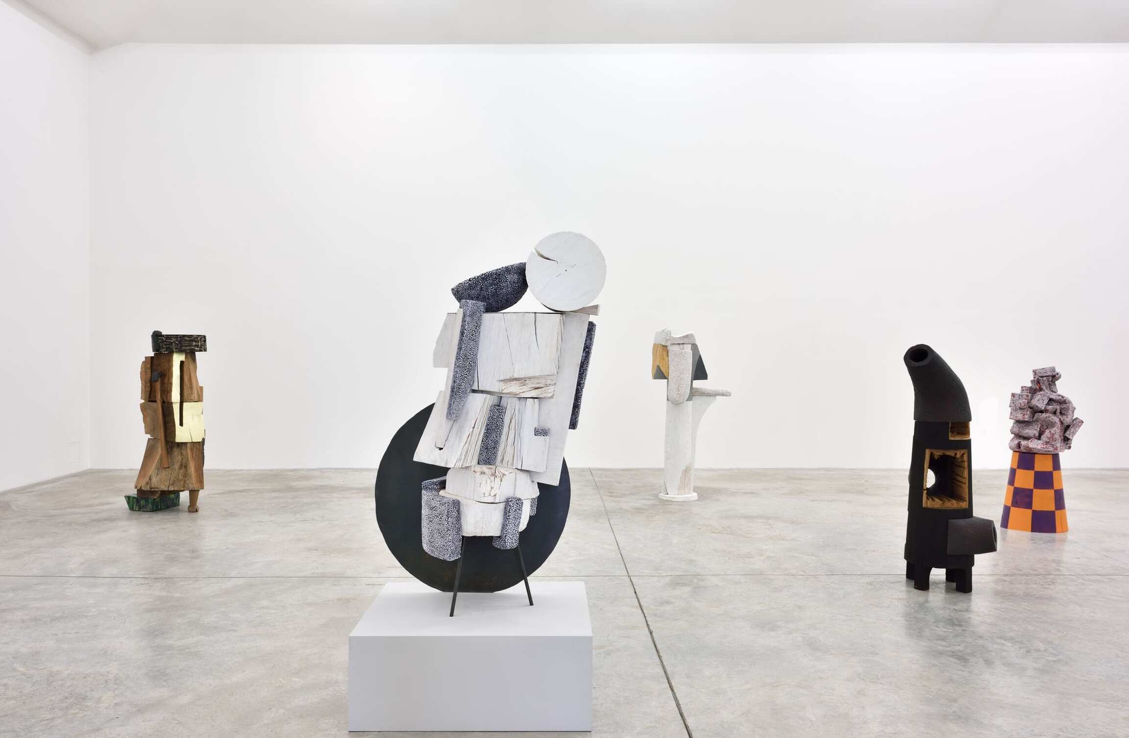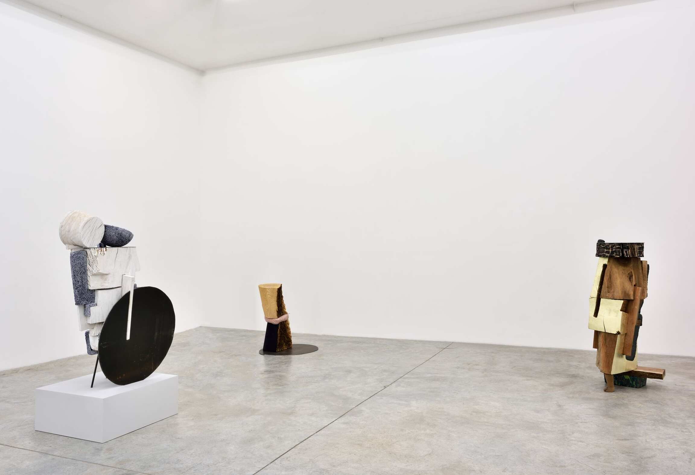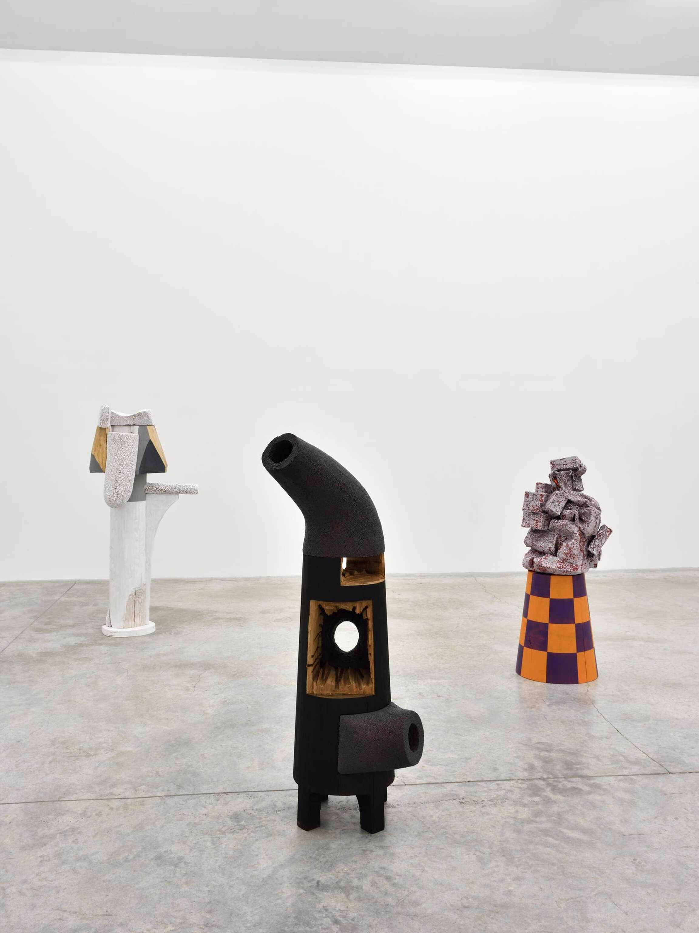 Dans la salle principale, des sculptures exécutées entre 2015 et 2018 témoignent du caractère singulier du langage visuel de l’artiste : les associations et les assemblages foisonnent devant nous. Exploitant la psychologie de l’espace transitoire, chacune des œuvres provoque une empathie immédiate chez celui qui l’observe ; comme par exemple, la sculpture intitulée The Body is an Ear (2016) avec les mouvements implicites et les froissements humoristiques d’une jupe de bois. Transpercée asymétriquement par un vide linéaire – l’oreille, le sexe, la fenêtre, le plan absent, l’espace de l’imagination – The Body is an Ear fait référence tant à l’architecture, qu’aux personnages, aux costumes et au mobilier du XVIIIème siècle. Visuellement maintenue par une feuille d’or éphémère, cette impressionnante construction s’équilibre sur un sabot sculpté et un bloc de céramique émaillée. Equal Time (2017), une œuvre faite exclusivement de noir, blanc et gris, renvoie au constructivisme avec son agrégation de formes élémentaires miraculeusement assemblées. Arlene Shechet déploie dans ces compositions brutes aux formes mouvementées un vocabulaire esthétique raffiné et parfaitement maîtrisé.