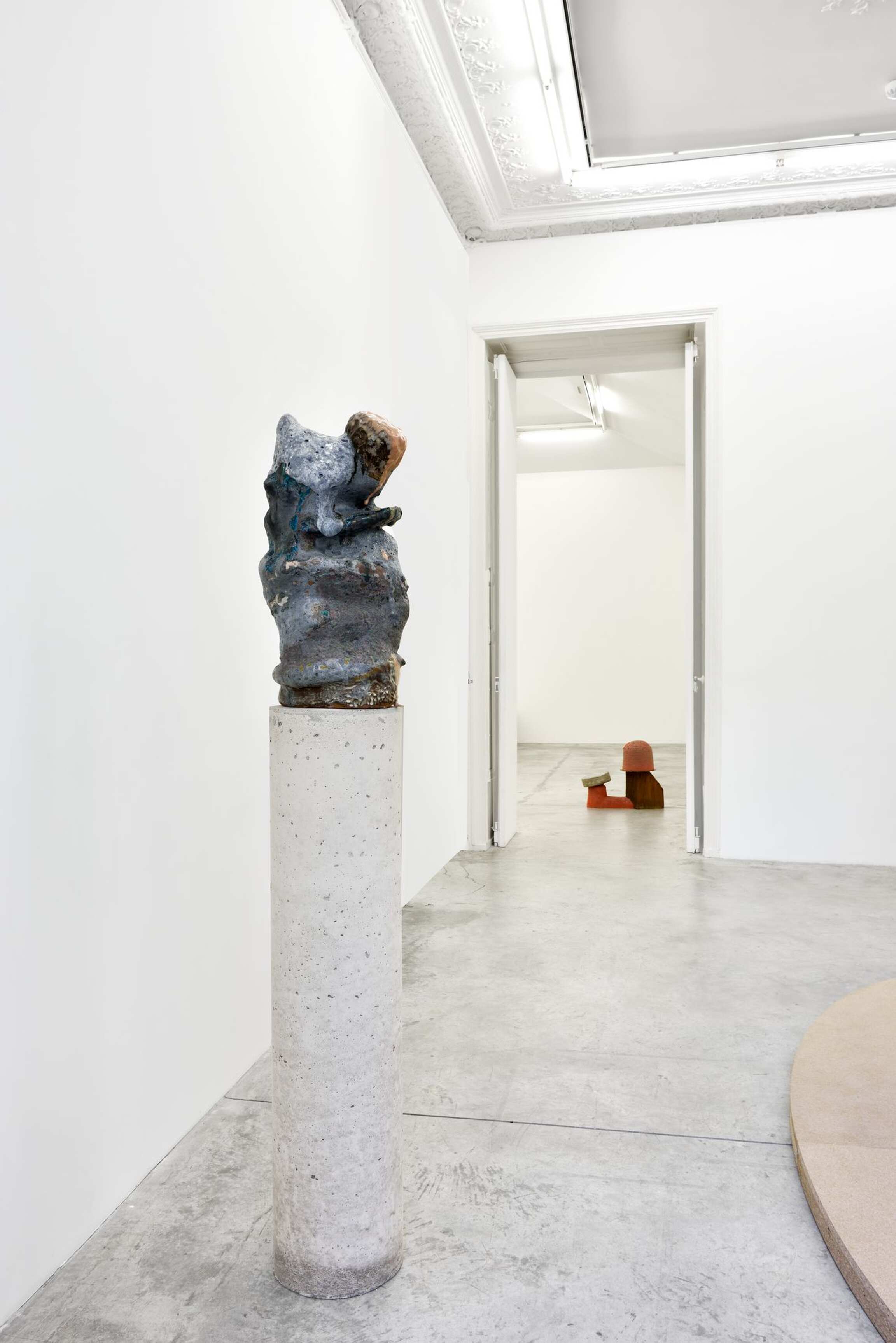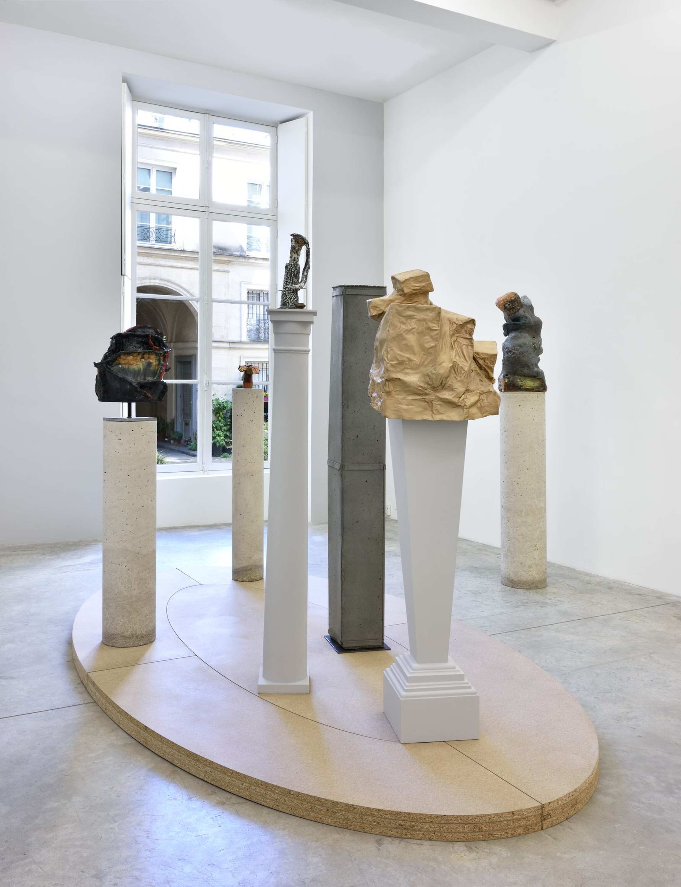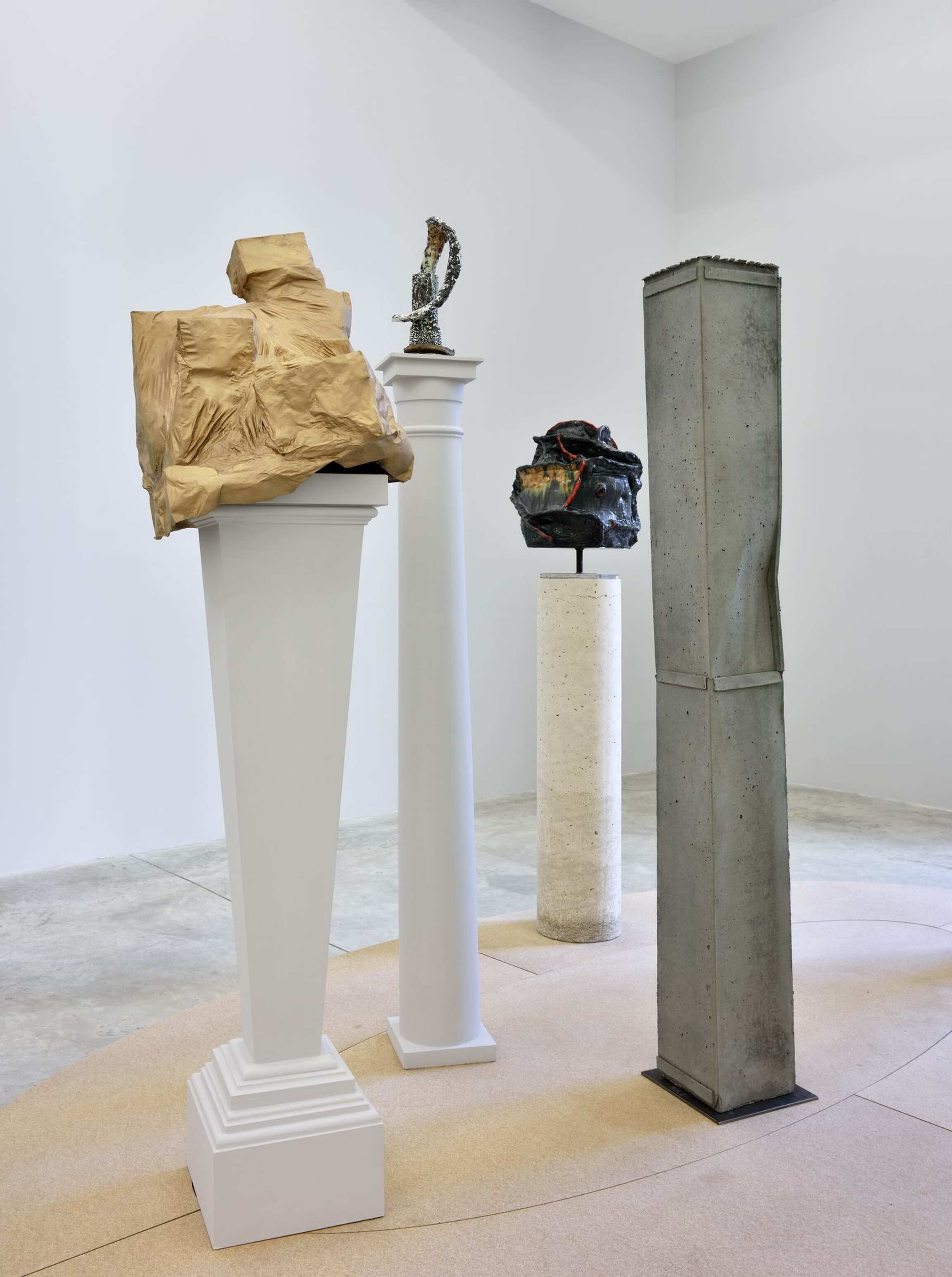 La dernière salle de la galerie rend hommage à une installation que l’artiste admire depuis longtemps, présentée en 1900 au musée Rodin et composée d’un ensemble de socles cylindriques disparates rassemblés sur une large plate-forme ovoïde. La sculpture Madame Fenaille, buste drapé, la tête relevée, sur gaine à rinceaux réalisée par Rodin (1898-1900) se déploie audacieusement au sommet d’une de ces colonnes classiques. Saluant l’œuvre de Rodin, le nouveau moulage en bronze d’Arlene Shechet, Prophet: Madame F ( 2018), évoquant des constructions de papier, s’étend de la même manière au sommet de sa colonne. Le titre de l’exposition « Some Truths » fait écho au travail d’investigation de l’artiste dans son atelier donnant naissance à des œuvres toutes singulières, résultats d’une longue recherche. Un ensemble d‘œuvres surprenant et cohérent éclot de la démarche spontanée et du regard de l‘artiste porté sur l’histoire.