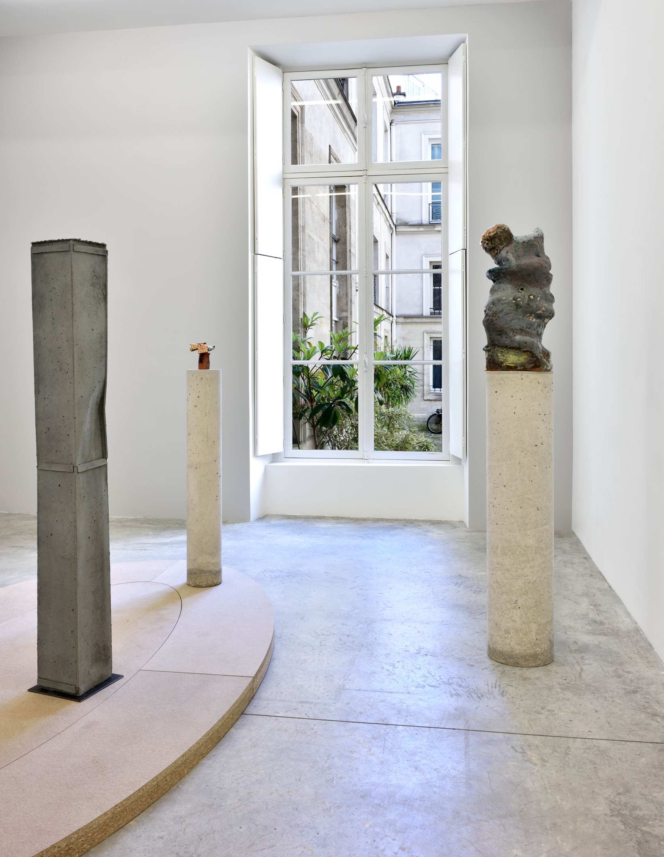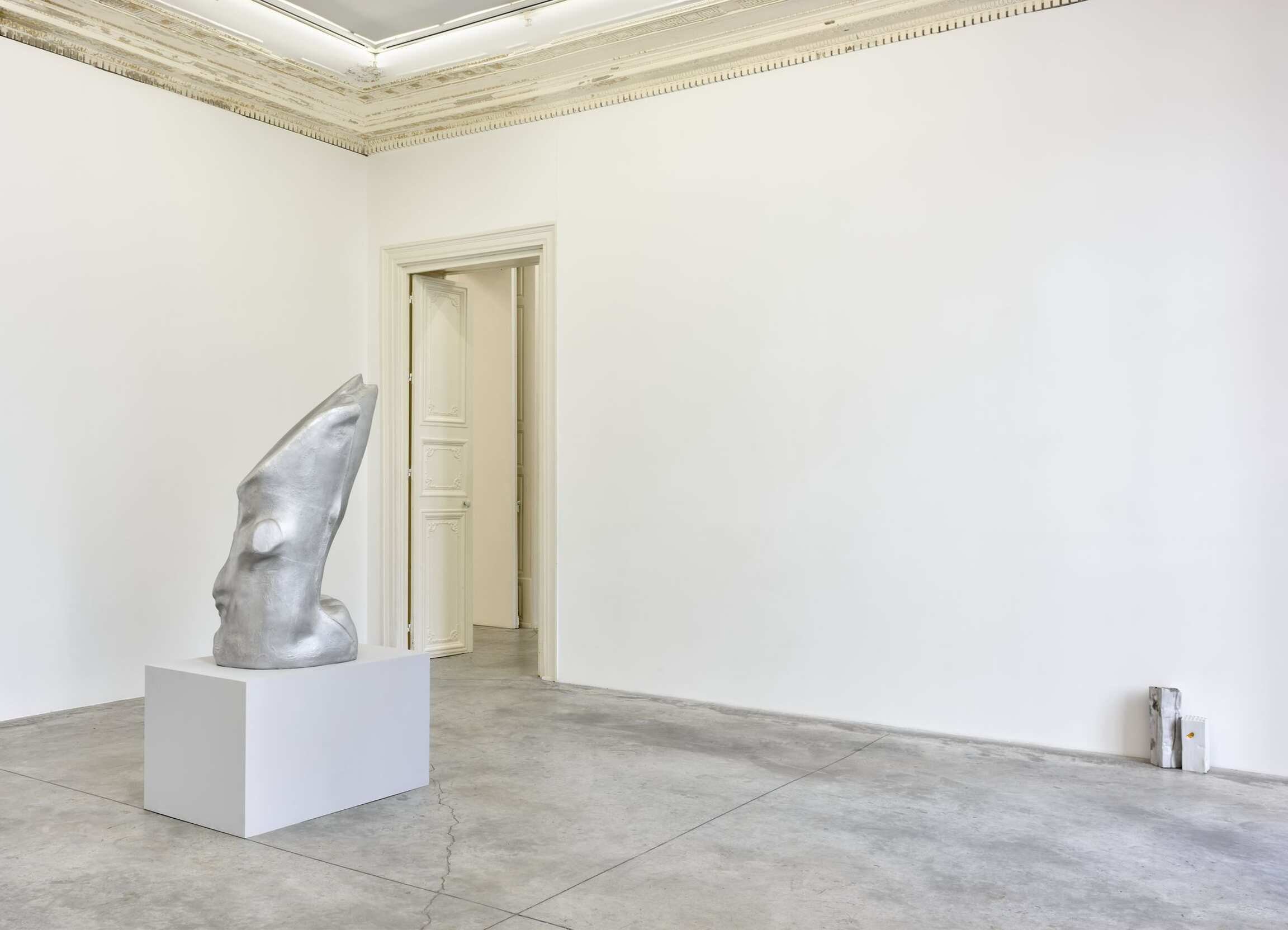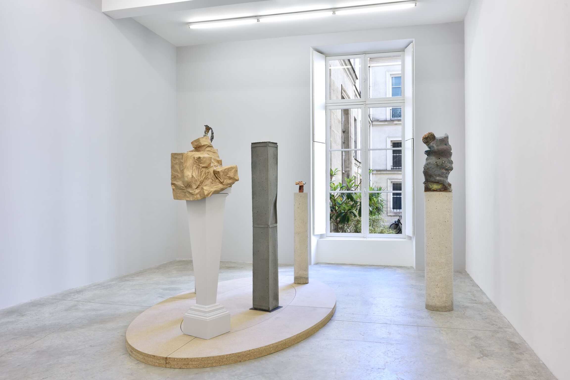 La dernière salle de la galerie rend hommage à une installation que l’artiste admire depuis longtemps, présentée en 1900 au musée Rodin et composée d’un ensemble de socles cylindriques disparates rassemblés sur une large plate-forme ovoïde. La sculpture Madame Fenaille, buste drapé, la tête relevée, sur gaine à rinceaux réalisée par Rodin (1898-1900) se déploie audacieusement au sommet d’une de ces colonnes classiques. Saluant l’œuvre de Rodin, le nouveau moulage en bronze d’Arlene Shechet, Prophet: Madame F ( 2018), évoquant des constructions de papier, s’étend de la même manière au sommet de sa colonne. Le titre de l’exposition « Some Truths » fait écho au travail d’investigation de l’artiste dans son atelier donnant naissance à des œuvres toutes singulières, résultats d’une longue recherche. Un ensemble d‘œuvres surprenant et cohérent éclot de la démarche spontanée et du regard de l‘artiste porté sur l’histoire.
