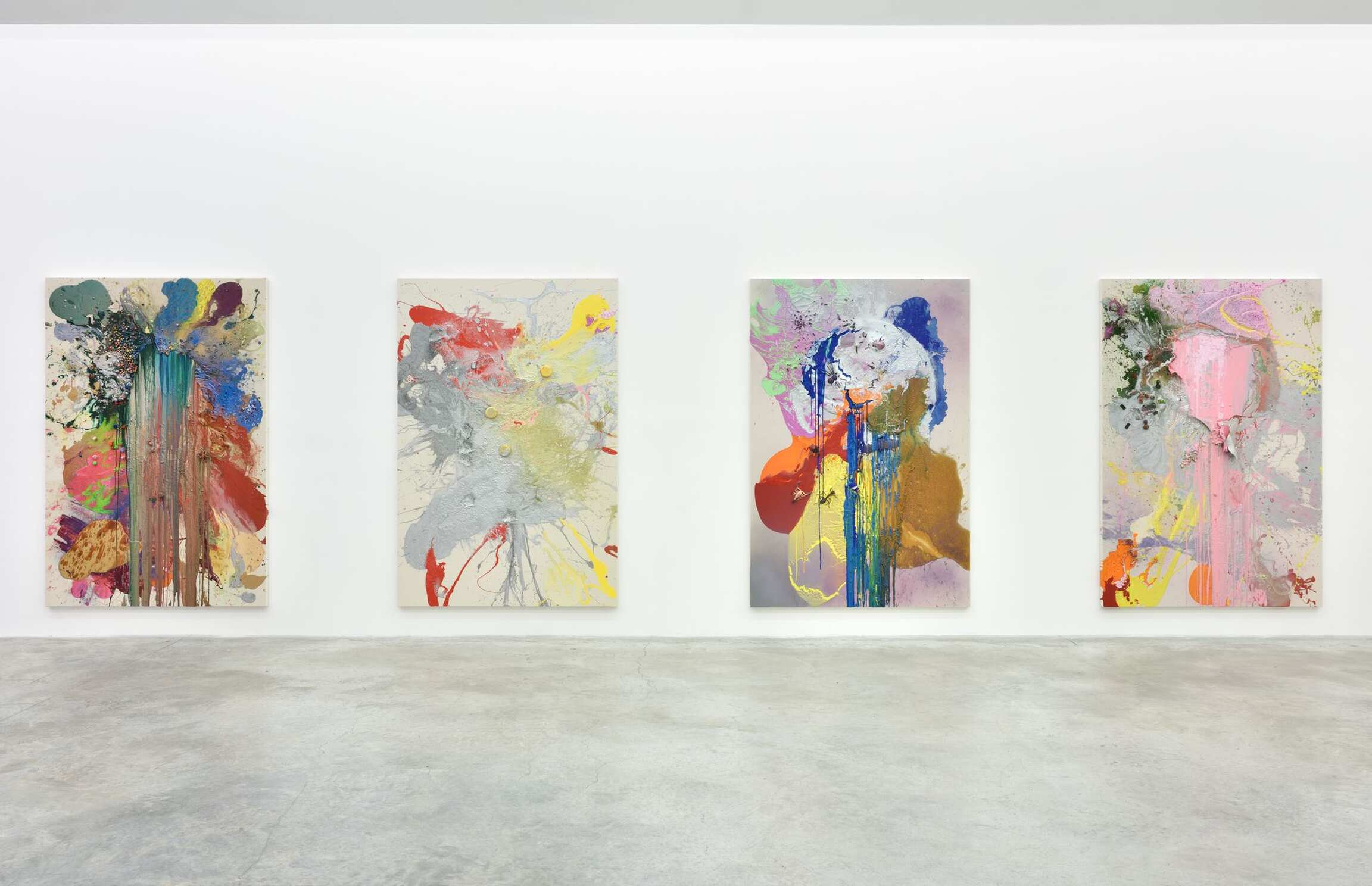 Réalisées par déversement de matériaux hétérogènes à même la toile (peinture acrylique, vernis, liquides pour surfaces extérieures, mais également poudres, confettis, paillettes et petits objets décoratifs), ces peintures s’élaborent selon un mode doublement aléatoire : leur dépôt sur la surface à peindre n’est pas contrôlé par un geste de maîtrise artistique et leur mélange provoque un changement chimique de leurs propriétés originelles, tant sur le plan chromatique que physique. A cela s’ajoute que l’application des substances de la peinture est réalisée à plat (contrairement aux « Pour Paintings » ou « peintures de coulées », dont les premiers exemples remontent aux années 1970) et que la verticalisation du résultat, une fois les couches formées, modifie encore profondément l’aspect du tableau. Ainsi, se dessinent de nouveaux plissés, se forment des rigoles irisées et surgissent d’une couche précédemment recouverte d’improbables vagues chromatiques, quand n’éclatent pas des