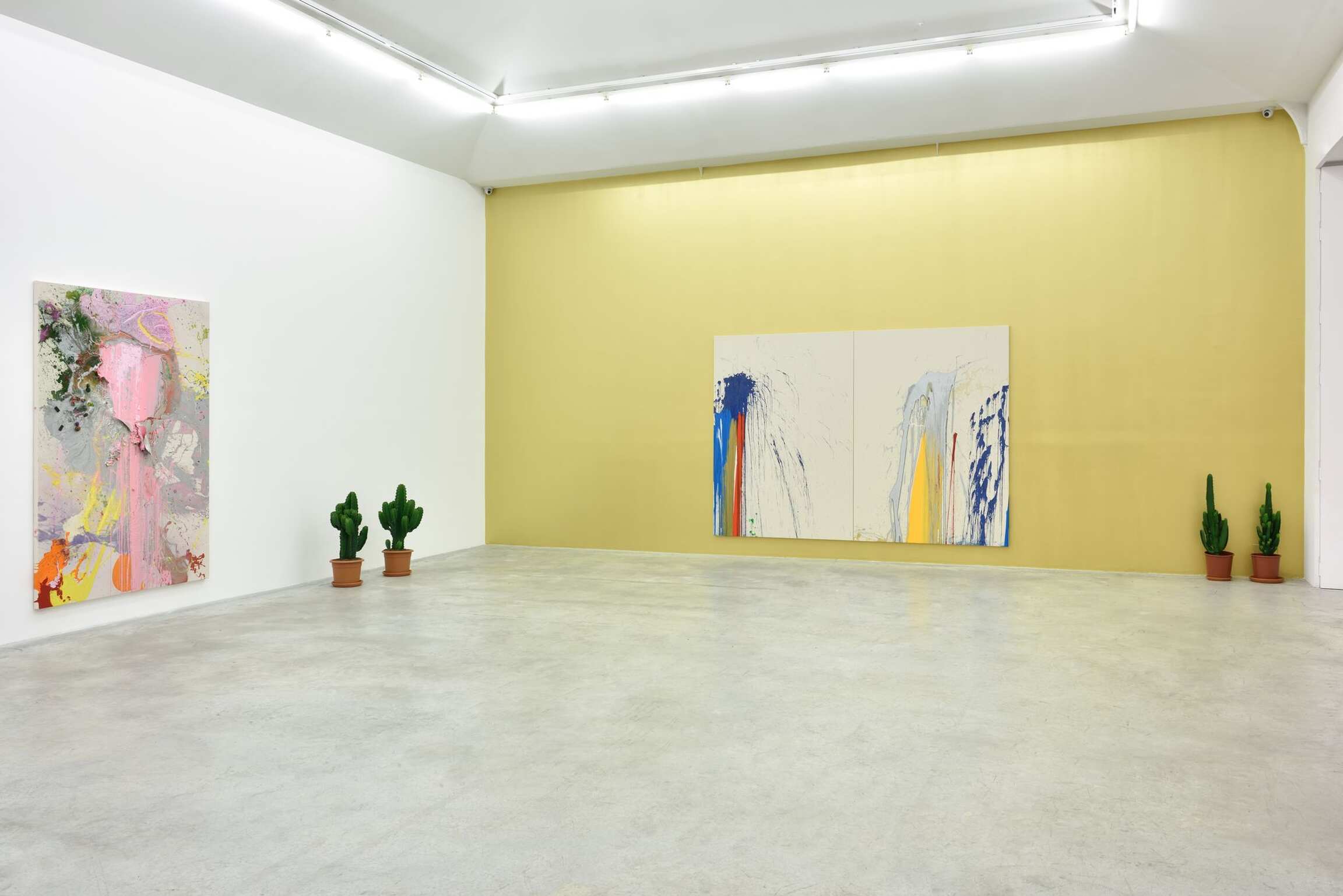 Parmi les œuvres présentées dans l’exposition de John M Armleder à la galerie Almine Rech à Paris, au côté de peintures murales de 2018, figure une nouvelle série de « Puddles Paintings » ou « Peintures en flaques ».