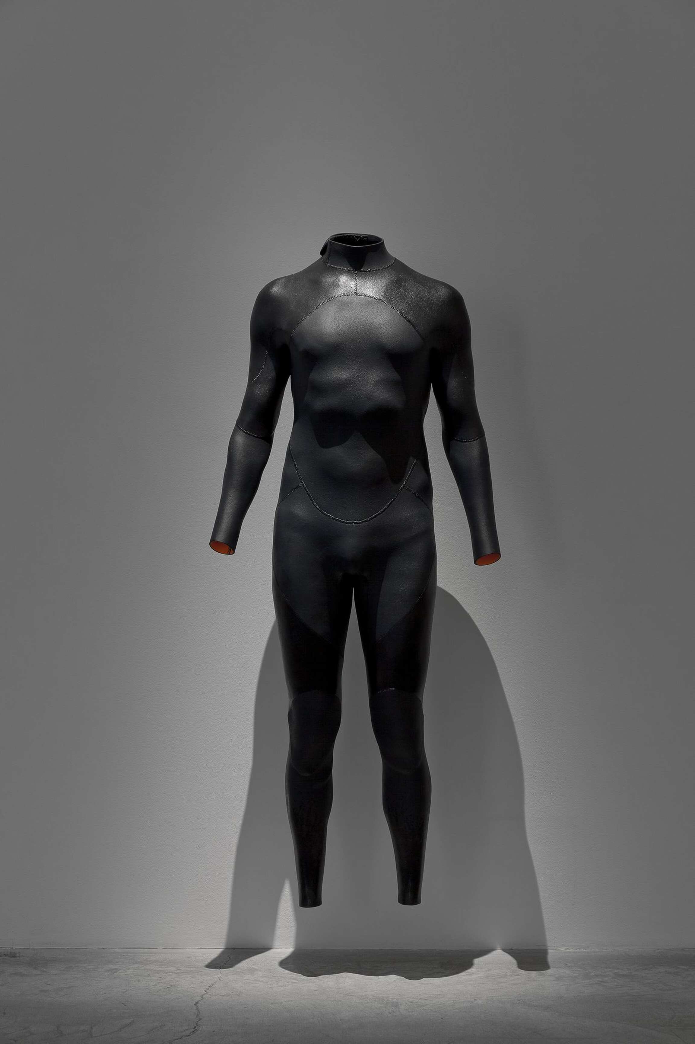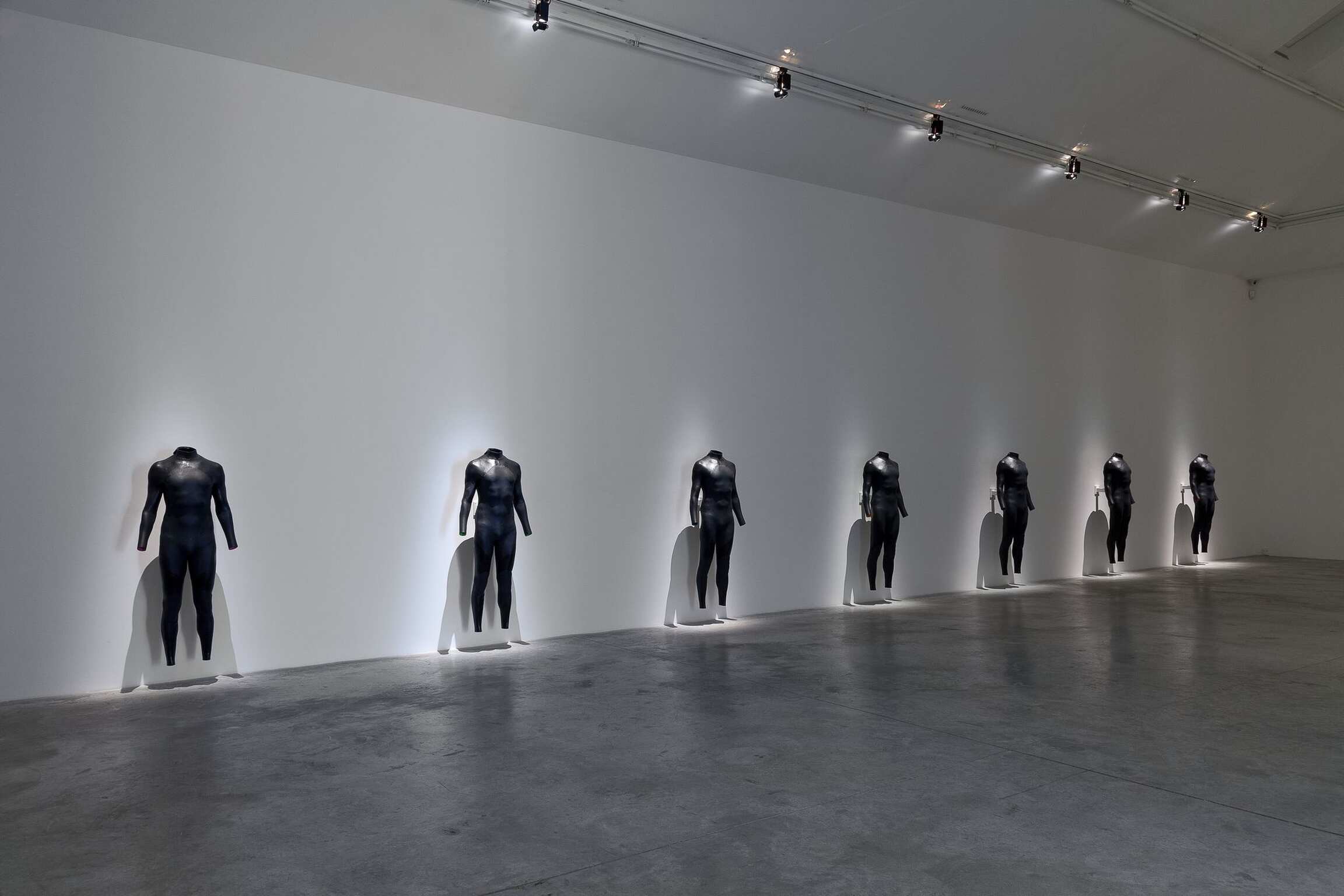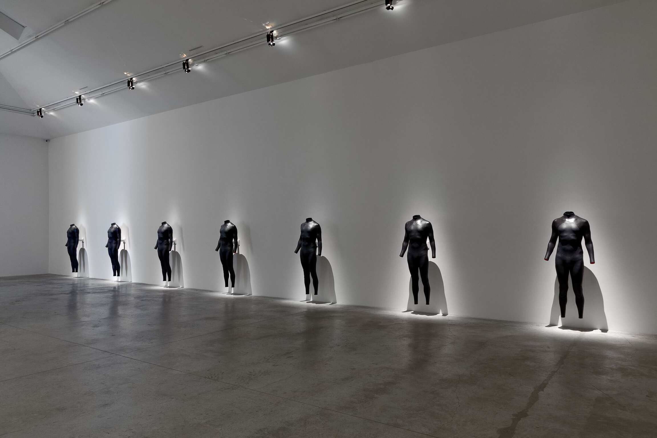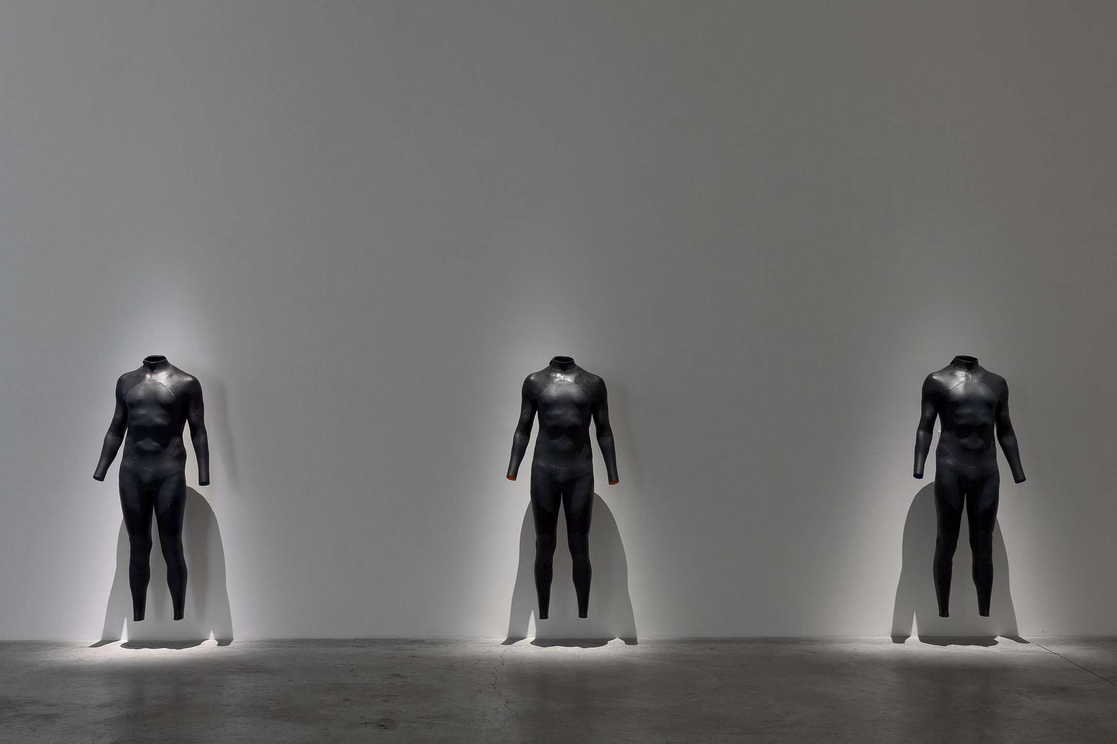Alex Israel a intitulé la monographie qui lui est consacrée et vient d'être publiée « b.1982, Los Angeles » (né en 1982 à Los Angeles). Dans cet intitulé chaque terme est un élément de définition de son œuvre : sa génération et la ville de Los Angeles – assurément deux données déterminantes pour aborder cette œuvre qu'il a aussi conçue comme un portrait permanent. Son portrait (le contour de son visage) a donné lieu à nombre d'œuvres : les plus anciennes reprenaient les gammes colorées de peintures célèbres, les plus récentes s’appuient sur des photographies. Sur un récent Self-Portrait, on voit d'ailleurs sur la jetée à Santa Barbara le pélican qui servit de modèle à celui qui vole dans la première salle de l'exposition à la galerie Almine Rech, sur un autre on voit trois surfeurs, tous jeunes mais chacun d’un âge différent, portant des combinaisons noires. La seconde salle de la galerie présente sept combinaisons (« Wetsuits »), des sculptures inédites réalisées en aluminium peint et intitulées Self-Portrait. Aux premières heures de leur conception, le corps d'Alex Israel fut moulé pour produire la forme qui, aux dernières heures de cette conception, devint cet ensemble de sculptures anthropomorphes qui sont aussi des combinaisons célébrant à leur tour Los Angeles via l'un de ses sports emblématiques. Leur rigidité, l'absence de têtes, de mains et de pieds, évoquent cependant plus la statuaire antique et la manière dont ces reliefs de civilisations disparues se présentent à nous dans les musées.