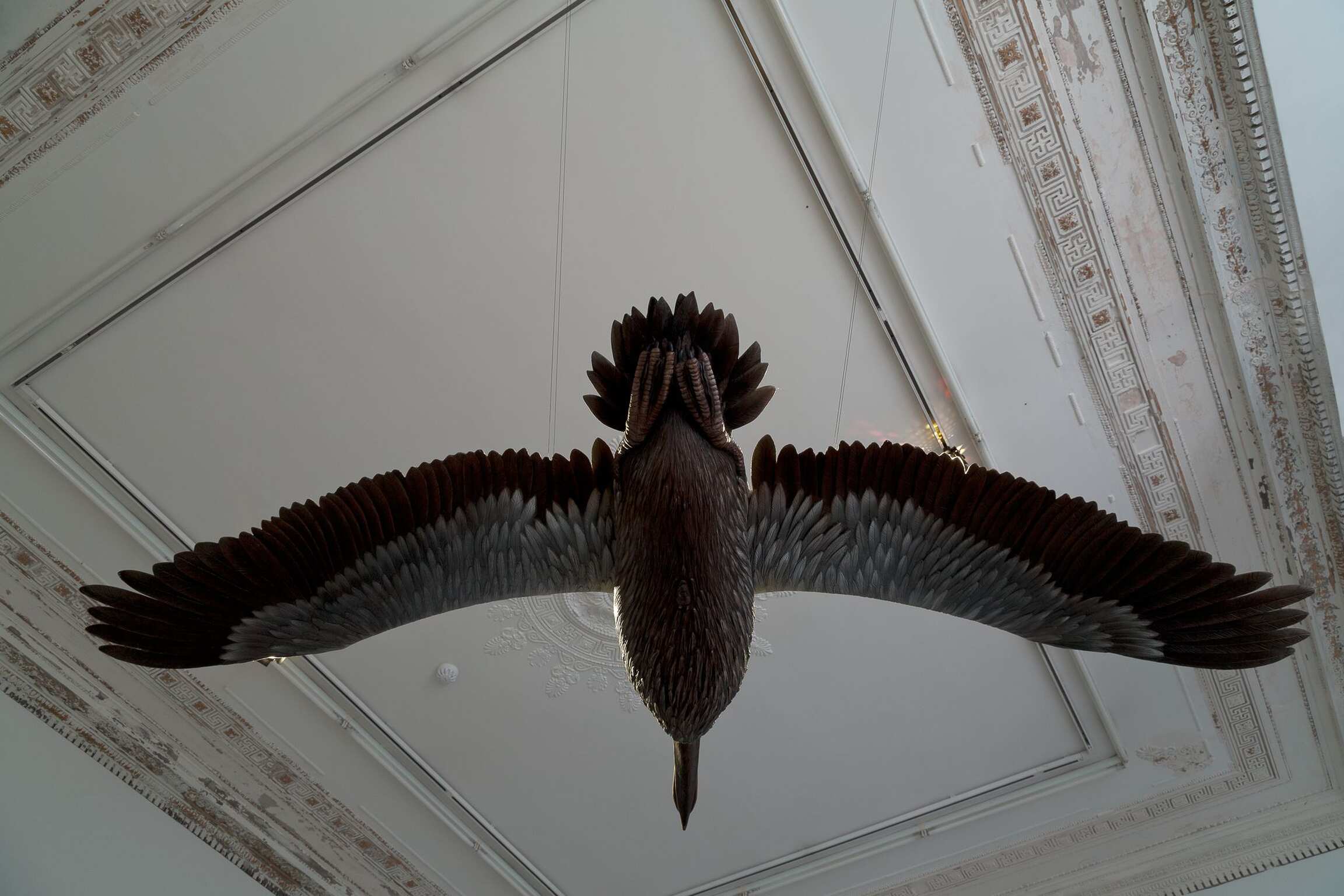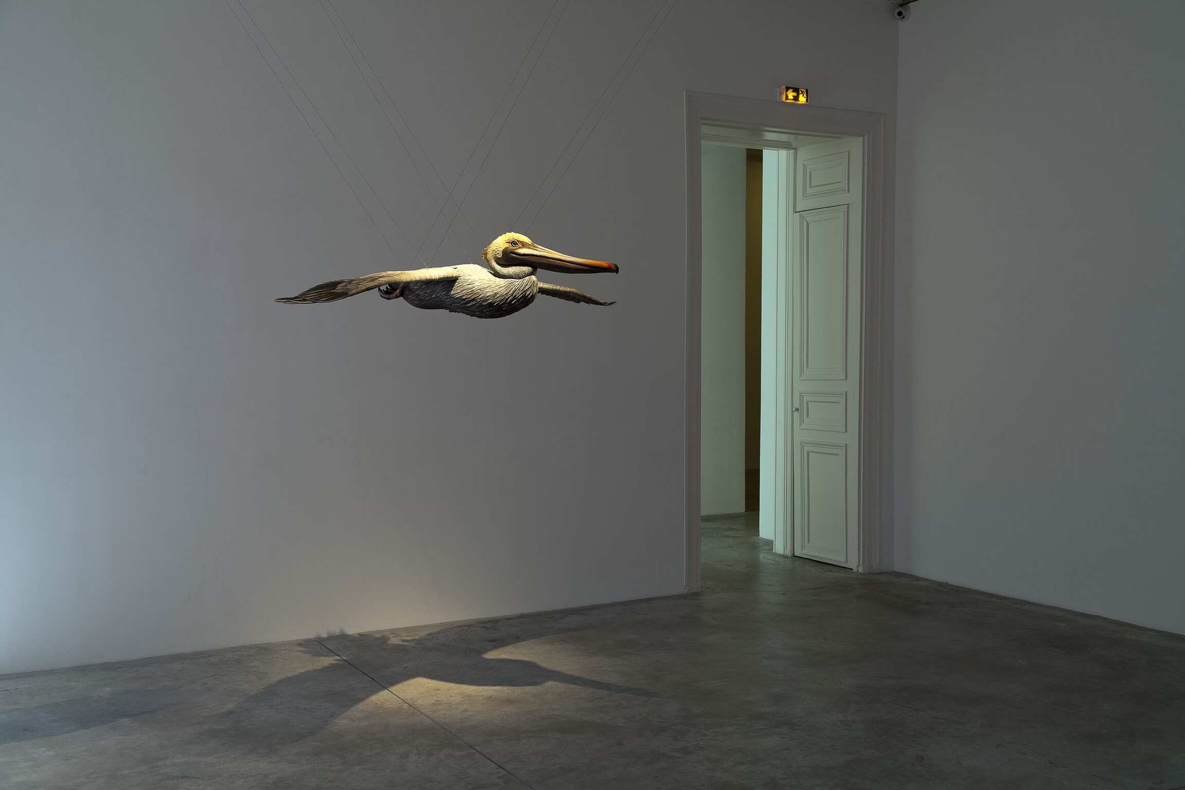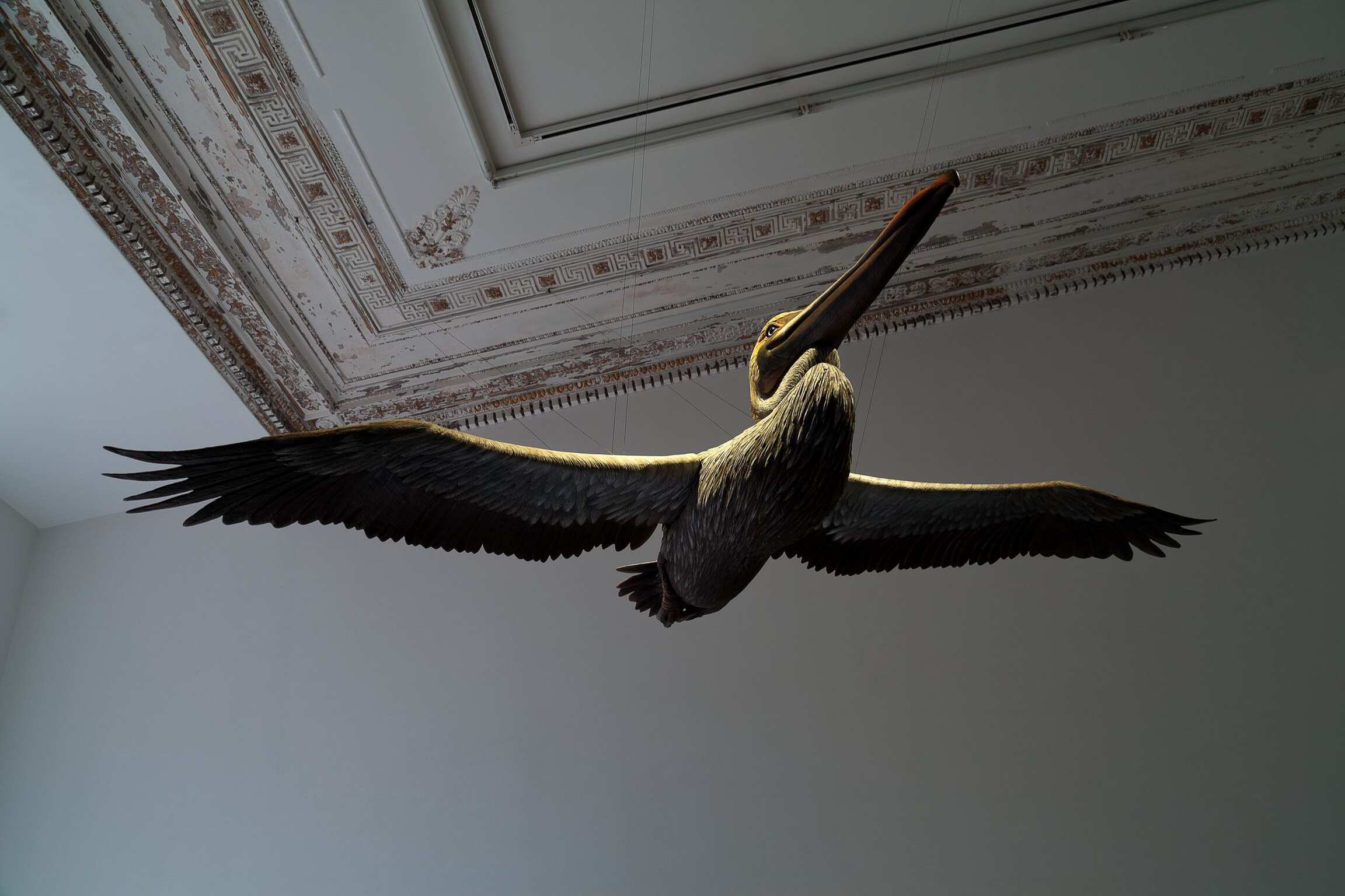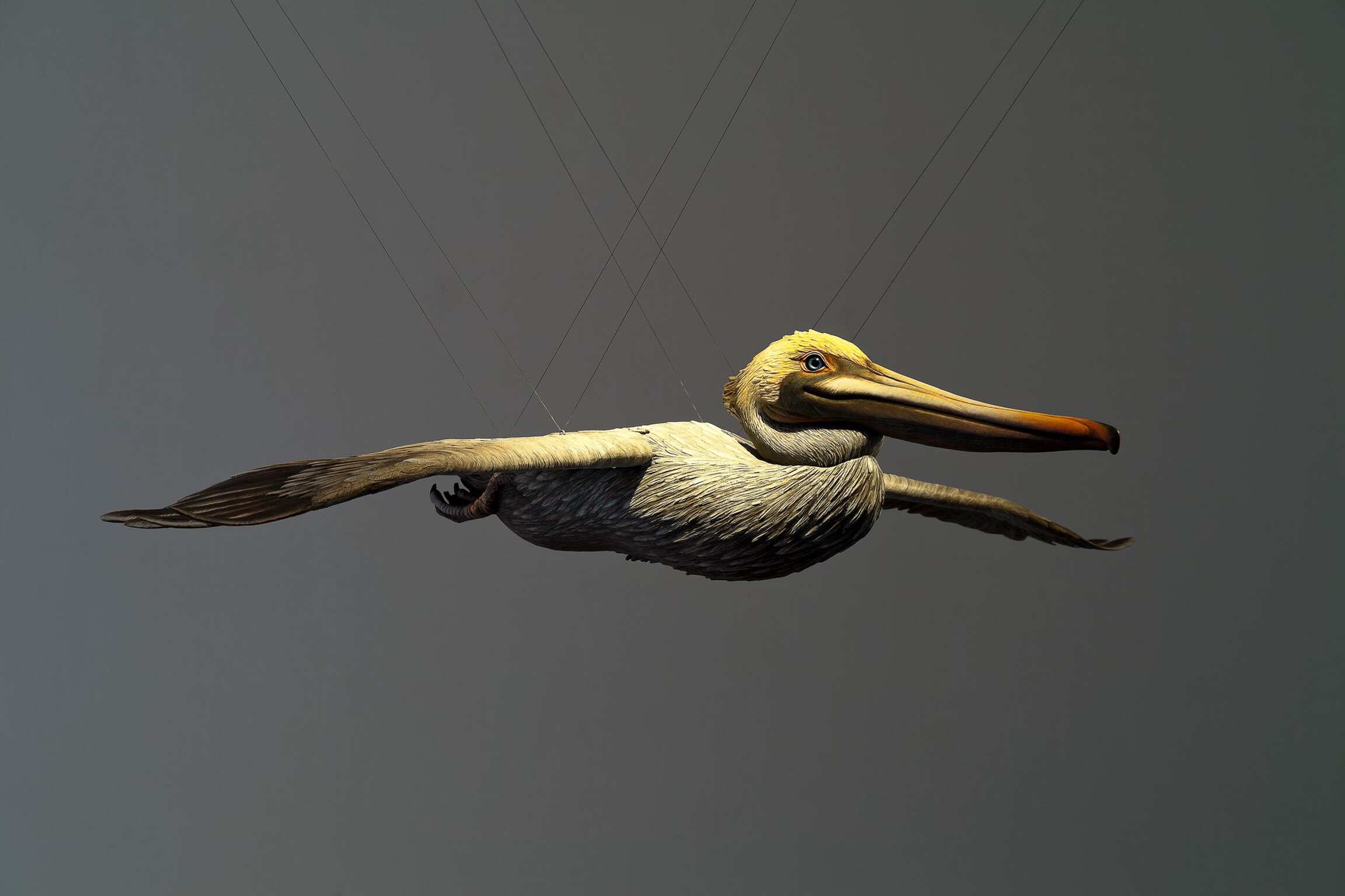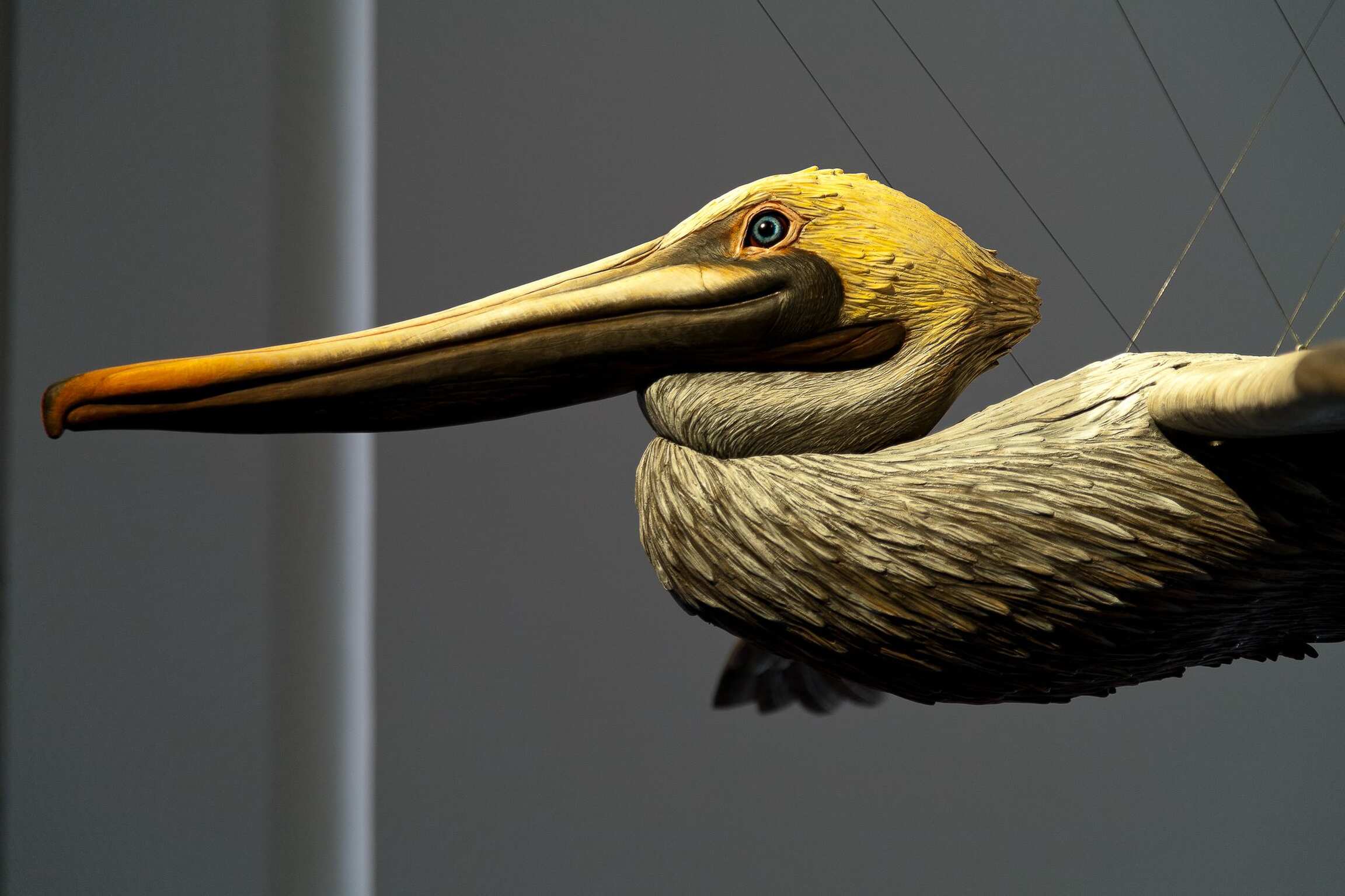When the string is pulled, the bird engages in a gracious and hypnotic movement for about a minute: its eyelids start blinking, and its wings begin to flap. Since the automated sculptures of Jean Tinguely or Takis, the possibilities for animated sculpture have evolved in tandem with the emergence of new technologies. Yet, the blunt reality of such animatronics couldn’t be more opposed to the disarming quietude of our pelican, which offers a kind of commentary on them through its use of a hand-powered spring mechanism. Its resolutely low-tech appearance further brings to mind Georges Braque’s Oiseaux noirs or the simple paper cut-out birds of Henri Matisse. As is the case with all outstanding artworks or exhibitions, the sculpture distinguishes itself through its ability to trigger a multitude of associations, which arise spontaneously like pop-ups on a computer screen, a rich ensemble inviting the mind to go beyond mere comprehension.
