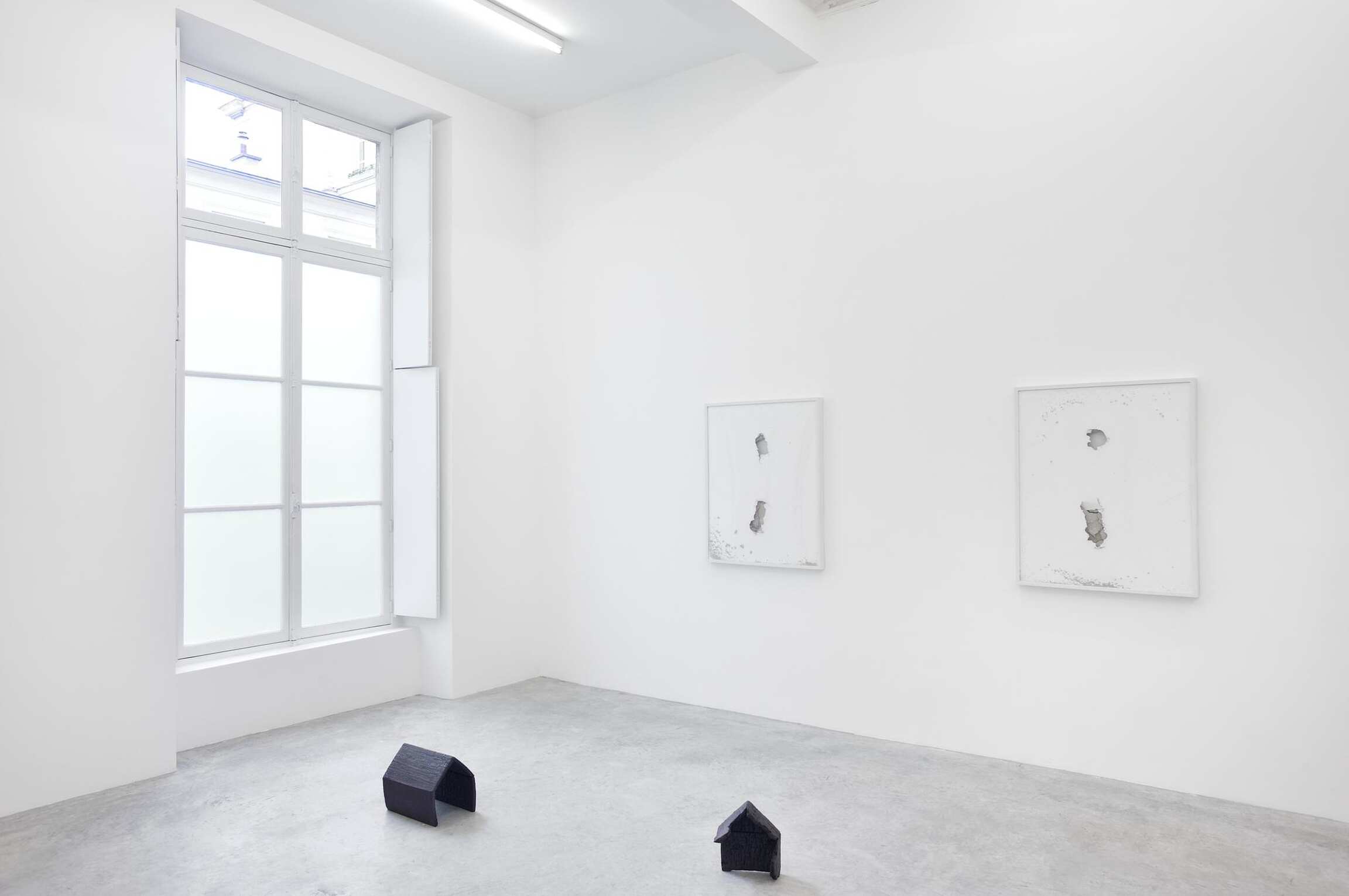 In a similar manner, American sculptor Joel Shapiro presents a series of new miniature sculptures, which despite their modest scale, command an unwavering presence. Sans plinth, his pieces are fixed and spread across the gallery’s floor. In this new series of intimately scaled works, Shapiro first constructs models of houses made of wood, which he then burns and later casts in bronze. His use of scale alludes to an extreme vulnerability, but at the same time conveys an aloof distance. Here, Shapiro revisits the motif of ‘the house’, a theme which first appeared and, in fact, dominated the work of his early career. Emerging in the sixties and seventies, in the wake of Minimalist and Conceptual art, Shapiro developed an iconography that drew upon private memory, but which sought out formal invention. The immediate physical experience of the artist’s sculptures is therefore psychologically charged, imbued with personal associations whilst simultaneously evoking everyday universal forms.