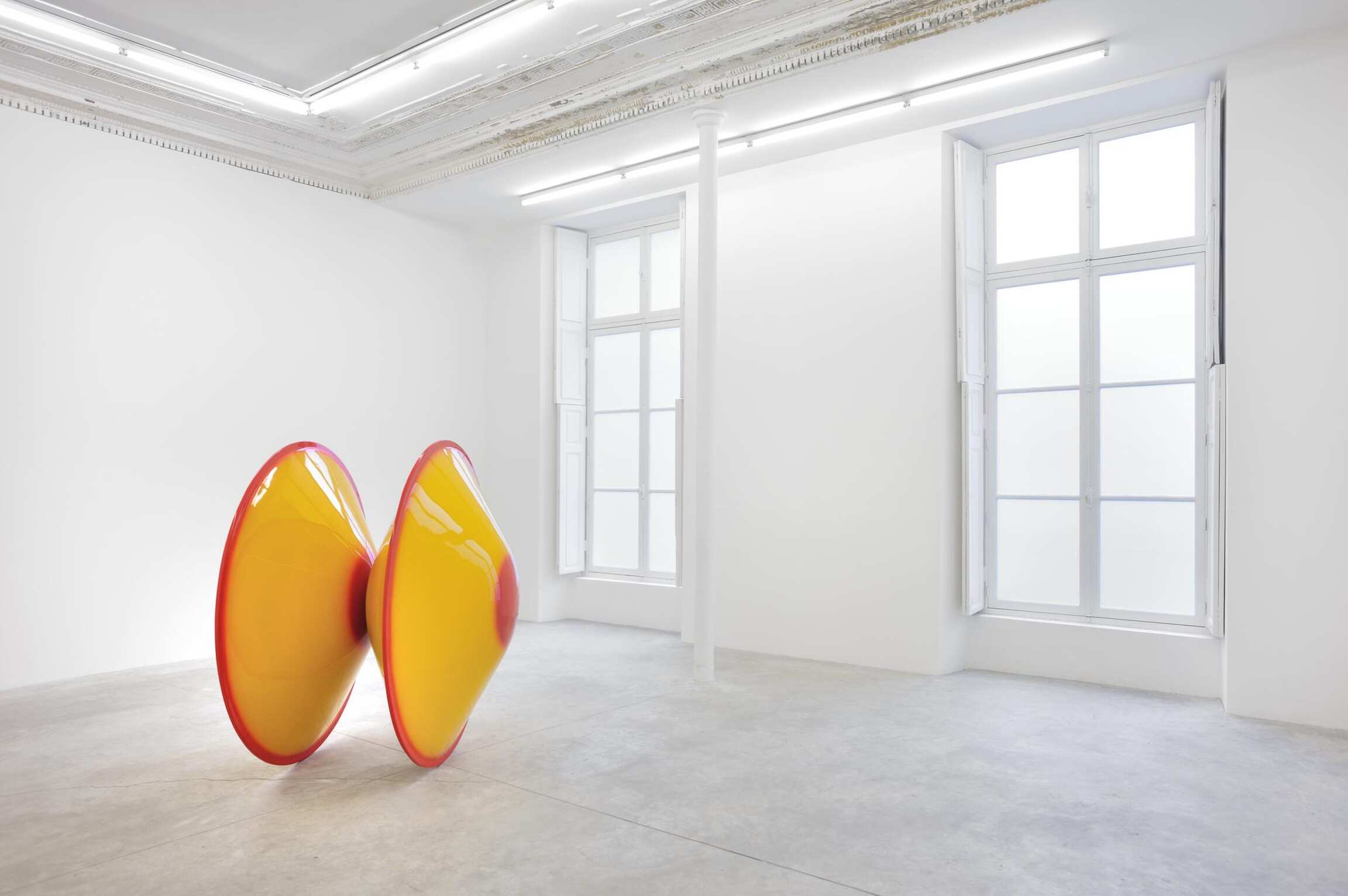 On view in the exhibition are both large-scale and smaller size colored sculptures. They range from simple geometrical forms, such as slab columns or solid circles fabricated in cast polyester resin, to brightly spray-painted concave disks made of fiberglass-reinforced plastic. Whichever the format or the color, the artworks, with their smooth, highly-polished translucent surfaces explore the material’s ability to carry and reflect light. Valentine is concerned with the transparent and diffractive qualities of spectral color, whose prismatic break-up effects become evident to the viewer with fluctuating light conditions.