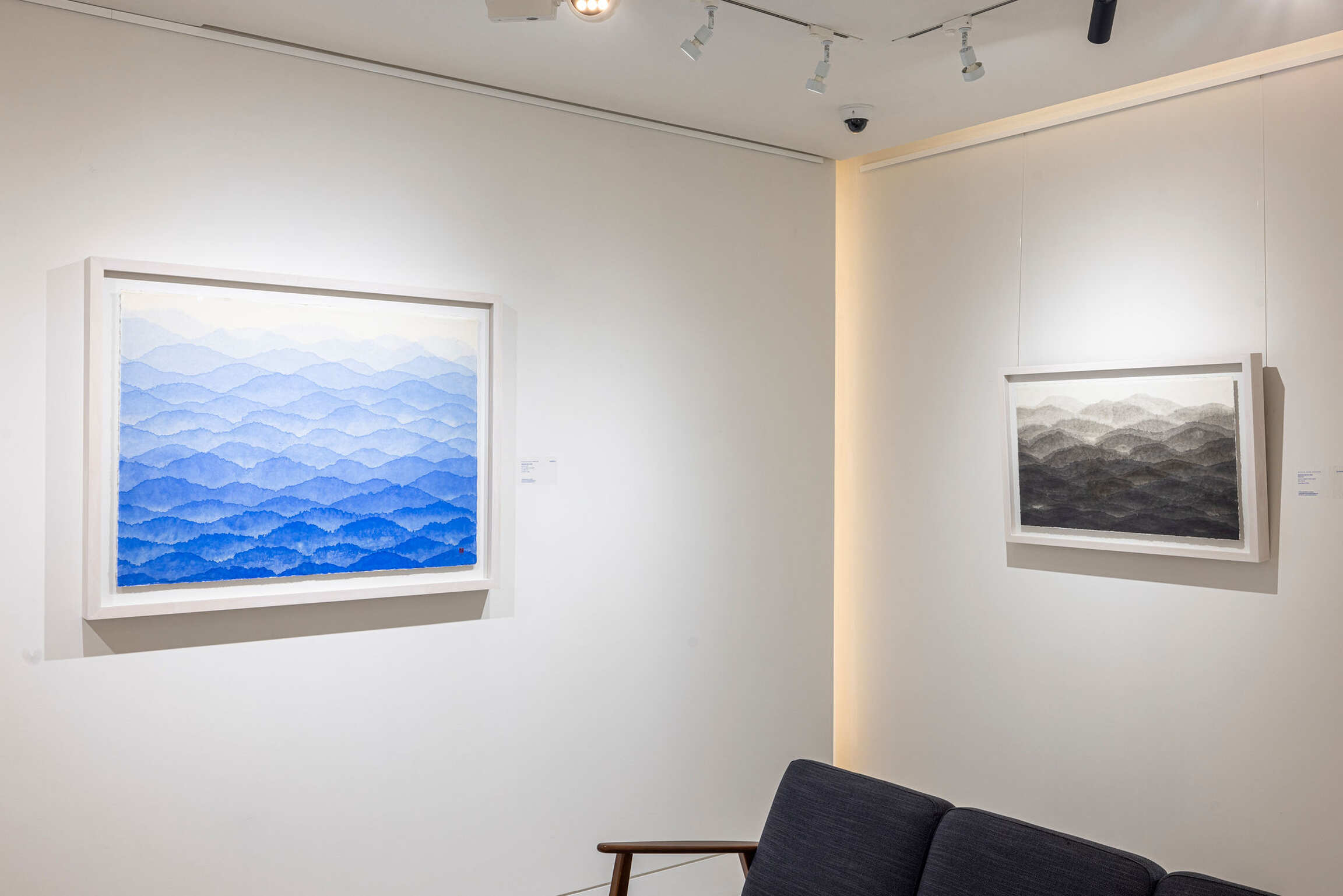 The Street series is composed of pieces of coloured paper, diced and cut, then delicately burnt on the edges of the paper stripes in a controlled and contemplative manner. The repetitive and meditative process of creating the work is imbued in the final result. The Mountain series was originally inspired by the sound of tides, and is composed of horizontal layers of watercolour or ink that simultaneously resembles undulating waves and distant forested mountains.
