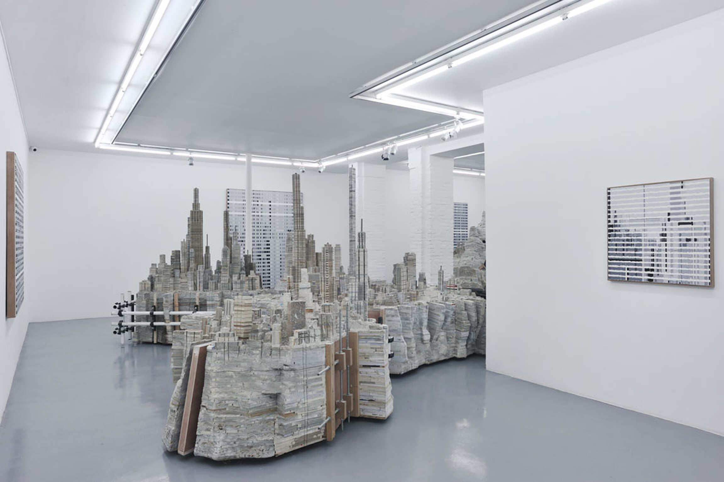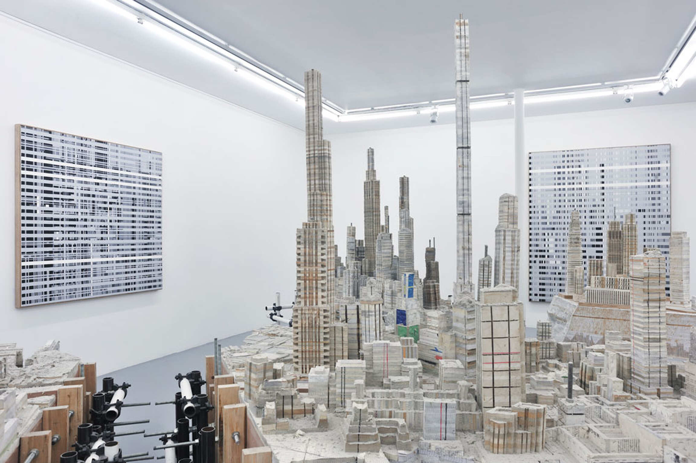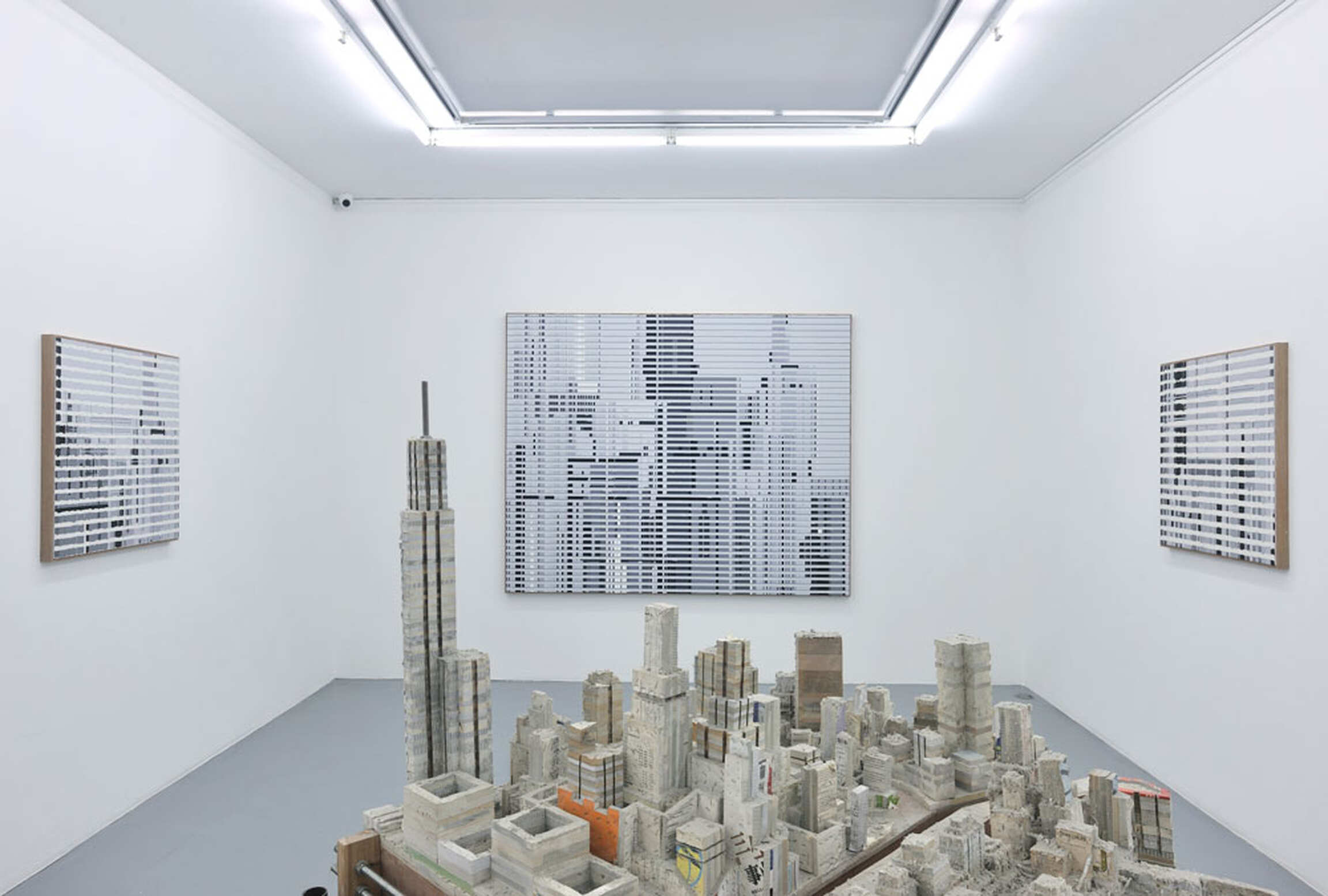The installations, paintings and videos of Liu Wei, the artist spearheading the new Chinese art scene, constantly oscillate between order and disorder. Through his work, Liu Wei translates the chaos of his native city, a city that is in a permanent state of development and which keeps reinventing itself to fill the exponential needs of its hyper-productivity. Made out of schoolbooks, his at times sprawling installations waver between utopia and dystopia. They depict cities in a state of metamorphosis, home to a range of iconic buildings, from the Pentagon to Saint Peter’s Basilica, among others. Liu Wei refuses the ruling principle of an identifiable style and conventional aesthetic criteria. His work is an attempt to perpetuate the precepts of a country with a Confucian tradition, as can be seen in the series of paintings Purple Air (2005-2011) and Meditation (2009-). At first sight, the works in Purple Air resemble a reflection on the typically Western notion of a univocal, horizontal landscape. Besides being a homage to Richter, the series conveys above all the fragmented vision of a polluted and gridded city, somewhere between a kaleidoscope, a TV test card and a bar code, a vision which brings to light more or less perceptible worlds. The paintings in the Meditation series, on the other hand, revert to a horizontal vision of the world. Consisting of broad-brush strokes, these canvases, depicting both the break of day and night itself, reflect the growing distance between Liu Wei and an urban architecture that is both alienating and stimulating. Above all, these canvases evoke the notion of perspective in the pictorial field and the manner in which the artist positions himself in relation to his own artistic practice.