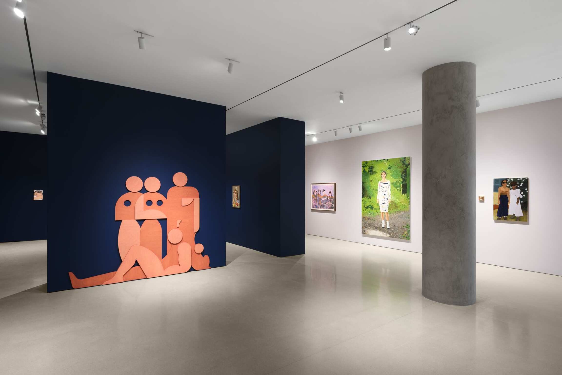 Playing with family tropes through idealized ancient Greek- and cubist-inspired human forms, Ruby Sky Stiler’s wood cut-out Rose Bathers, 2021, portrays a highly stylized family unit, wherein each member fits perfectly in their place. Bernadette Despujols’s mi hermana y sus hijas en Febrero (My Sister and Her Daughters in February), 2023, presents a multigenerational and matriarchal Venezuelan family crowded onto a sofa where the past, present, and future meld together. Patricia Cronin’s Memorial to a Marriage, modeled 2002, cast 2015, was created at a time when same-sex marriage was illegal in the U.S. Depicting Cronin and her partner, fellow artist Deborah Kass, lying in bed, embraced in each other's arms, Memorial to a Marriage is equal parts a protest, a love letter, and a headstone for their burial plot in Woodlawn Cemetery. From the artist’s acclaimed The Notion of Family series, 2001-14, LaToya Ruby Frazier’s Me and Mom’s Boyfriend Mr. Art, 2005, comprises a double portrait illustrating the complexities of adult parent-child relationships. Motherhood and maternal bonds are explored in works by D’Angelo Lovell Williams, whose pigment print Until We Separate (Mom), 2019, wherein the artist’s head cradled in his mother’s lap; Alessandro Teoldi’s Fili and Mom, 2022, in which a momentary embrace is rendered permanent in cast concrete; Srijon Chowdhury’s Successionist-style portrait of his expecting wife With Child, 2020, and John Currin’s new portrait of his wife, artist Rachel Feinstein, a constant muse of his over the course of their nearly three-decade relationship.