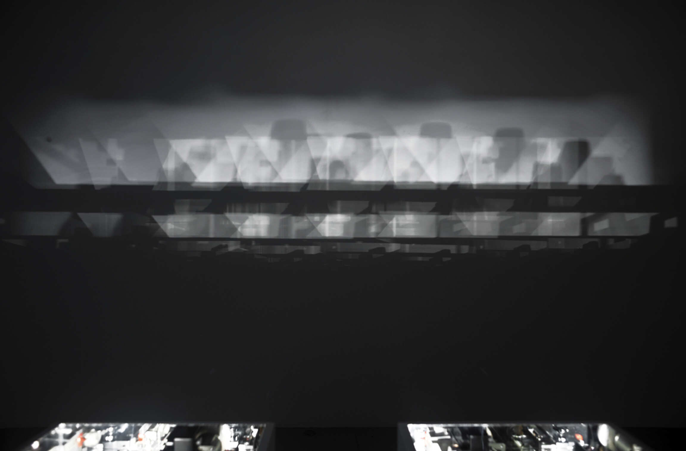 L’intérieur de chacune de ces colonnes, est tapissé de miroirs et renferme un projecteur super 8 tournant à vide, dont l’image et l’éclat lumineux se reflètent à l’infini sur les parois. Ce dispositif simple, joue simultanément sur les reflets décuplés de la machine, sur les vibrations lumineuses et le bruit du moteur. De ces pièces l’artiste dit aimer le paradoxe : l’apparente froideur extérieure qui contraste avec ce que le spectateur peut découvrir en s’approchant de la colonne, ce projecteur vu ici comme une machine mise à nu, mais une machine à rêver, à fabriquer des images ou à construire du sens.