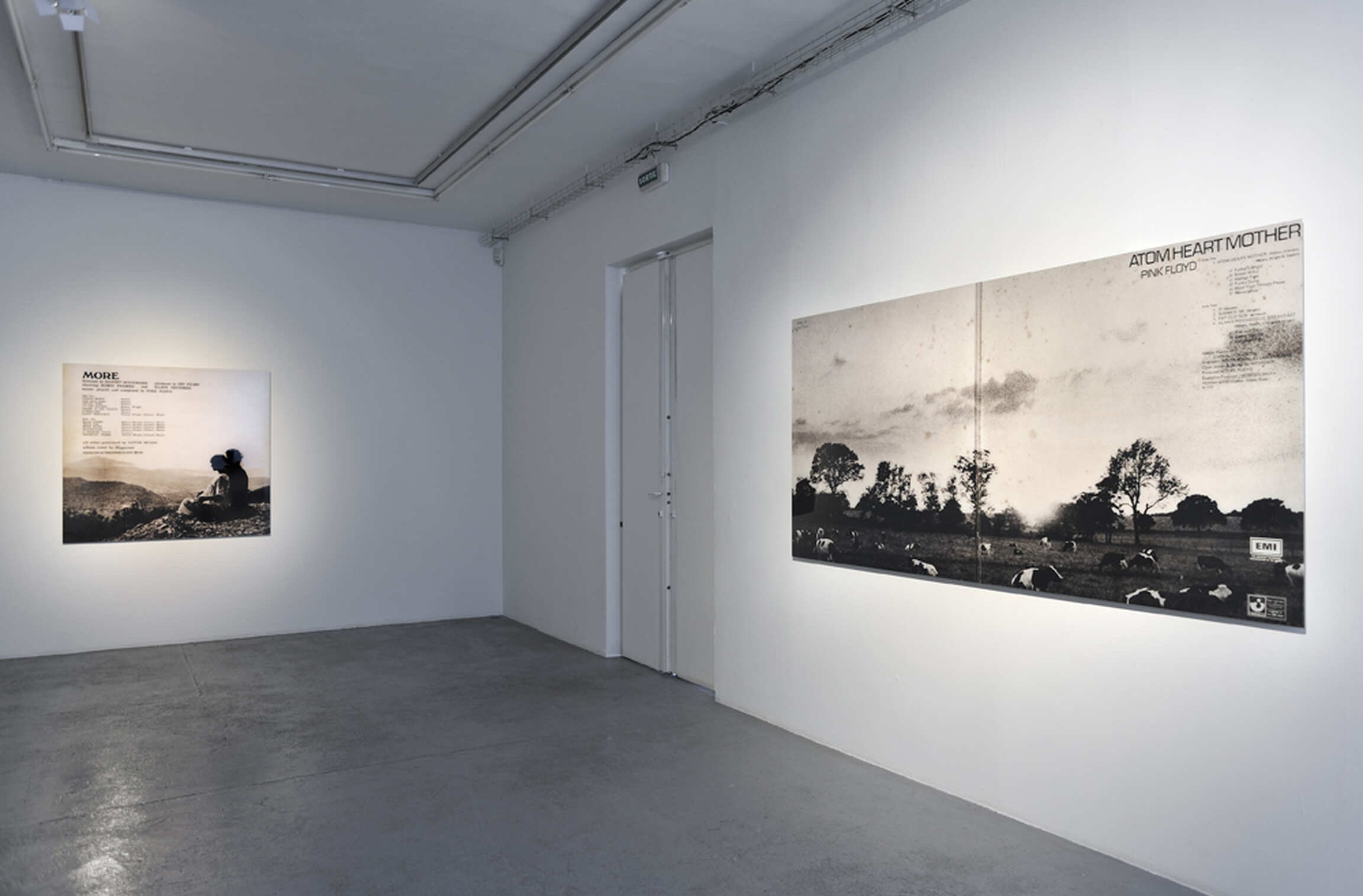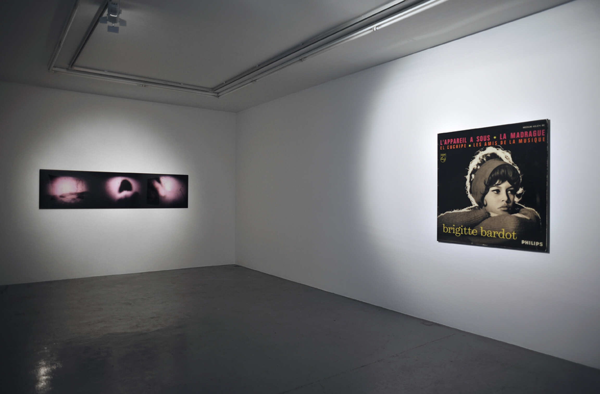 De même il a choisi de présenter des tirages photographiques d’après des pochettes de disque lui appartenant, images liées à des moments de sa propre histoire. Enfin un grand tirage noir et blanc rassemblant trois film stills tirés de ses propres films et présenté dans la pénombre est éclairé par le faisceau d’un projecteur super 8. Bruit de moteur, image palpitante et fugitive, fragilité du dispositif…