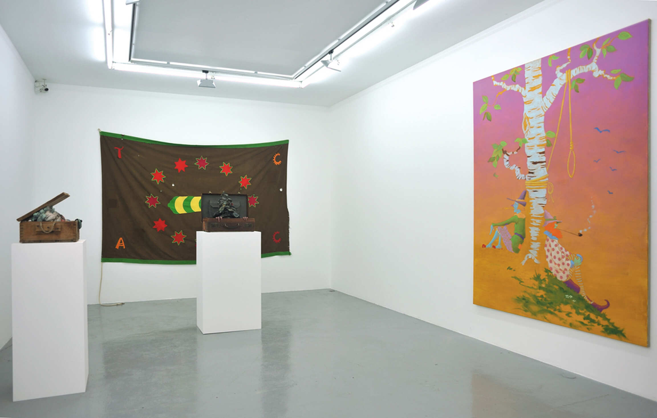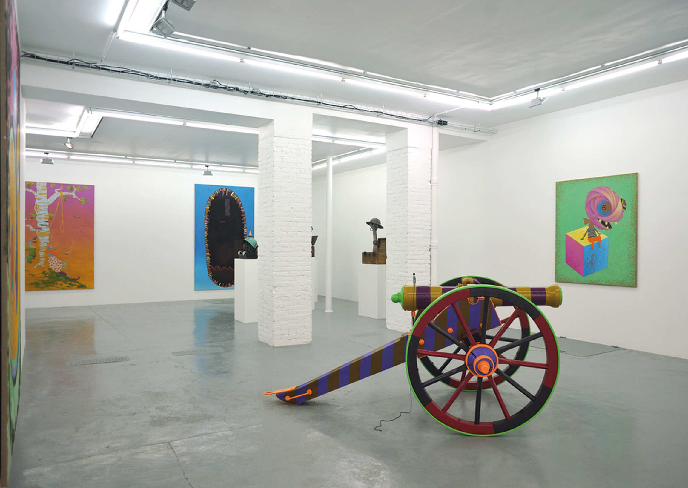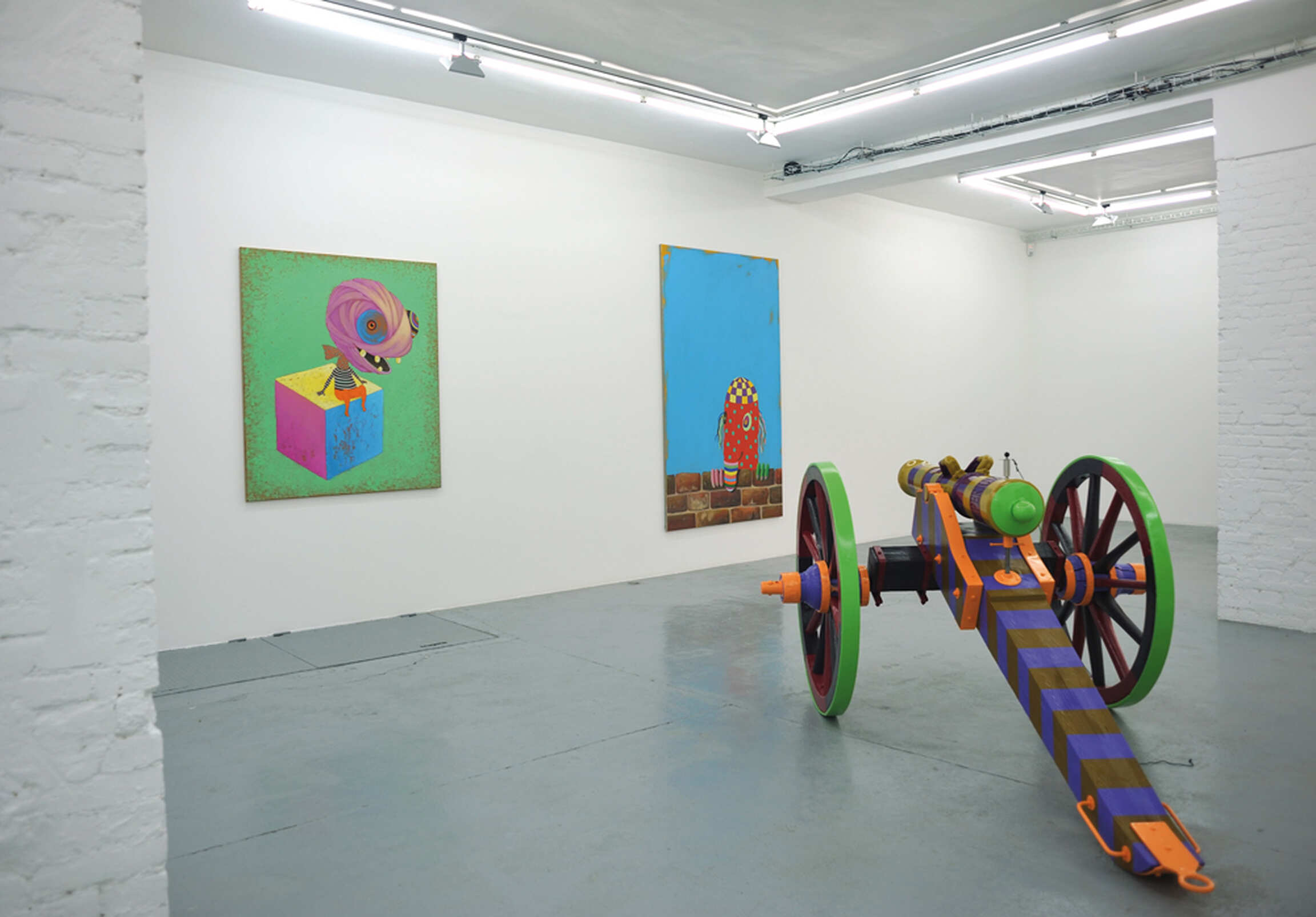 In “LÉGION TROUBLÉE”, what previously seemed to be innocent, foolish dolts now turn out to be a wildly assembled, fundamentally diverging, unpredictable military mass, commanded by something from above that lies in the unconscious. Whether this is fate or an imaginary, probably crazed commander, the fact that these beings are not in control of their own actions is particularly unsettling in the context of the military, invasion and forceful seizure of power that Henneken creates through his visual punctuation (canons, flags, helmets, etc.).