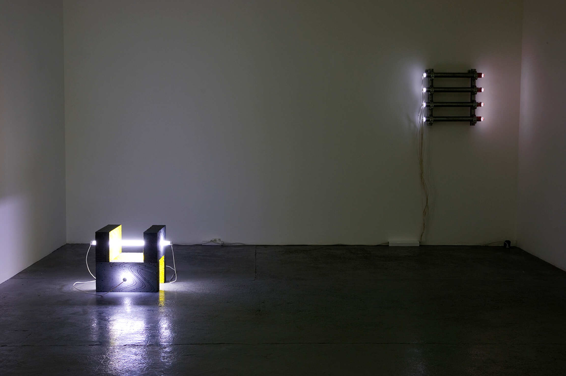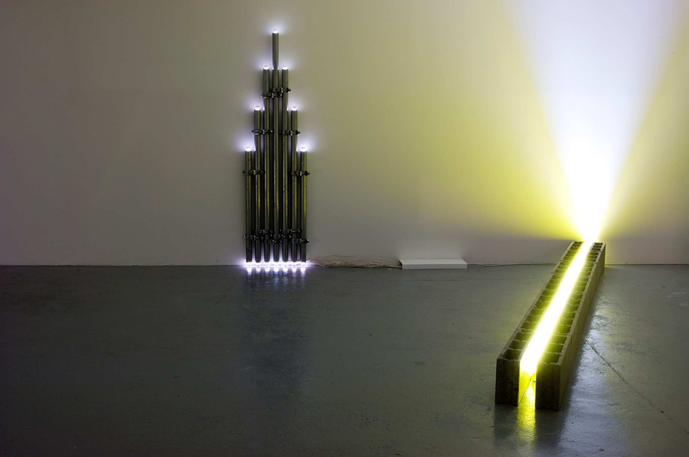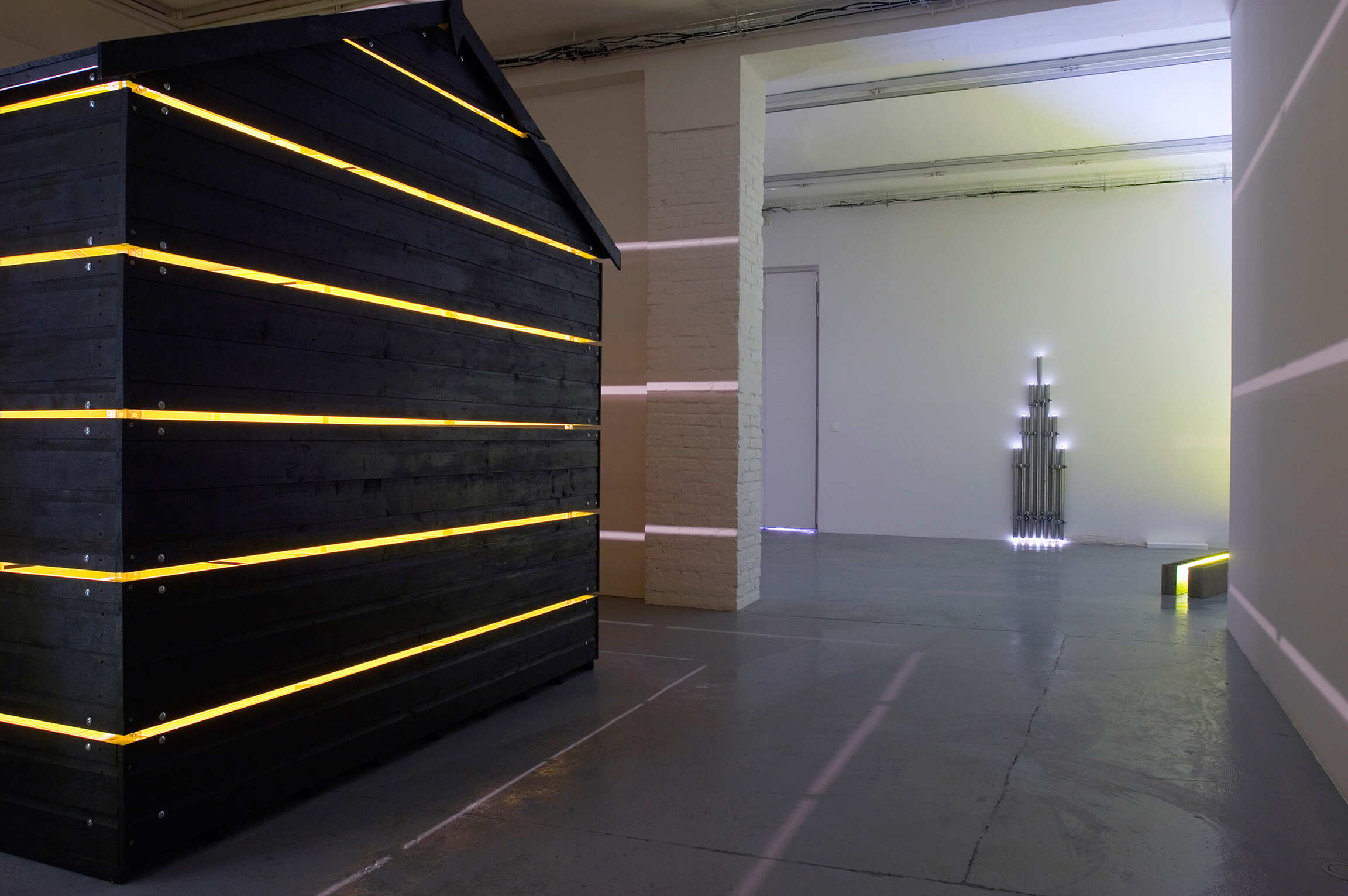 Central to Rackowe’s body of new works is the large-scale piece Black Shed (2008), a readymade garden shed cut into a series of horizontal slices. Each slice is articulated by a shaft of light emitted from the interior of the structure. The piercing intensity of this cast-out light is amplified by the acid yellow colour saturation of the interior space. Drawing on previous strands of work the piece WLP7 (2008) consists of two wall mounted doors hung against each other. Two unseen light sources cross fade between and behind the layered doors, creating a shifting optical outcome that moves between a coloured and a stark white light. Also shown is the work SP3 (For V Tatlin) (2008), a wall-based piece constructed from vertical lengths of scaffold. Configured according to Dan Flavin’s…