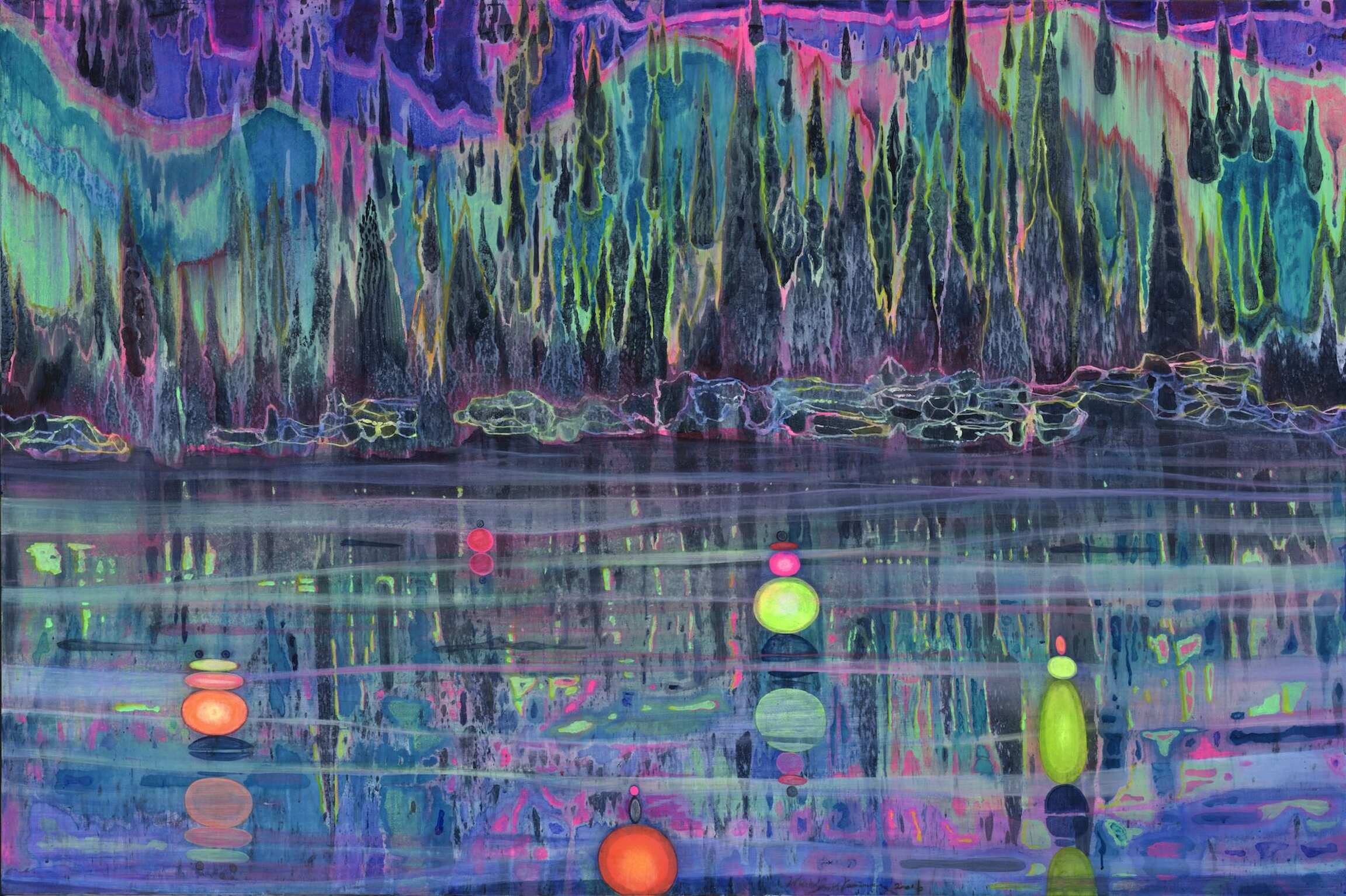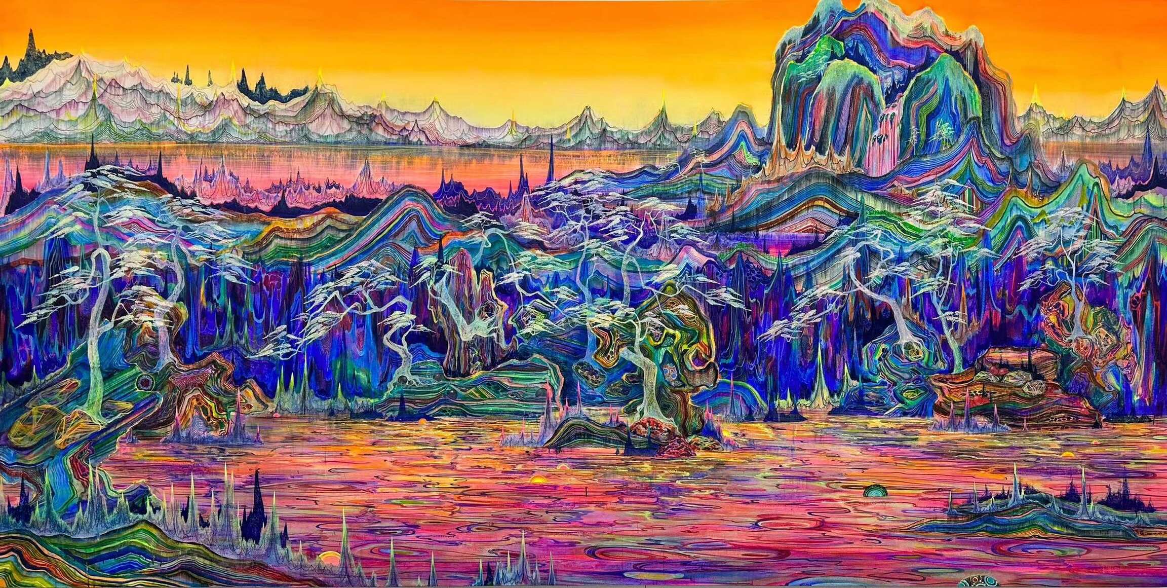 About ten years later, a new ‘fluorescence’ series emerged ‘suddenly’. Metamorphosed landscapes, mountains and rivers replaced exaggerated bodies and portraits, shifting to a vibrant, variegated and mesmerising motif and style, away from the gloom and dreariness of the past. Seemingly a disconnection, it is, in fact, still his scrutiny and expression of self: “Under the vault of heaven, you and I are just beings.” Needless to say, religiousness and spirituality comprise a hidden clue of expression in Huang’s painting practice. In light of this, we have included nearly 30 masterpieces from each period of his painting career over the past 30 years, as well as dozens of works on paper and some documentation from the archives, discounting the chronological order and reorganising them according to the five themes of ‘Lights’, ‘Rivers and Mountains’, ‘Islands’, ‘Revelries’, and ‘Worlds’ to unfold his perception, imagination and introspection in a more comprehensive and dynamic manner.