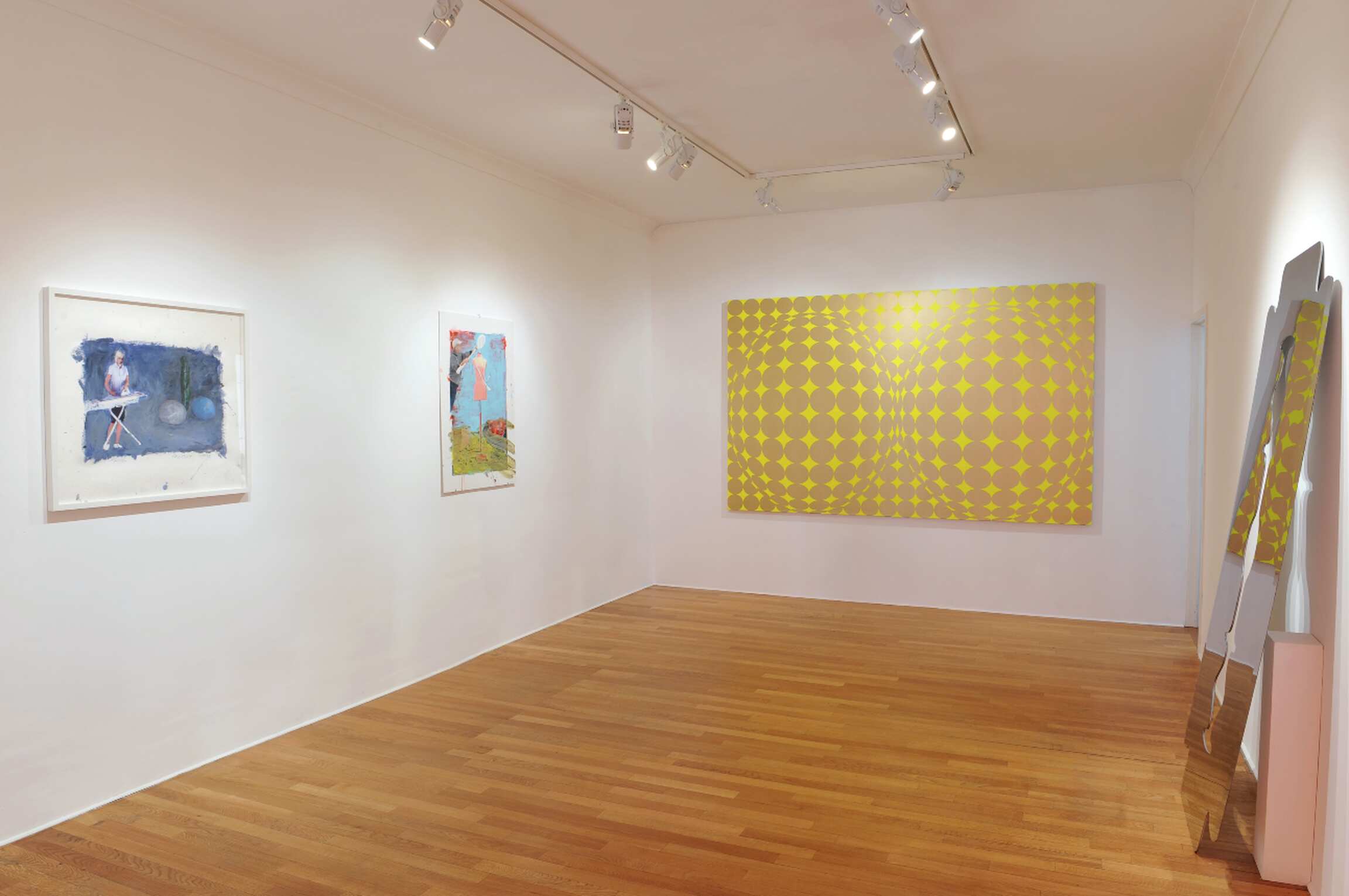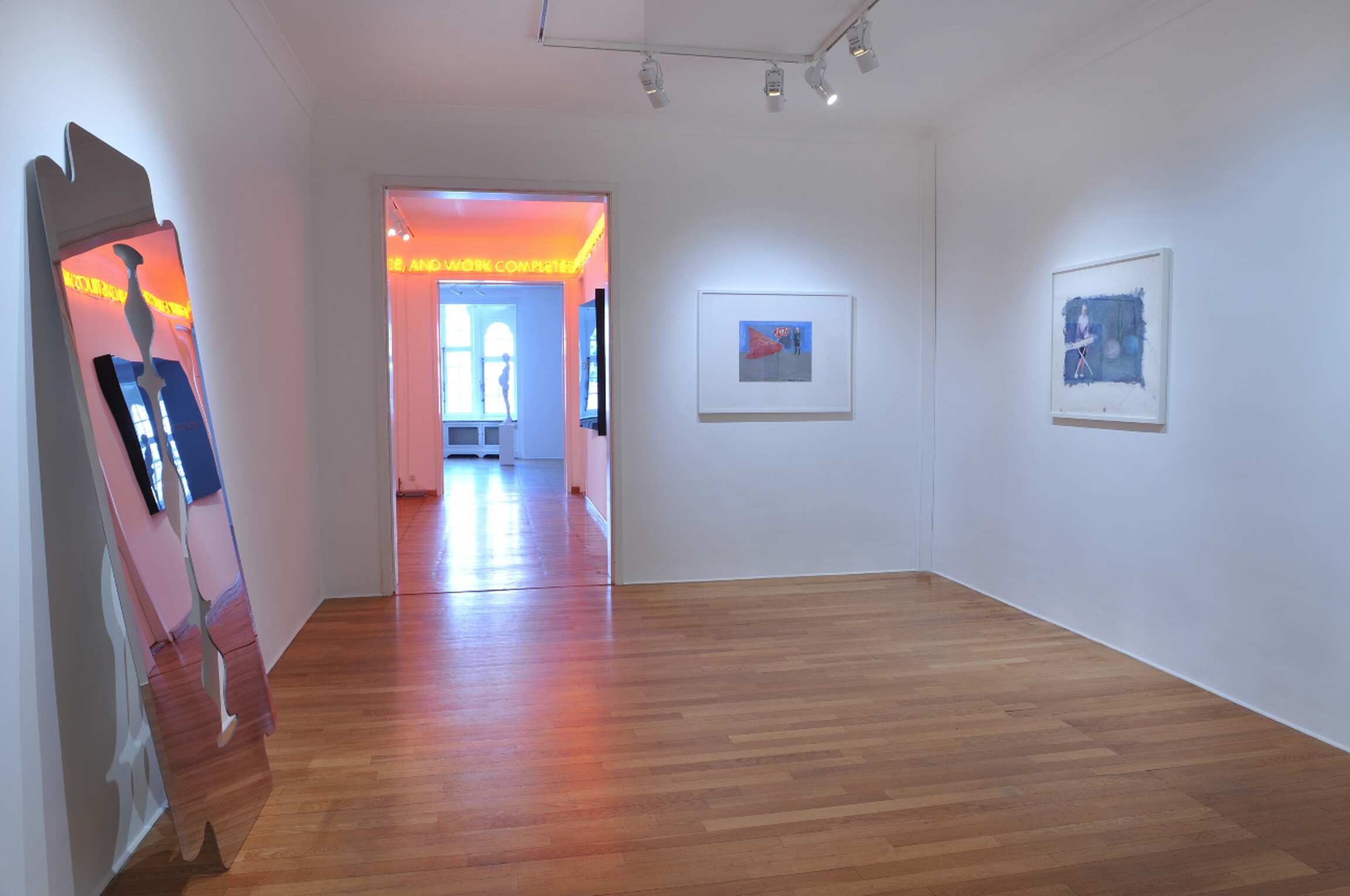 Don Brown will show two white sculptures entitled Yoko XXVI and Yoko XXVII. His wife is his model, the medium, the muse – to use a romantic term – that allows him to employ the timeless topic of the female nude. His sculpture is essential, rejecting the anecdotal. Don Brown does radical work, and in gazing at his work a clearly contemporary vision appears. Looking to express what «beauty» can be, he succeeds in melding two spheres, one inside the other: endless and ephemeral – this ephemeral related to «fashion», required, to shoulder the burden of the eternal. Don Brown sculpts and draws, too. Daniel Lergon paints. His studio is a place of solitude, calm and meditation. He experiments with different types of material, seldom painting on the linen or cotton canvas typically used in painting. His work is abstract, tending towards the diagram. He recently made reflective paintings in which the painted part is realized in a transparent lacquer, so that the works become shadows, gleams. A significant work in neon by Joseph Kosuth will be shown, entitled Seeing, Reading, 1979. It is a work that we can automatically read upon seeing it, of which meaning is interactive within the precise moment of looking. From Sylvie Fleury an abstract painting in the spirit of «optical art» will be presented, revisiting this era with the sensuality and glamour proper to the work of the artist.