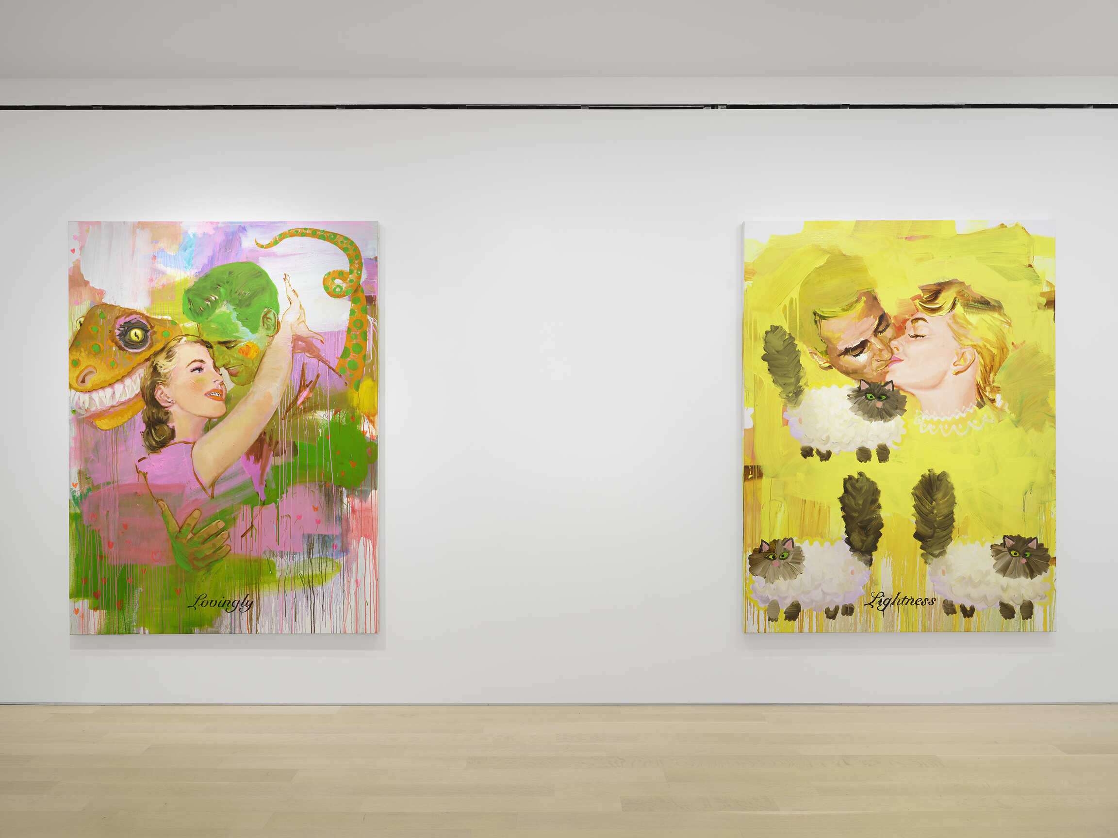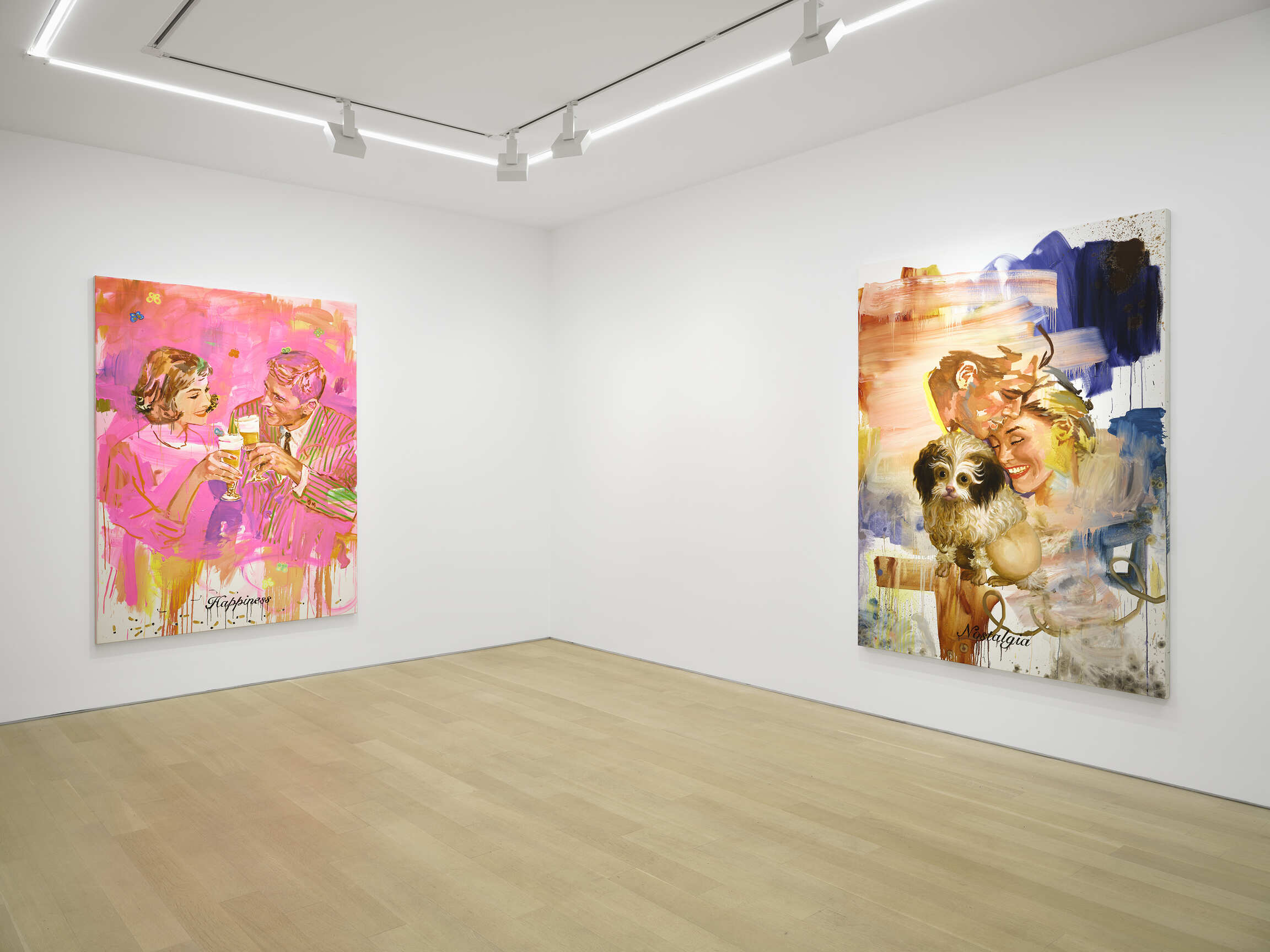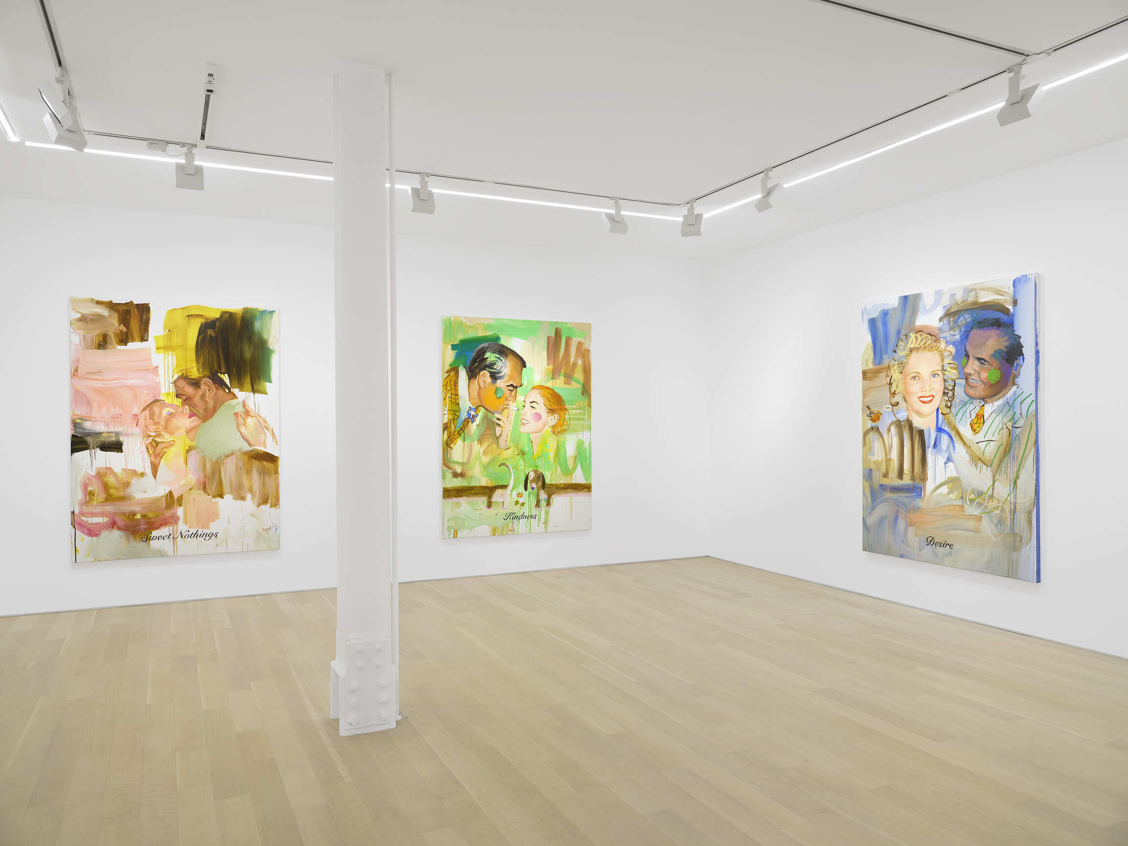 The show receives its namesake from Sentimental Paintings, an ongoing series that the duo revisits and evolves to fit within this current moment in their practice. An amalgamation of painting’s various syntactic elements—abstraction, figuration, and now text, where Sweet Nothings can be read—these paintings discover themselves as they are being made; a process that begins with one element which then responds to and determines the next. Though the iconographic sources trace back to post-war period of the 1950s and 1960s, the overt optimism they elude speaks to the naïve desires society holds closely today.