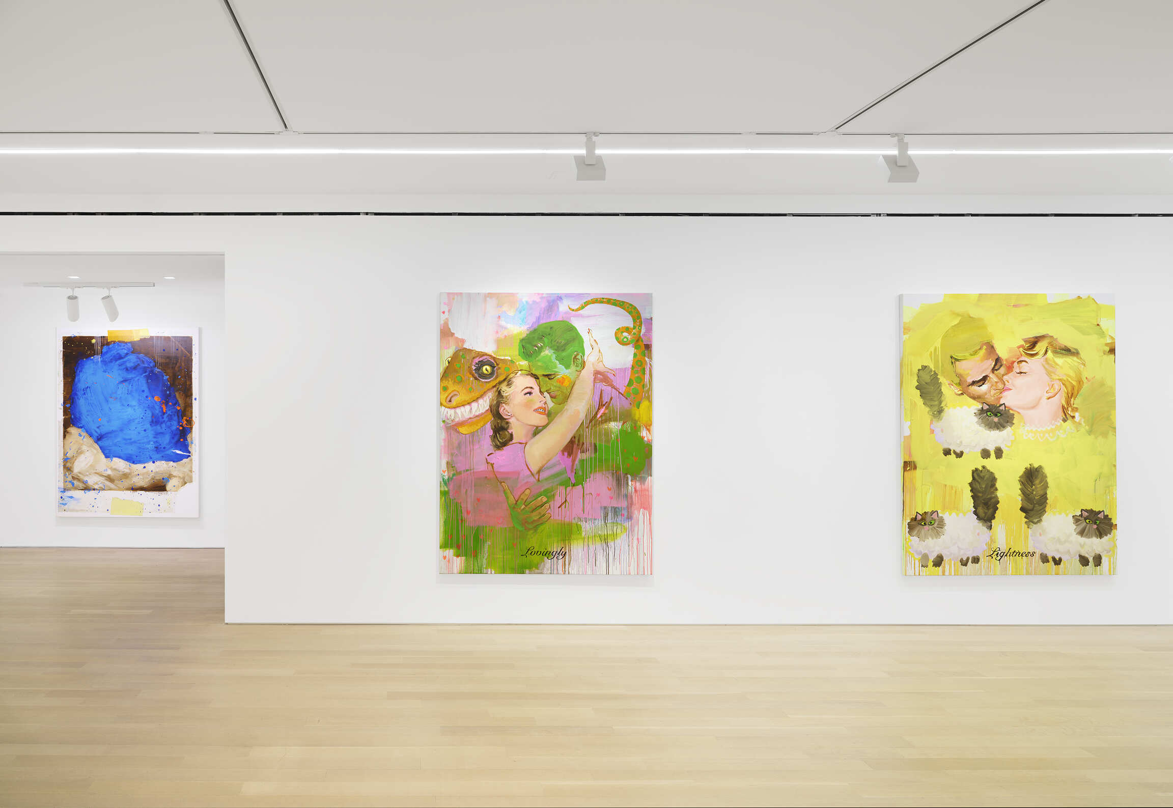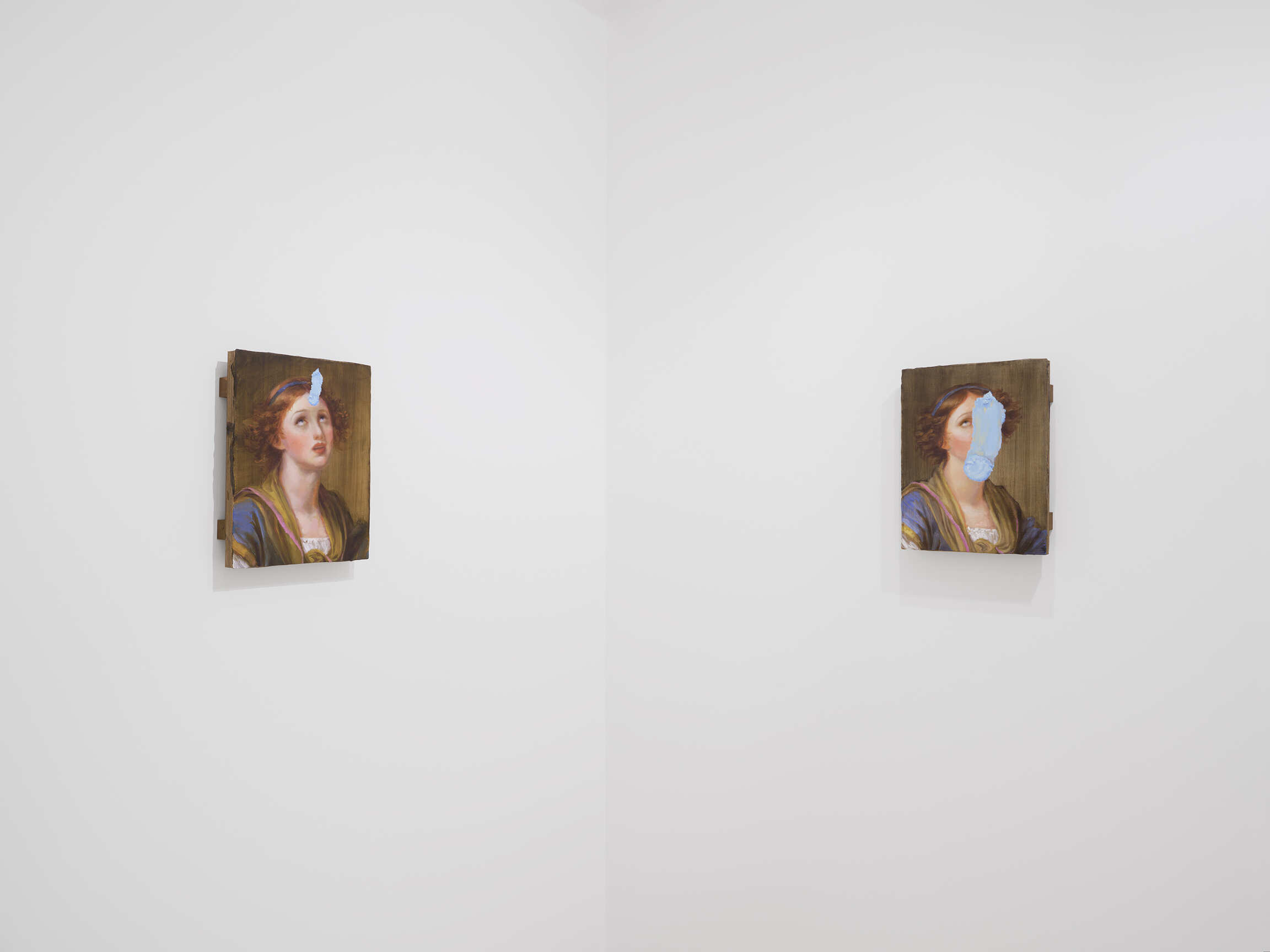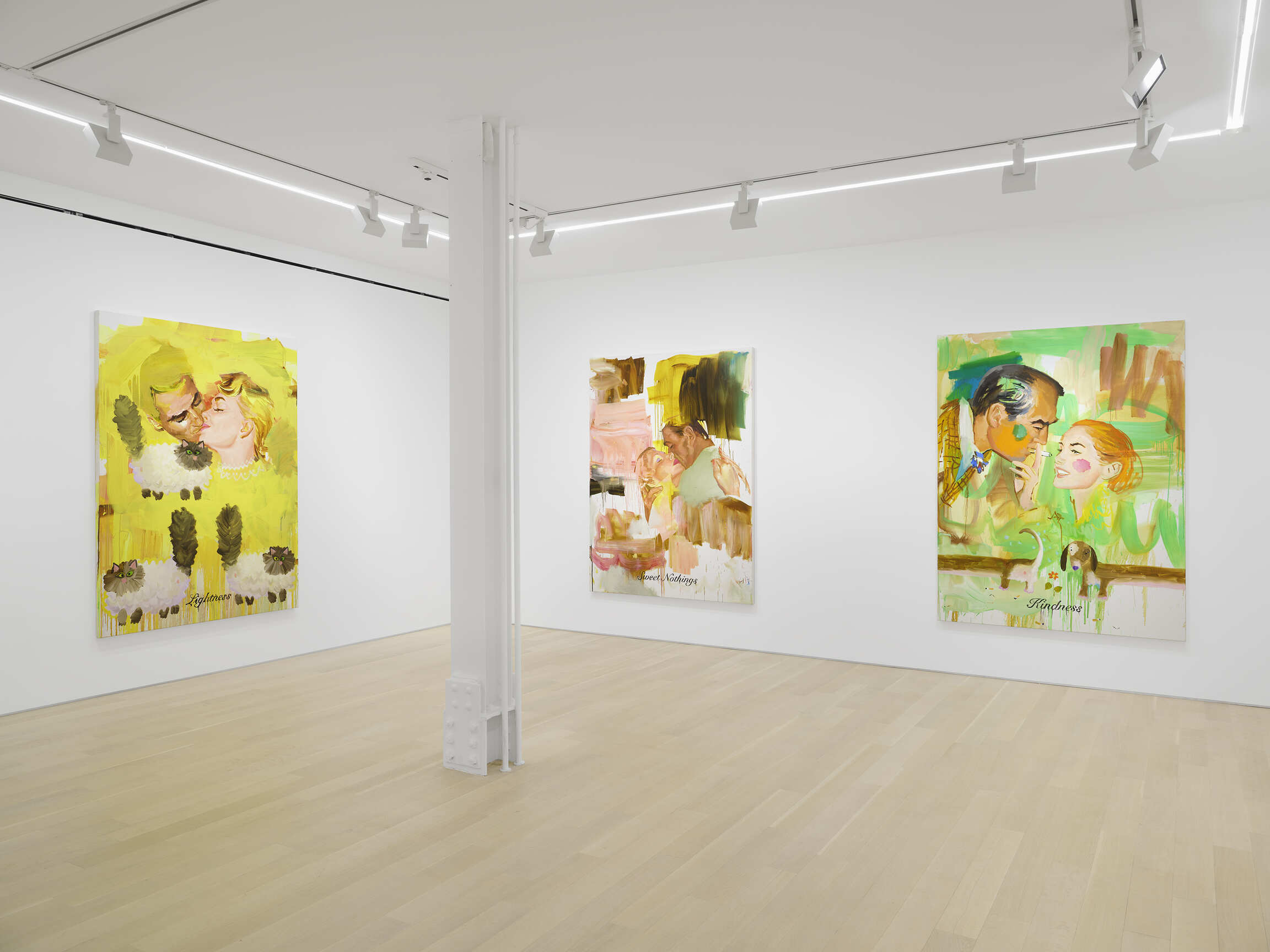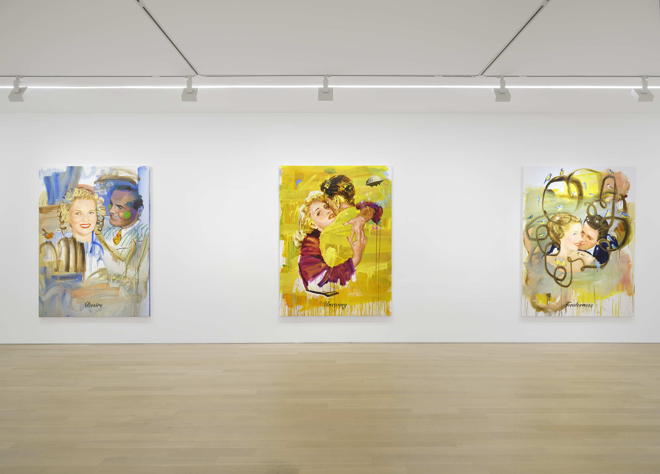 The show receives its namesake from Sentimental Paintings, an ongoing series that the duo revisits and evolves to fit within this current moment in their practice. An amalgamation of painting’s various syntactic elements—abstraction, figuration, and now text, where Sweet Nothings can be read—these paintings discover themselves as they are being made; a process that begins with one element which then responds to and determines the next. Though the iconographic sources trace back to post-war period of the 1950s and 1960s, the overt optimism they elude speaks to the naïve desires society holds closely today.