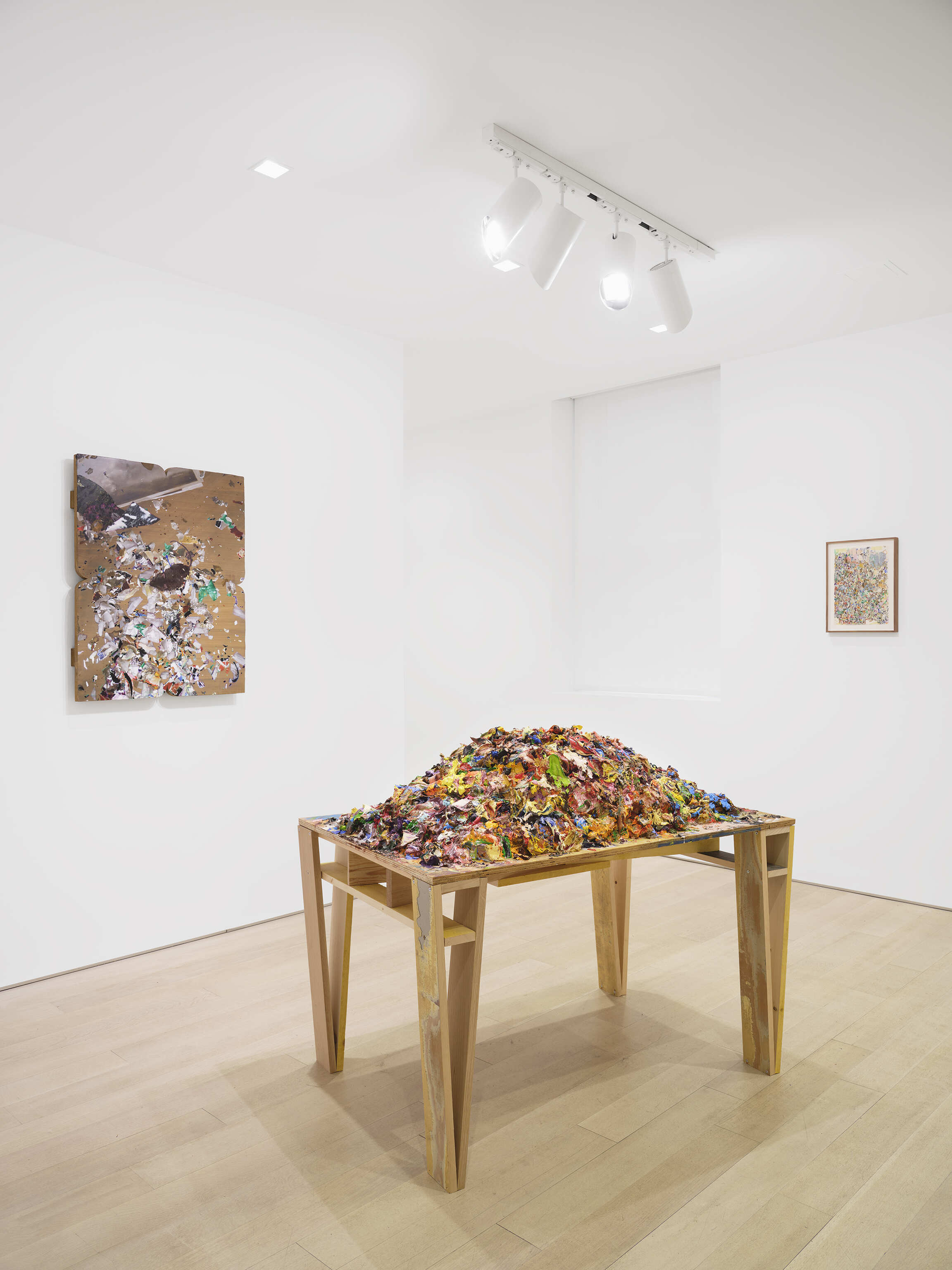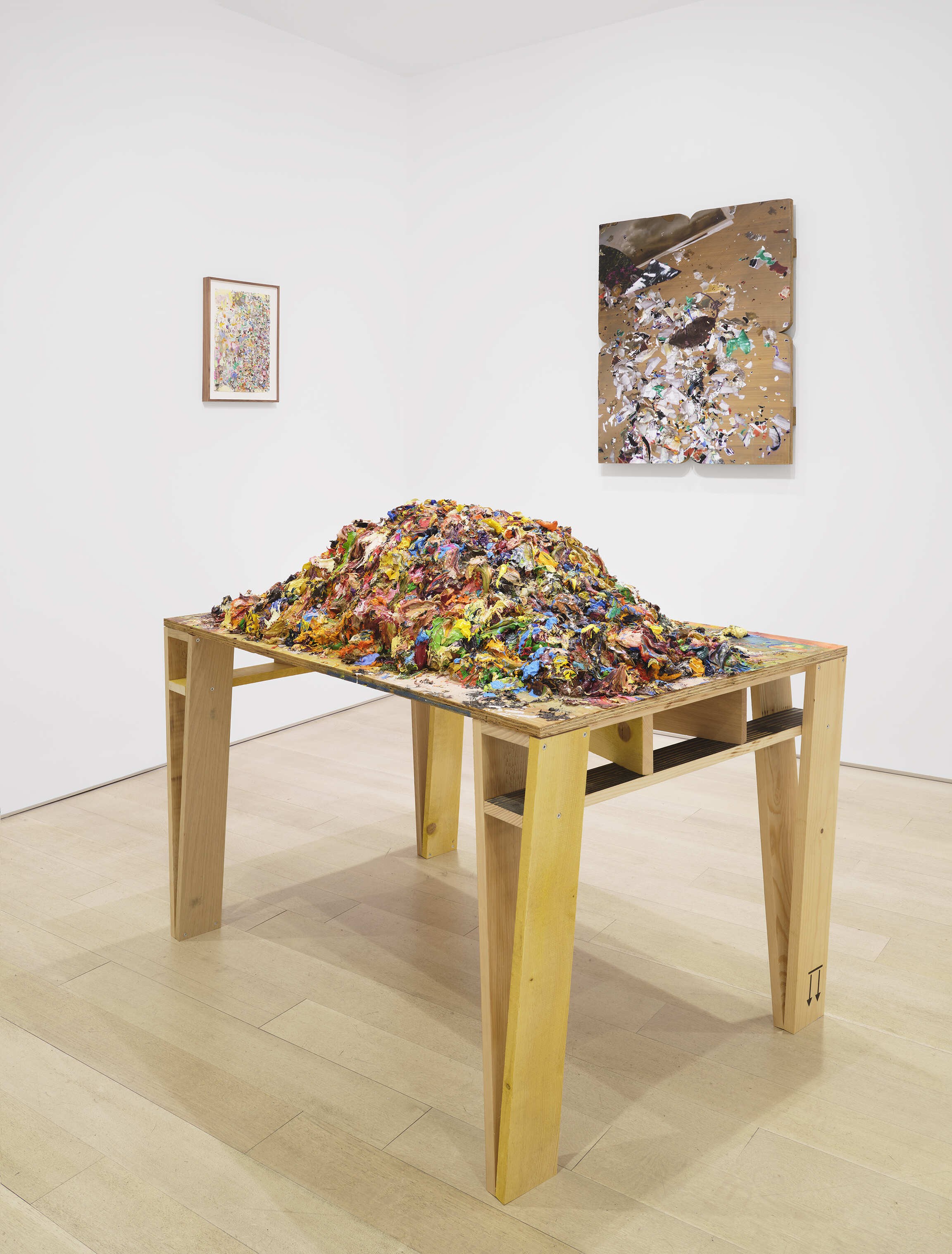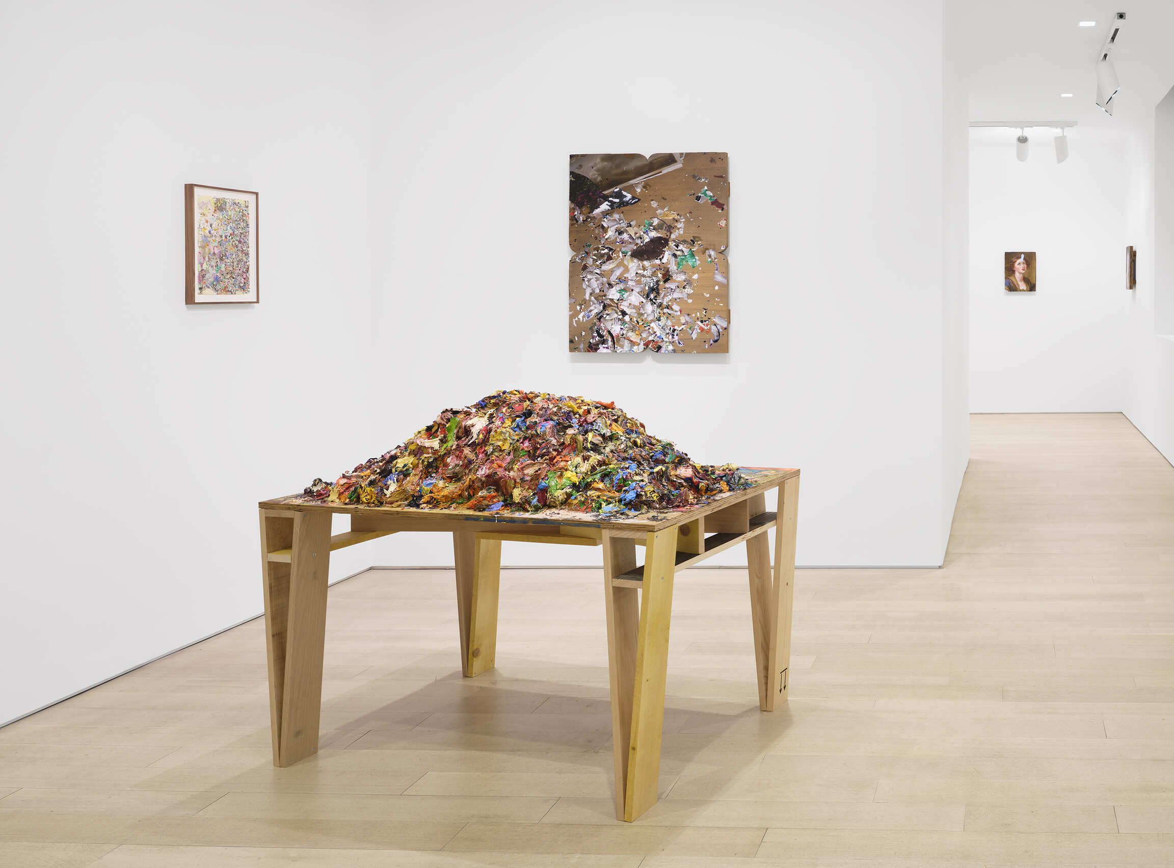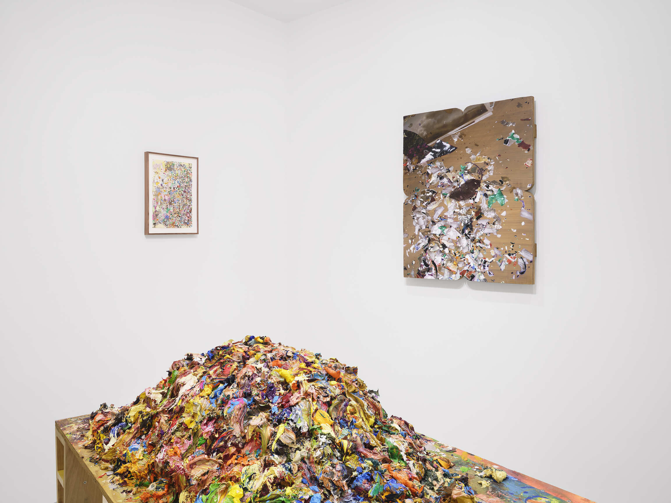 The series that follow traverse a deep well of throughlines that the duo unintentionally put in place from the beginnings of their partnership’s conception. Take for instance, Papers, a new body of work comprised of old sheets of A3 paper that have been the recipients of each artist’s color tests and excess paint for the past 20 years. Artworks that have covertly surrounded Tursic and Mille on a near daily basis, finding a new context and home on the gallery wall. In clear conversation with Papers is the Sisyphe series, a more overtly sculptural take on a similar act of discarding paint remains. Both series share an idea fundamental to the artists, the question of “what to do” resulting in “the doing.” Just as a Sisyphean task can never be completed, so too do Tursic and Mille never want to reach an end result. Their practice embraces an eternal restart; it embodies an attempt to understand the world, and concurrently, the true reality of creating with paint, in the process.