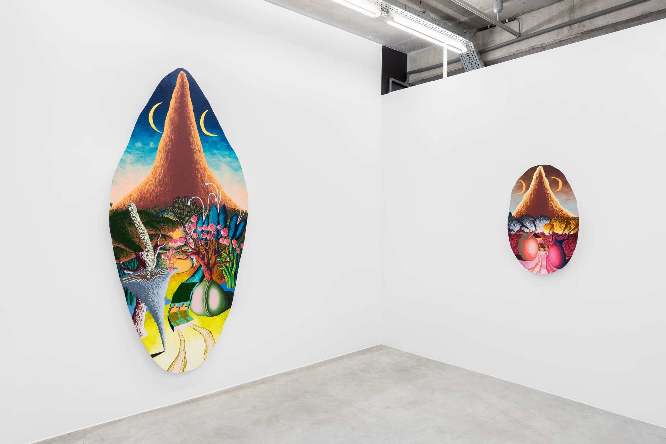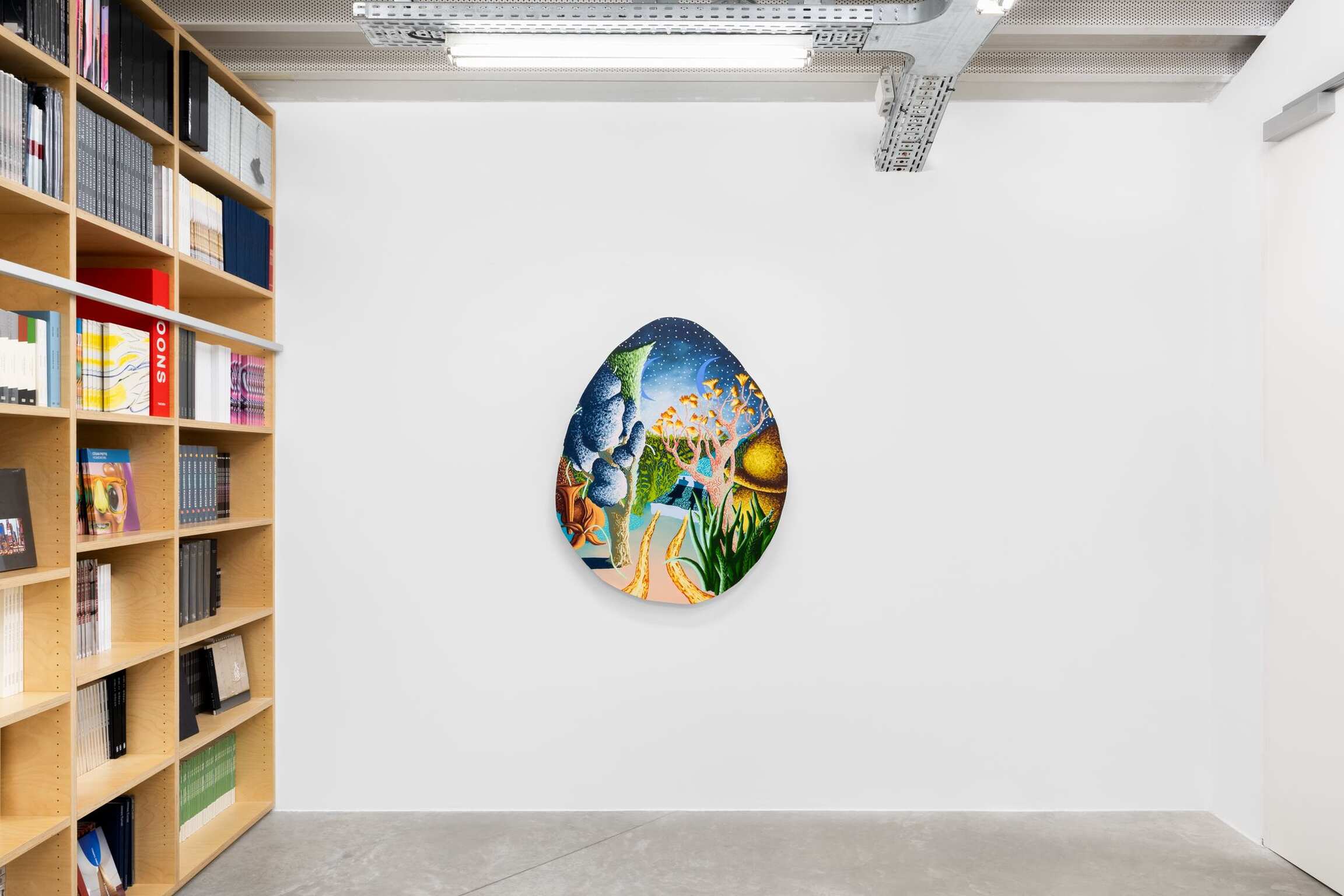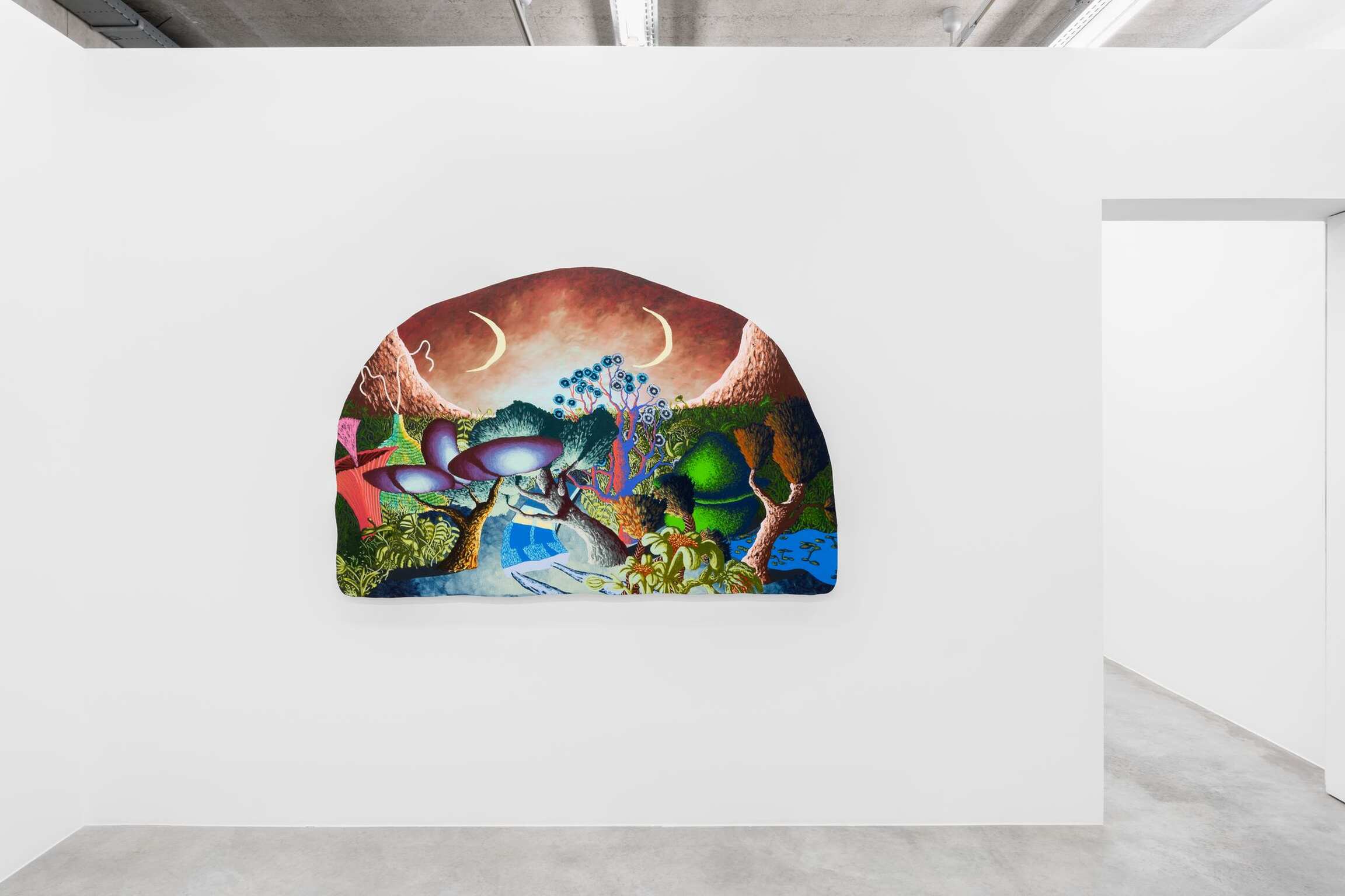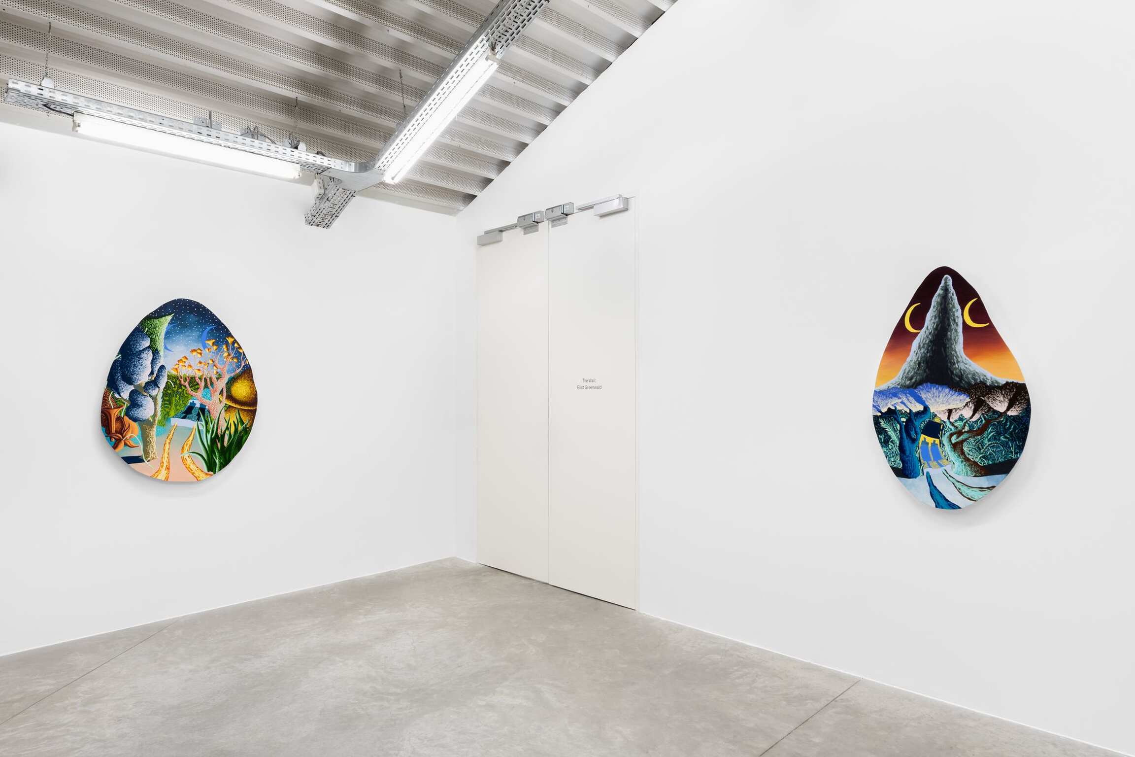 Within the irregular curved shapes of Eliot Greenwald’s paintings are captivating landscapes filled with improbable plant formations, doubled planets in the sky, and the body of a car that stretches and morphs. For Greenwald’s latest body of ‘Night Car’ paintings, however, a new structure emerges, Flabby Saturn, a stationary structure resembling the colossal planet Saturn which seems to have lost its traditional spherical shape with a ring and become less certain. This structure has been removed from the cosmos, entangled with flora, and therefore married with the landscape itself. All that is witnessed or imagined is vulnerable to drastic reevaluation.