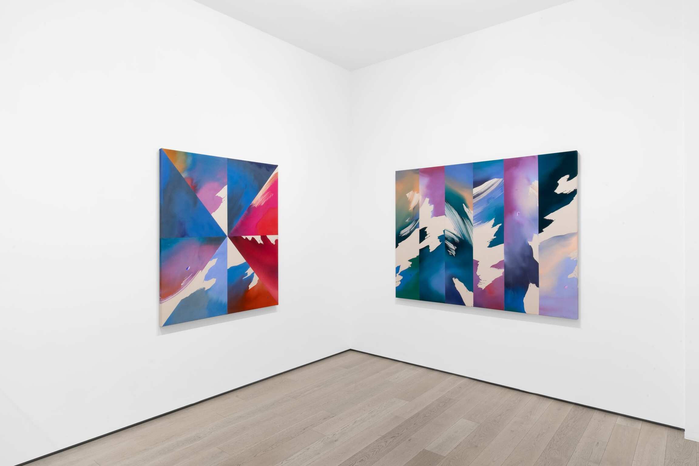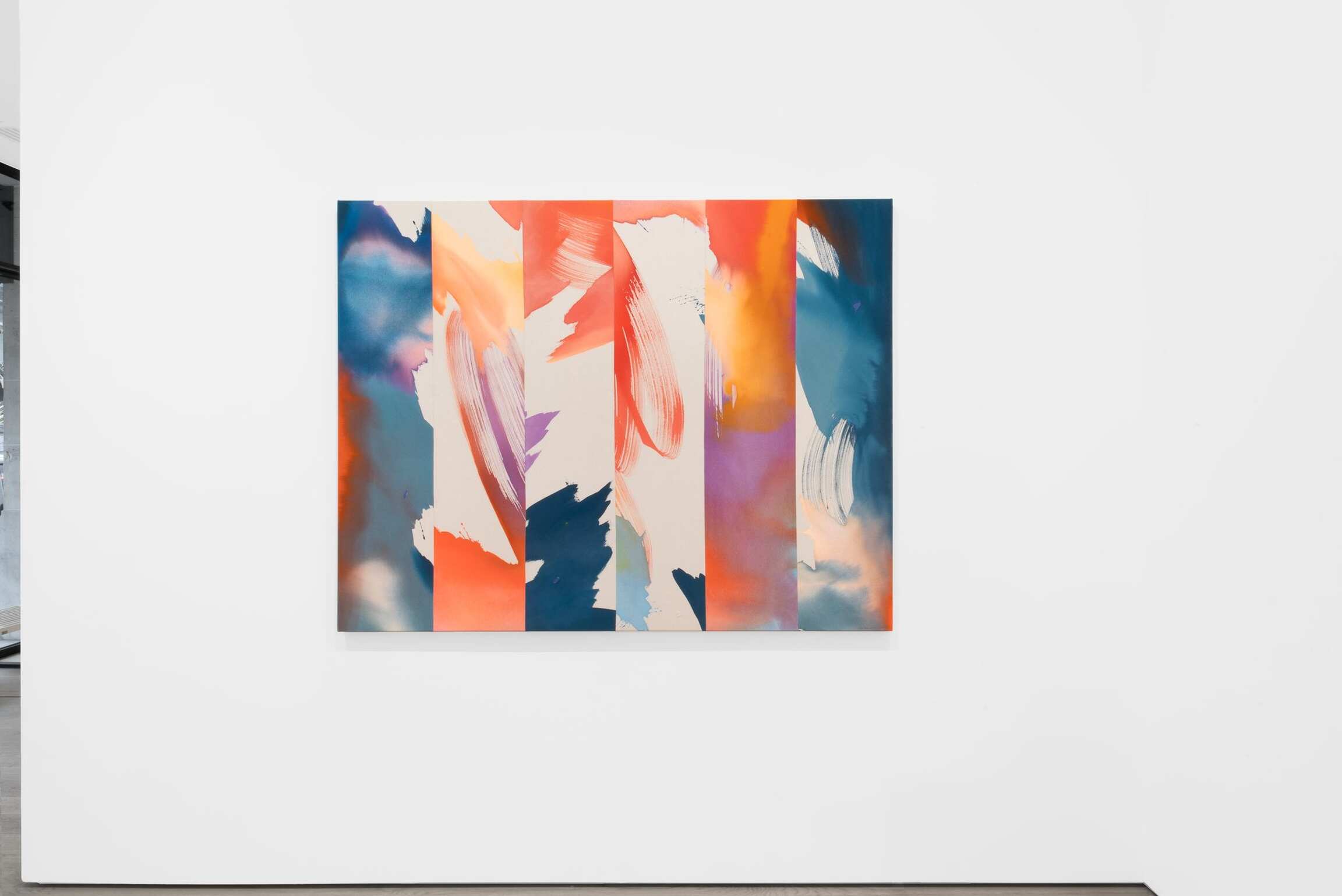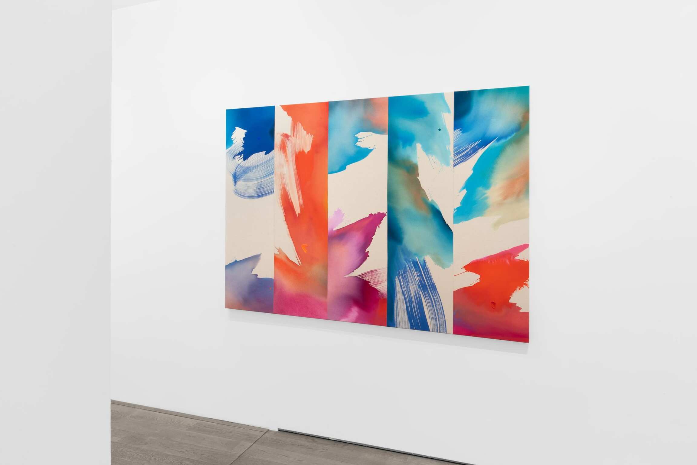 Heather Day makes large-scale abstract canvases dappled with the transmuting shades of the natural world. Far from literal evocations of the infinitely mutable atmospheric conditions that she observes at dawn and dusk in her high desert studio, Day’s works take apart and reassemble the medium in order to obliquely but evocatively depict the passing of time and the shifting of seasons. Titled A Moving Window, this exhibition explores the artist’s immersion in the quotidian yet profound environmental changes that happen every day outside her window. This presentation includes a new group of works from Day’s “Scattering Light” series, first begun in 2022, that examines the ways in which light is refracted through cloud formations. The artist probes the myriad ways that elevation and wavelength impact how this light is received by the human eye. With her saturated, pooling hues of deep red, blue, and orange, the artist interrogates how color and light leave an emotional residue, how sensory perception is intimately entwined with memory and affect.
