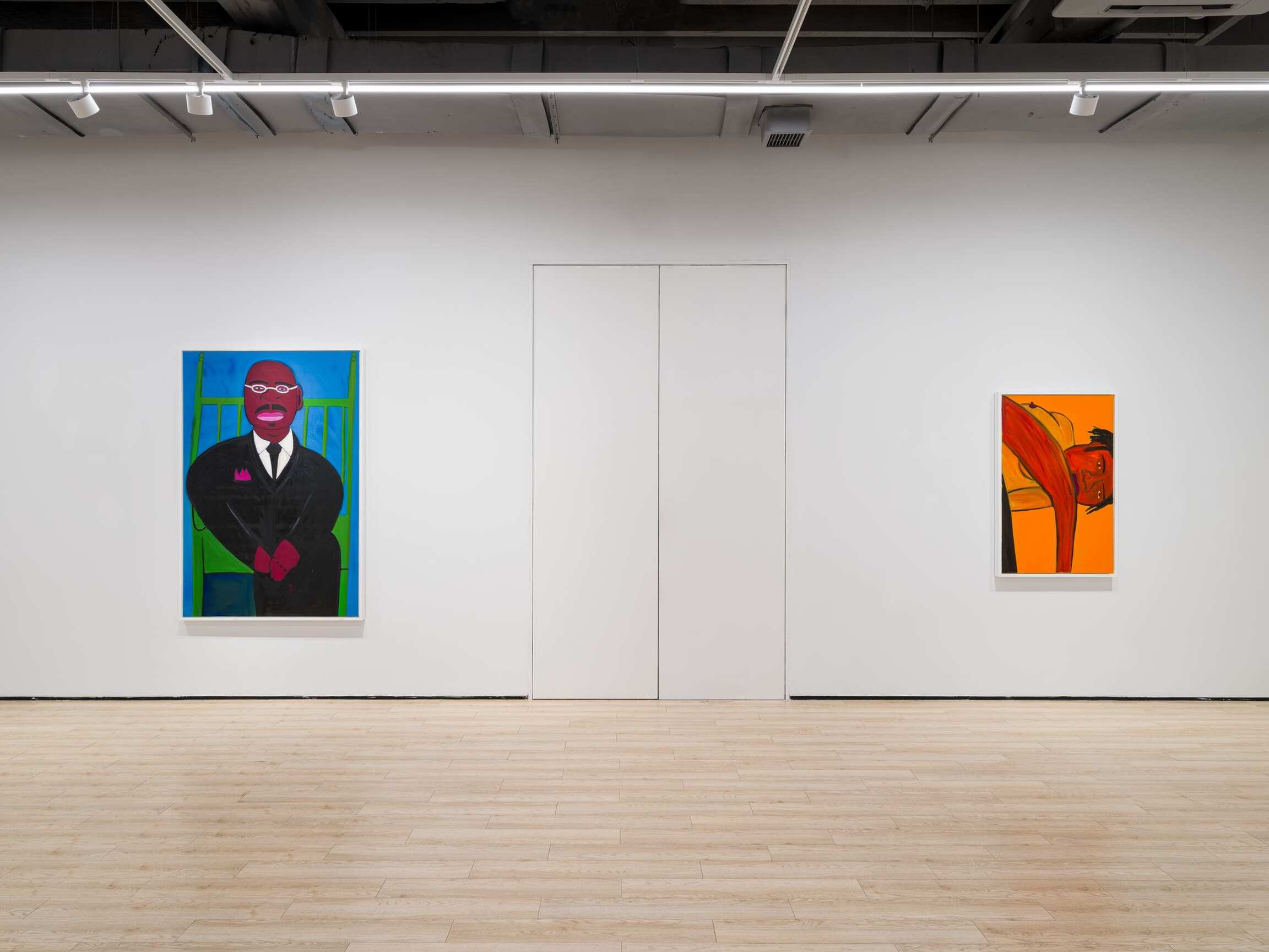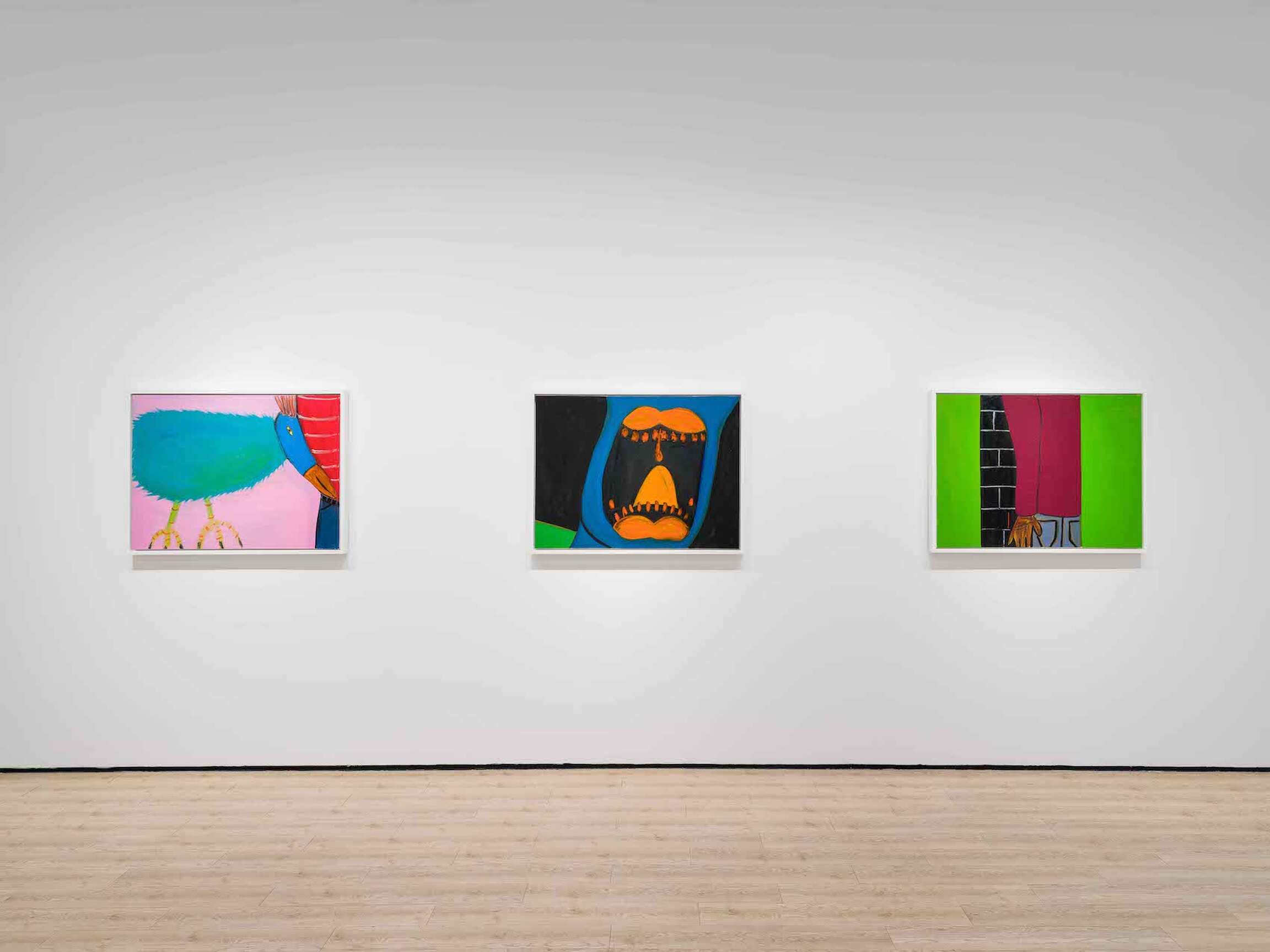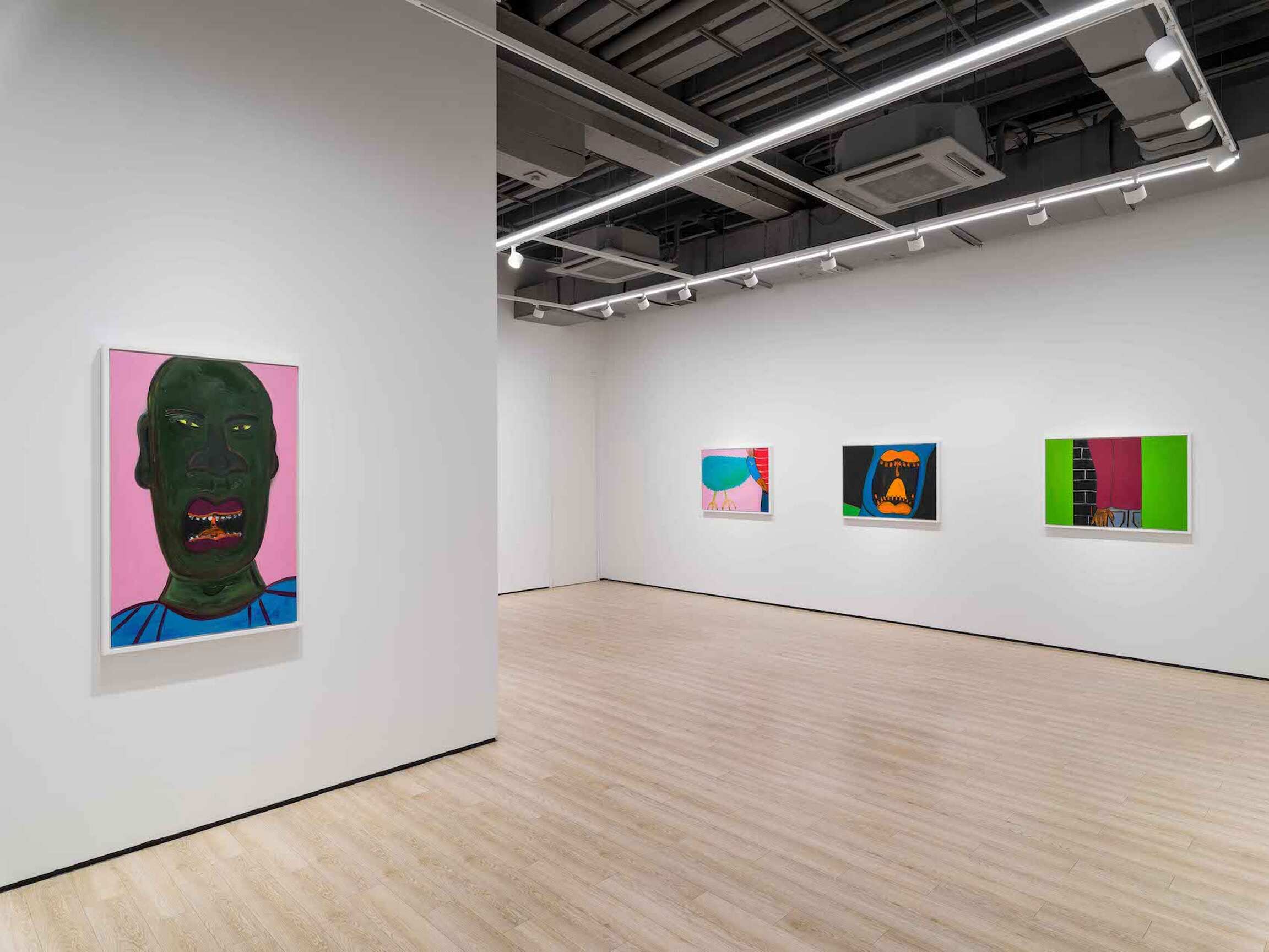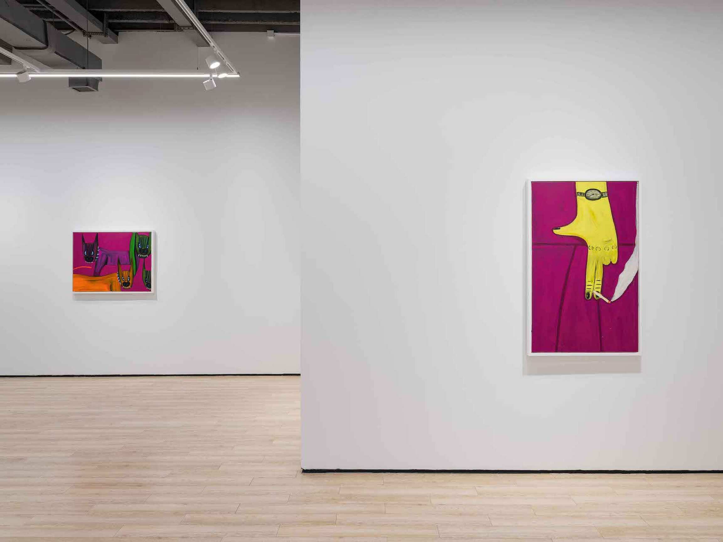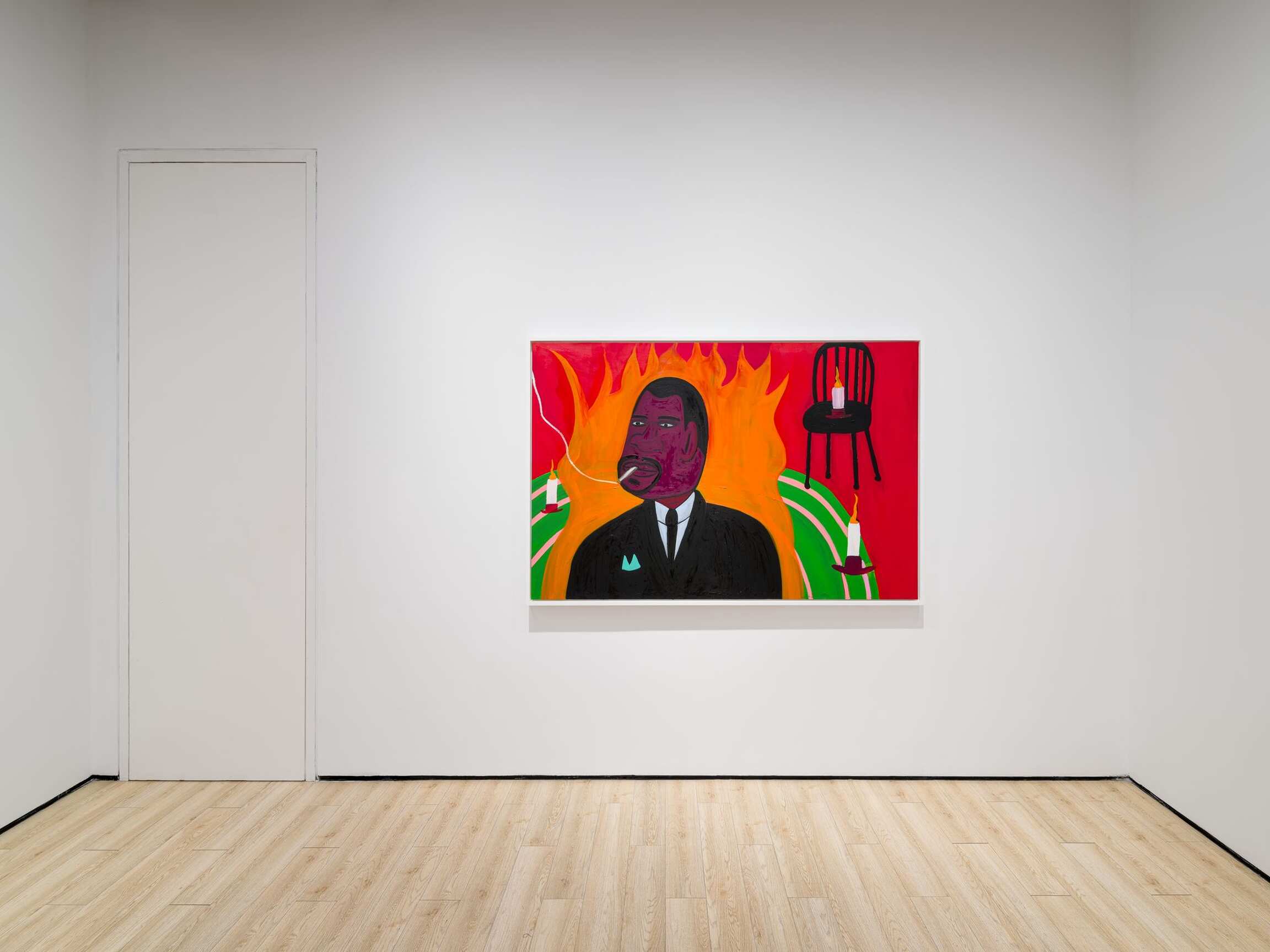 Fragmented body parts are recurrent motifs, drawing attention to the persistent fact of the crop. In Screamer (2023–24), the chasm of a howling mouth, its pronounced uvula and lancelike teeth rendered in an electric orange, is set against an inky backdrop that stretches the silent scream into a setting; the painting originated in Rage (2022), a portrait of a man shrieking in a red expanse as the noxious ground slides away from him on a diagonal. Dino Bird (2023–24) features the titular avian, its soft body flush with blue, pressing its chela-like beak into a figure’s striped sleeve. This oddly intimate piece—along with a portrait of a man’s hunter green face, titled Rage (2023–24)—sprang from Bird Man (2022–23), a painting based on a photograph of Pablo Picasso, who famously fragmented the body to break with pictorial convention. Picasso isn’t the only iconic artist referenced and remixed in the self-taught painter’s show; Hand of Guston (2023–24), depicting a yellow hand against a maroon ground, nods to Philip Guston’s painting The Line (1978), in which a hand—God’s? Guston’s?—extends toward the earth with a piece of chalk, ready to draw the world into being. Here, the chalk is supplanted by a cigarette, and smoking doubles as a form of making—a gesture that likewise appears in Midnight Smoke (2023–24) (based on Evening Smoke [2022], presumably from a bit earlier in the night), in which the plume of smoke from a man’s cigarette charts a line from his hand to a lightbulb.