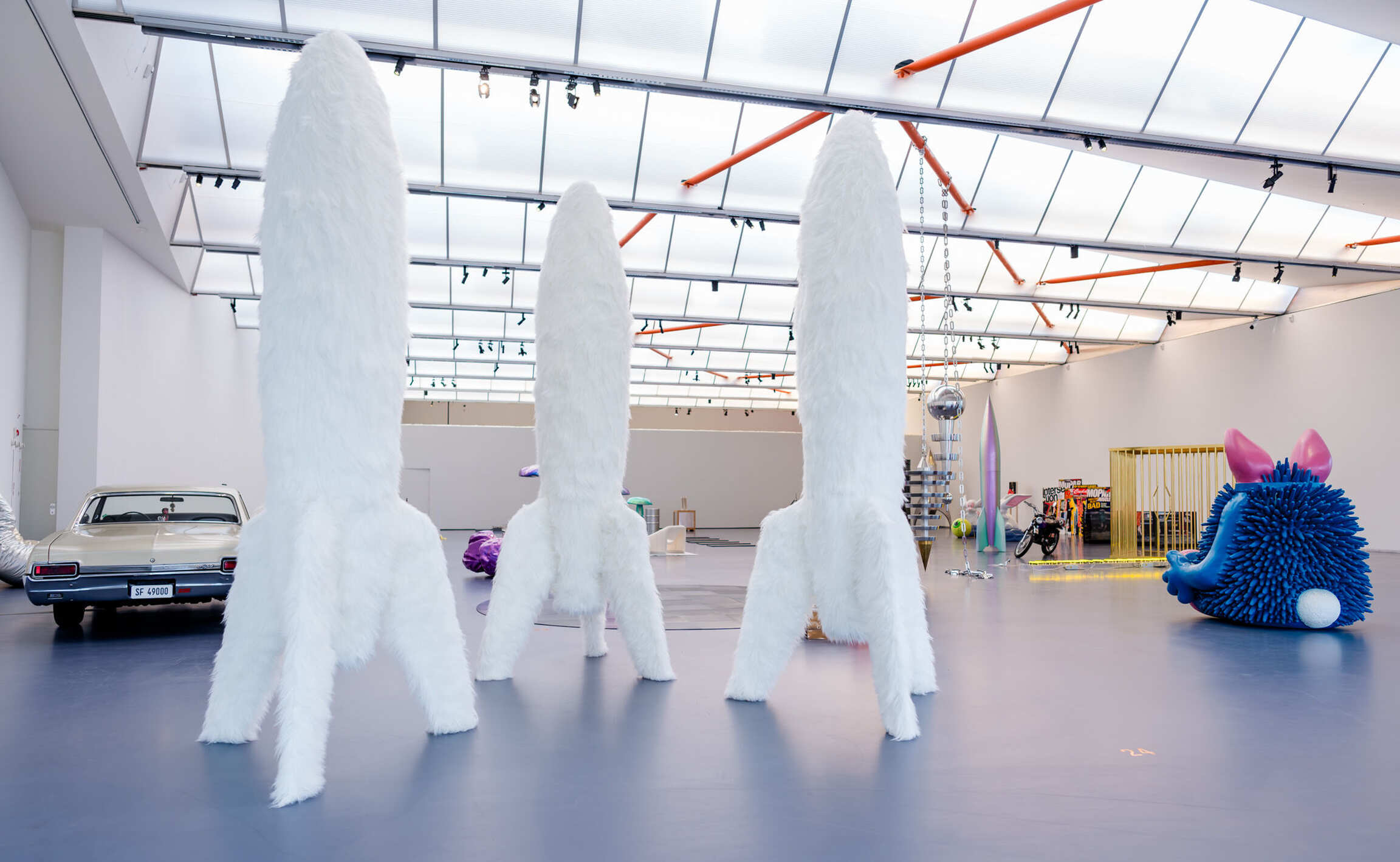 Fleury furthermore challenges the idea that space travel is also a male-dominated field. In her work she regularly refers to the cliché that men are from Mars and women are from Venus. Sometimes proudly erect and made of steel, while at other times limp and slumped in the corner, her series First Spaceship on Venus highlights the phallic symbolism of rockets. She subsequently turns these into more ‘feminine’ objects by executing them in soft materials and lipstick colours, while giving them names like ‘Clitonia’. Feminine versus masculine, high versus popular culture, producer versus consumer, and fashion industry versus art world: the Kunsthal will allow visitors to step into the high-contrast universe of Sylvie Fleury.