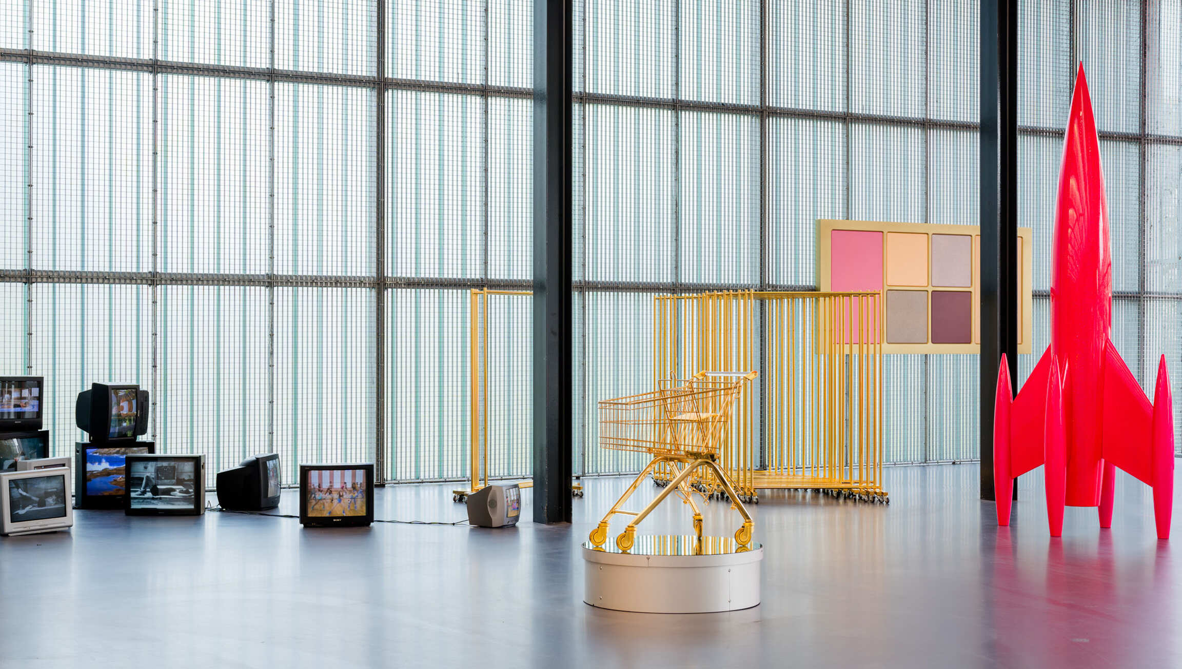 Using lively colours, striking materials, and surprising contradictions, Fleury highlights the gender stereotypes and unrealistic beauty ideals that are prevalent in our society. She deconstructs the expectations that we impose on women with regard to their appearance and behaviour, and everything that entails. The exhibition includes vintage aerobics videos by Jane Fonda and a Gucci yoga mat. Make-up plays an important role in her work as well: for instance, Fleury creates larger-than-life-sized eye shadow palettes that, without a matching brush or visible logo, somewhat resemble abstract paintings.