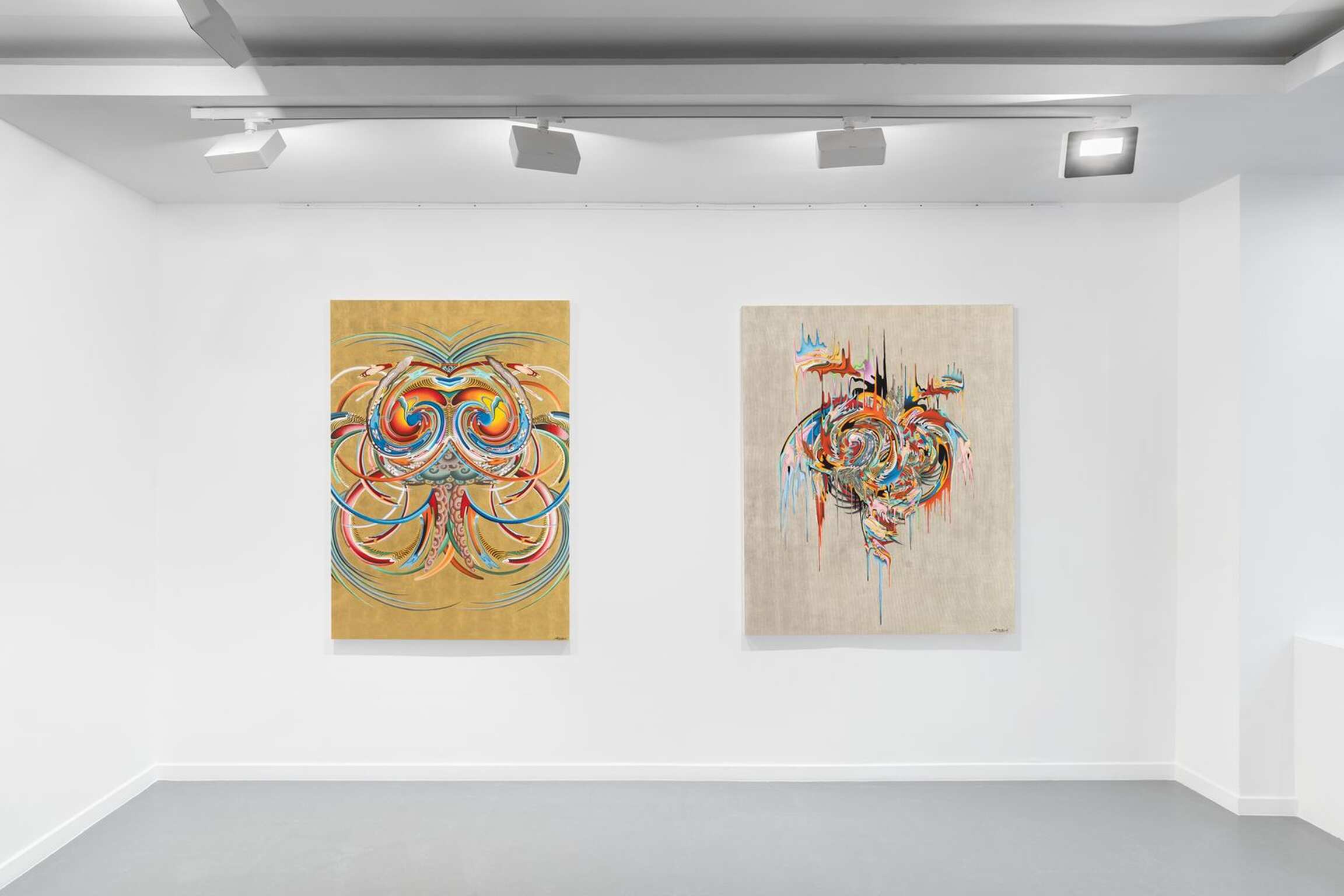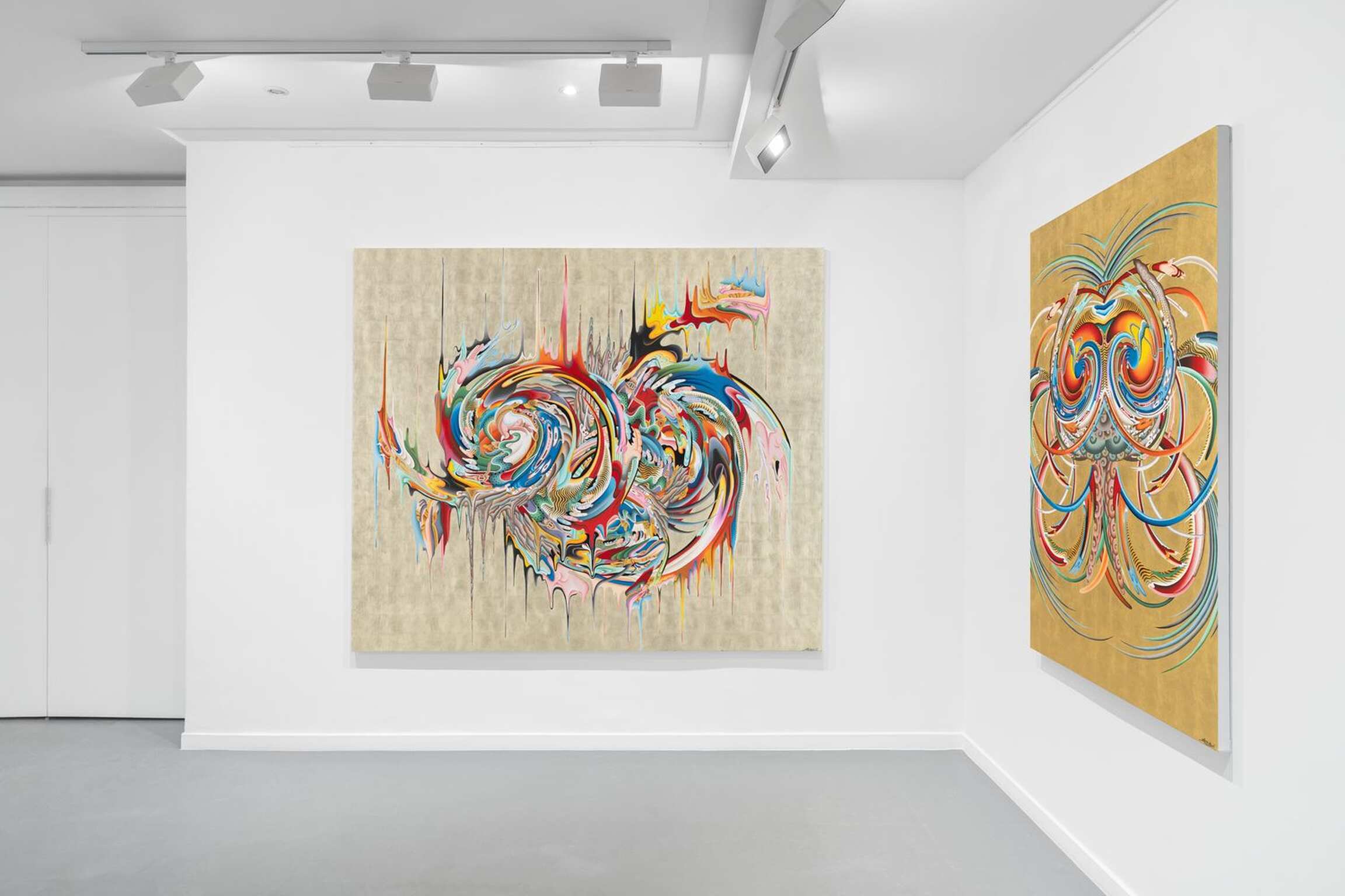"The Swirl motifs are actually derivative of Tibetan Buddhist protector iconography. Growing up, I was formally trained as a traditional Tibetan thangka artist by my father. Because of the symbolism of various elements within the iconography, the tradition requires one to copy the exact image over and over until one masters this tradition. After almost 20 years of practicing as a Traditional thangka artist, I was a bit jaded by the traditional form and was keen to discover new form within the form. By working on the forms, through abstraction and manipulation of the traditional form, my practice is a journey in search of the essence of the Buddhist iconography."
