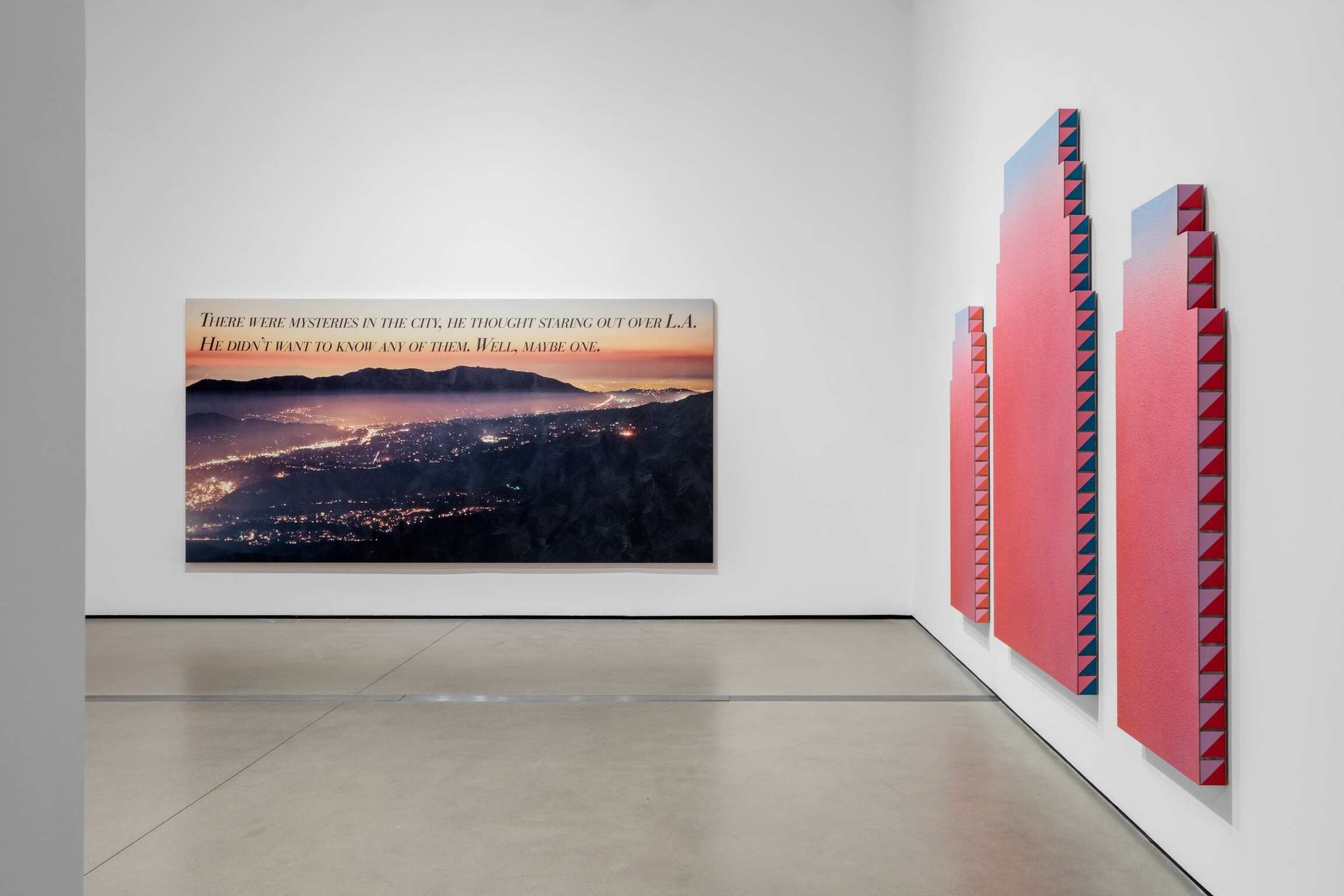 The show’s title refers to Baldessari’s monumental work Buildings=Guns=People: Desire, Knowledge, and Hope (with Smog) (1985), where “smog” nods to the city’s notorious air quality, contrasting against familiar depictions of sunshine, beaches, Hollywood, and nature. This play between an idealized expectation of LA and its gritty reality is evident in the large-scale paintings and neons of Ed Ruscha, Mark Bradford, and Patrick Martinez whose intergenerational exchanges consider global and local societal issues through a shared home.