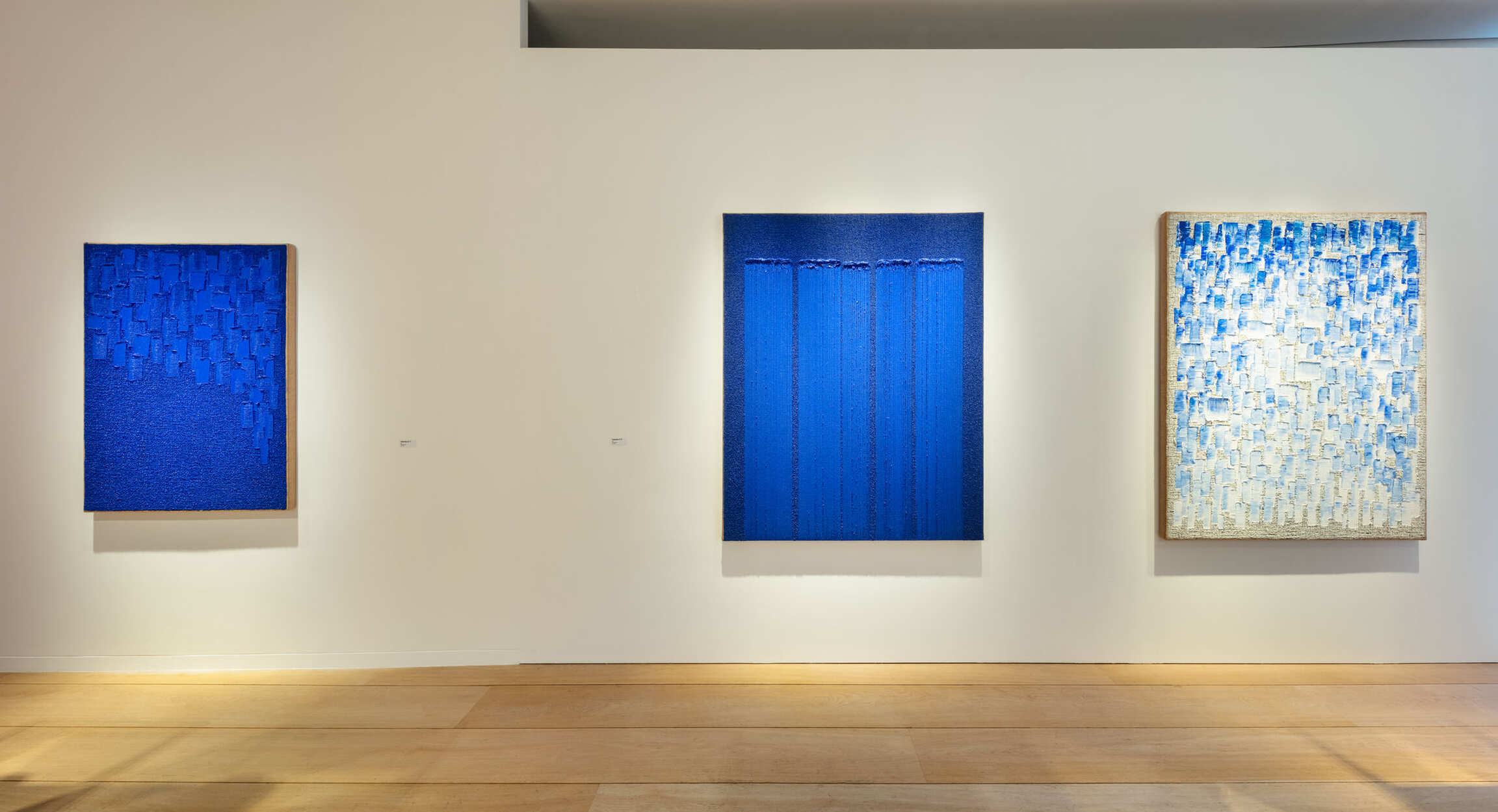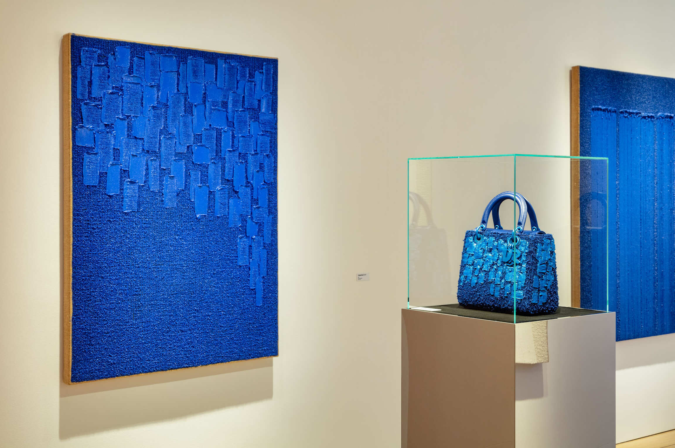 For Dior, Ha Chong-Hyun chose to transpose four of his emblematic paintings into a series of Lady Dior, playing with nuances and materials. Reinterpreting Conjunction 74-26 – exhibited at the Museum of Modern Art (MoMA) in New York – one of the bags is inspired by a foal shoe designed by Roger Vivier for the House. A second reproduces the cadenced, hypnotic motif of Conjunction 21-10, while the other two, in shades of red or blue, are adorned with tweed and embroidery for a three-dimensional rendering of the lively, animated – almost mobile – spirit of his works Conjunction 18-19 and Conjunction 22-18.