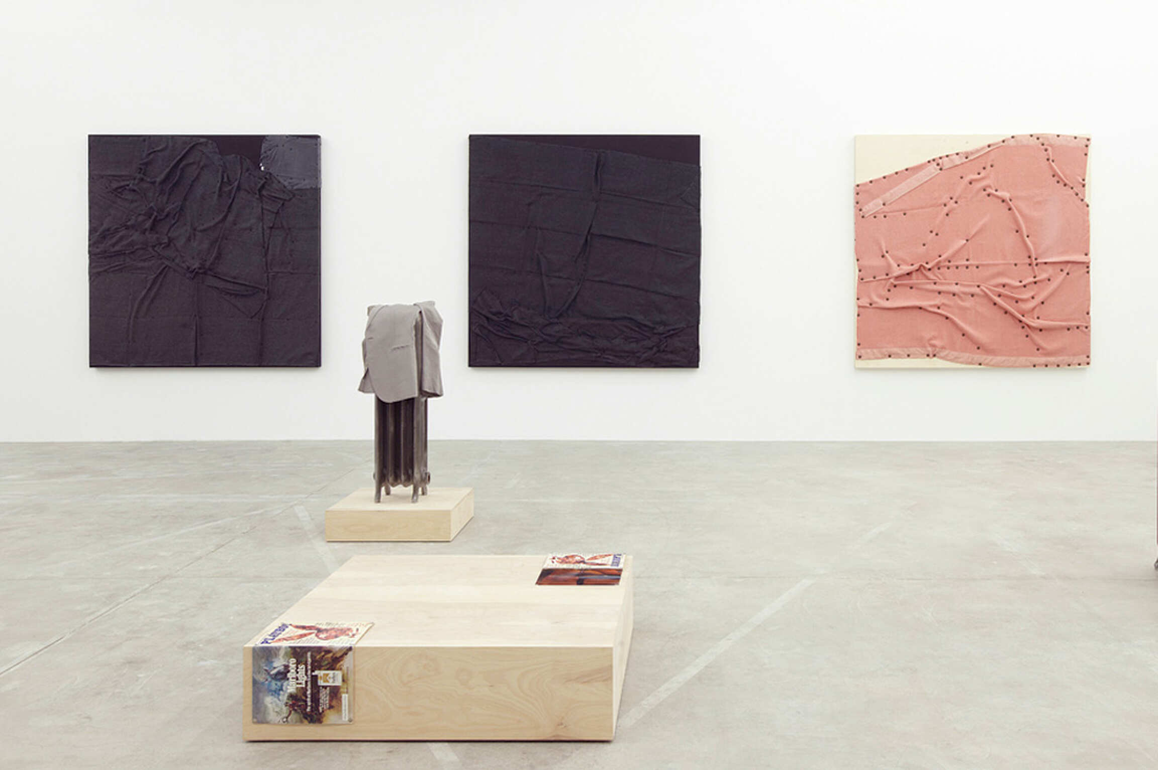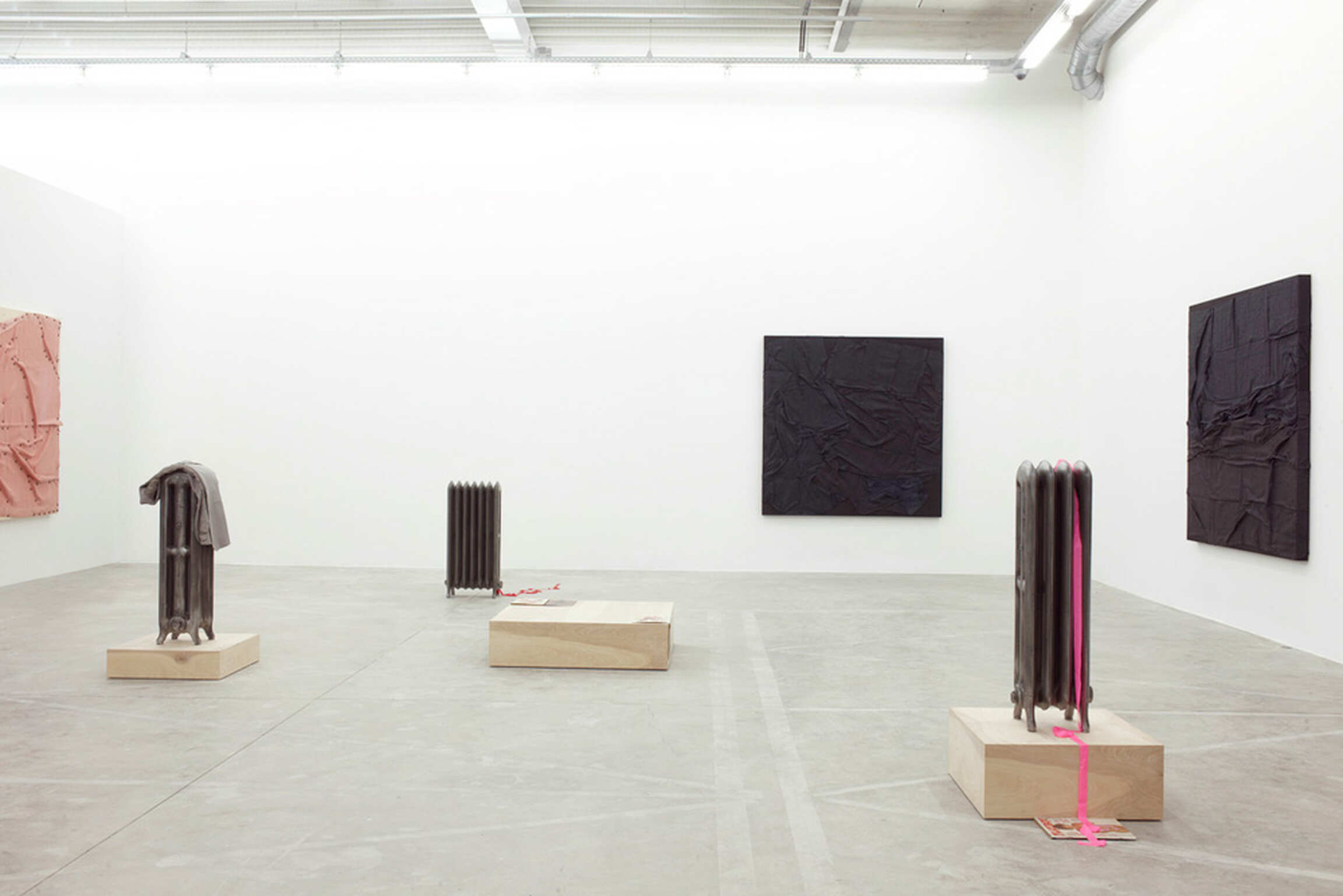 The artist has compared his sculptural approach to acts in a play, or film stills, underlining their theatricality and his allegorical use of forms that are specific to theatre: platforms, radiators, curtains, lighting and personal items function as vertical sculptural supports.