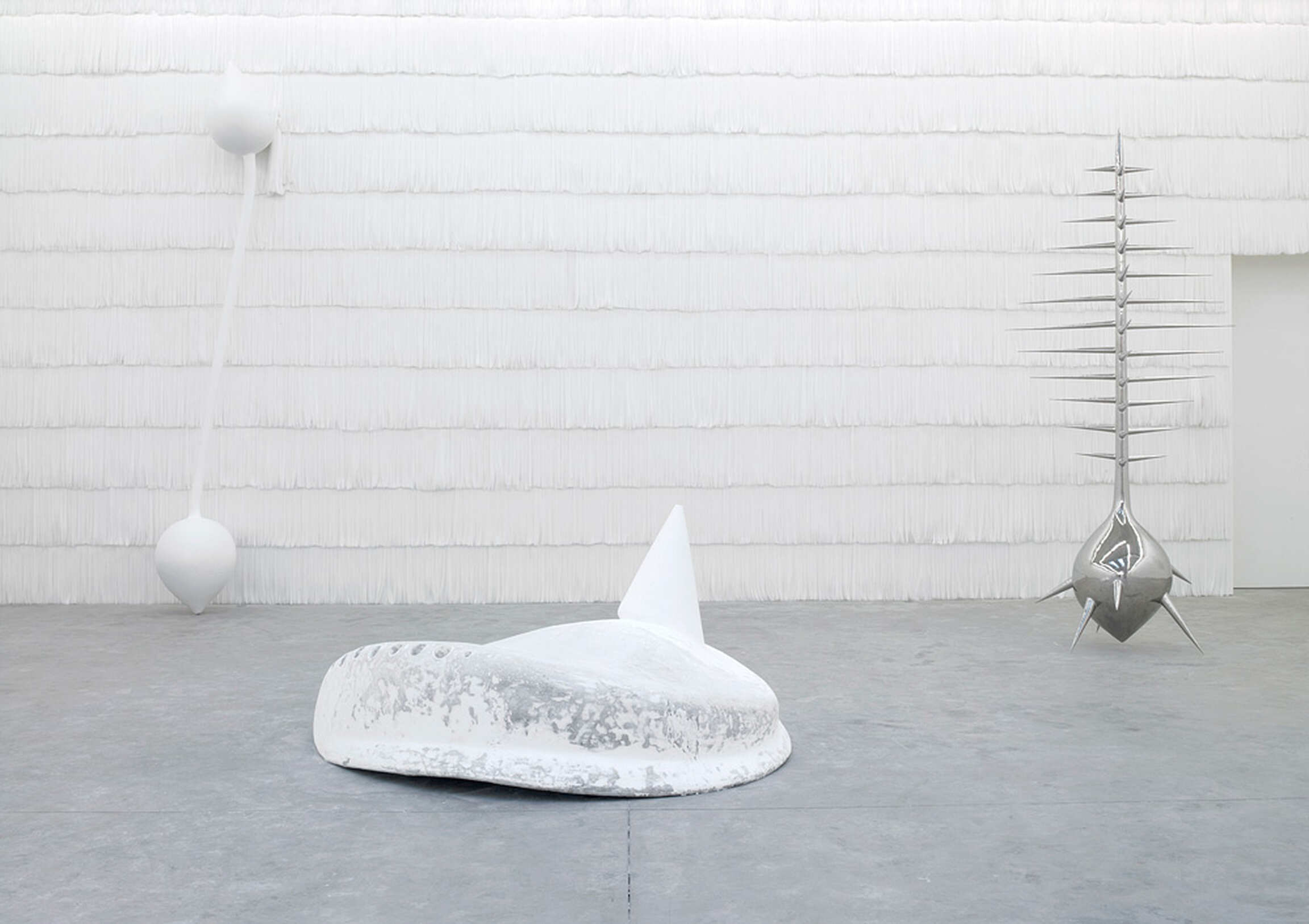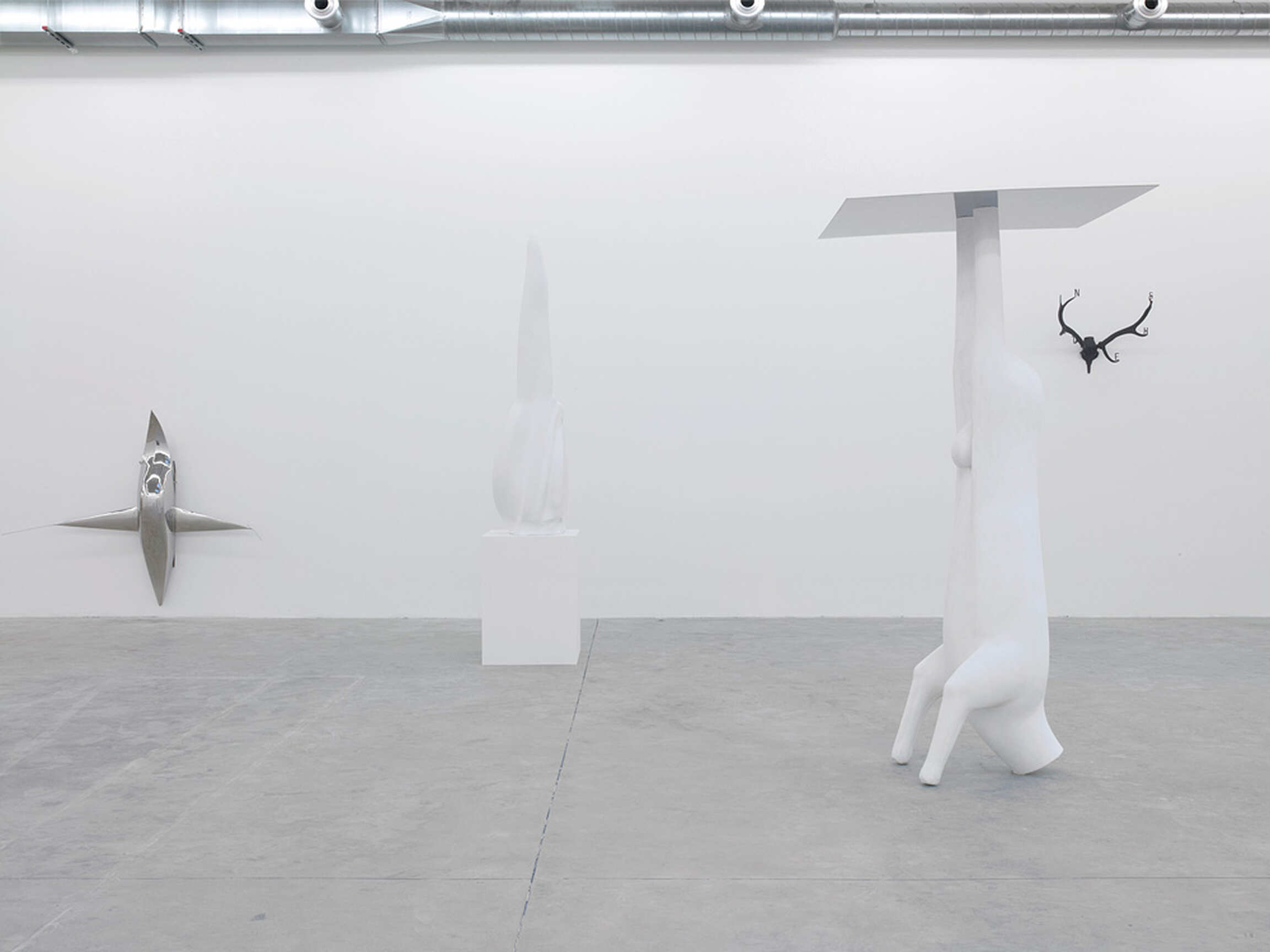Crucial to Not Vital’s work the relationship between form, material and meaning. Not Vital questions conventions of form by abstracting natural or animal shapes, creating mutations and distorting scale. The form of ‘Unpleasant Object’ originated from a small spiky seashell, yet by enlarging it to monumental scale, simplifying the shape and adding symmetry to the spikes, the work embodies a sense of self-contained objecthood. Similarly ‘625’, a work derived from the sharp angles of a small quartz crystal, typically found in the Swiss Alps, takes on a sensuous and imposing form when the scale is dramatically increased and the sculpture executed in pinkish soap. Indeed, the choice of material in Not Vital’s work is never coincidental: the juxtaposition between soft, malleable, waxy soap and hard, sharp crystal; or white brittle shell and shiny silver stainless steel – all create a sensual tension and endow a physical self-consciousness to both the object and its viewer.