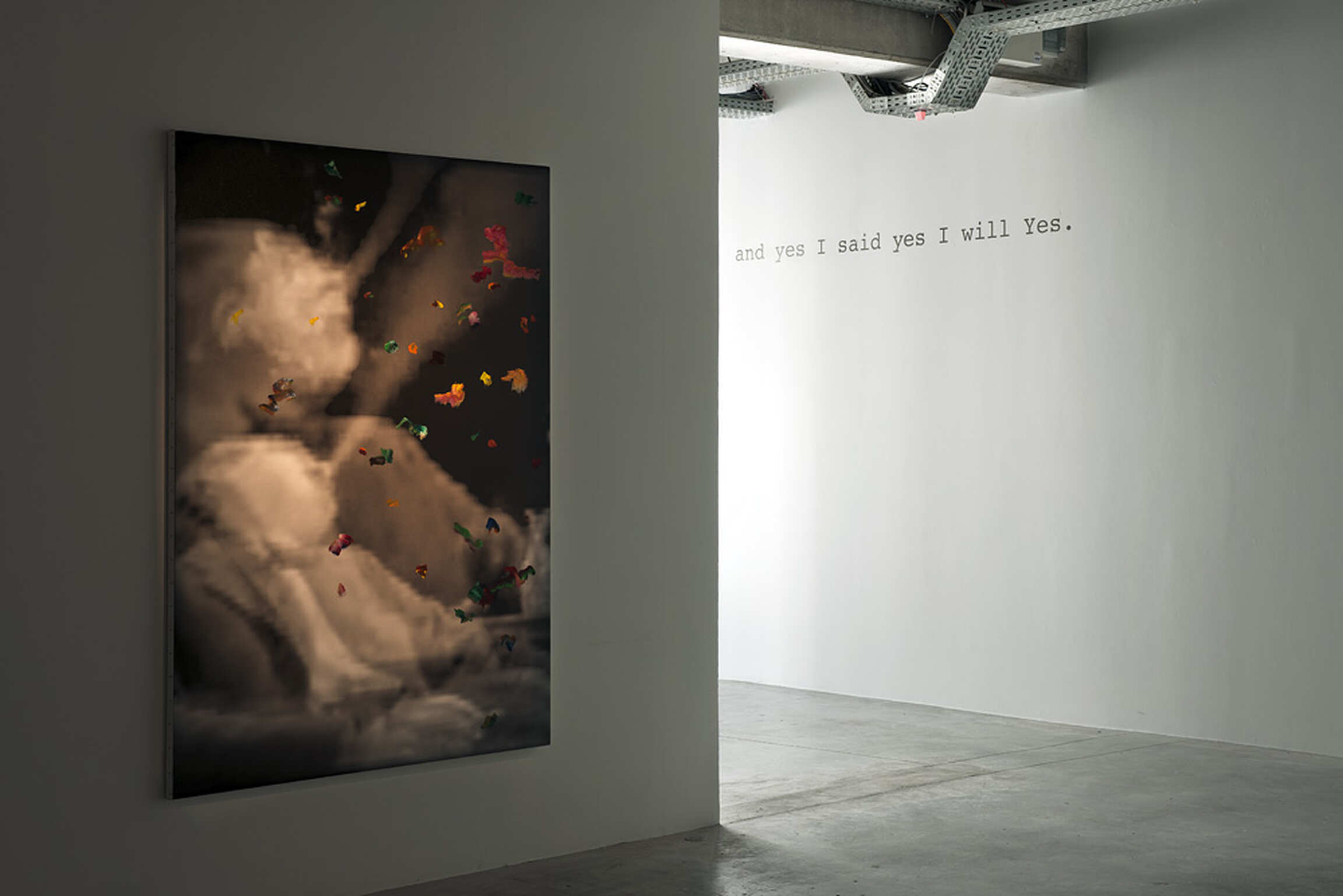Le nouveau projet d’Angel Vergara nous entraîne dans l’univers de l’un des grands récits littéraires de la modernité. Si « and yes I said yes I will Yes » est emprunté aux derniers mots d’Ulysse de James Joyce, il résonne aussi, pour l’artiste, comme le prétexte à l’affirmation, maintes fois répétée, d’une jubilation propice à la peinture. C’est dans le sillage du récit de Joyce, qu’Angel Vergara construit sa propre fiction, convoquant au travers d’un nouveau montage vidéo, conçu comme un casting, des célébrités omniprésentes sur nos écrans. Leonardo Di Caprio, Isabelle Huppert, Lady Gaga… et bien d’autres, deviennent les personnages de cette odyssée. Ils traversent des lieux propres à l’imaginaire de l’artiste et servent aussi sa propre temporalité, le périple d’une journée de peinture dans le flux des images. C’est cette circulation que la couleur vient souligner, poursuivre et entamer pour parfois la fixer, comme des instantanés, dans une série de peintures mises en scène dans l’espace de la galerie.