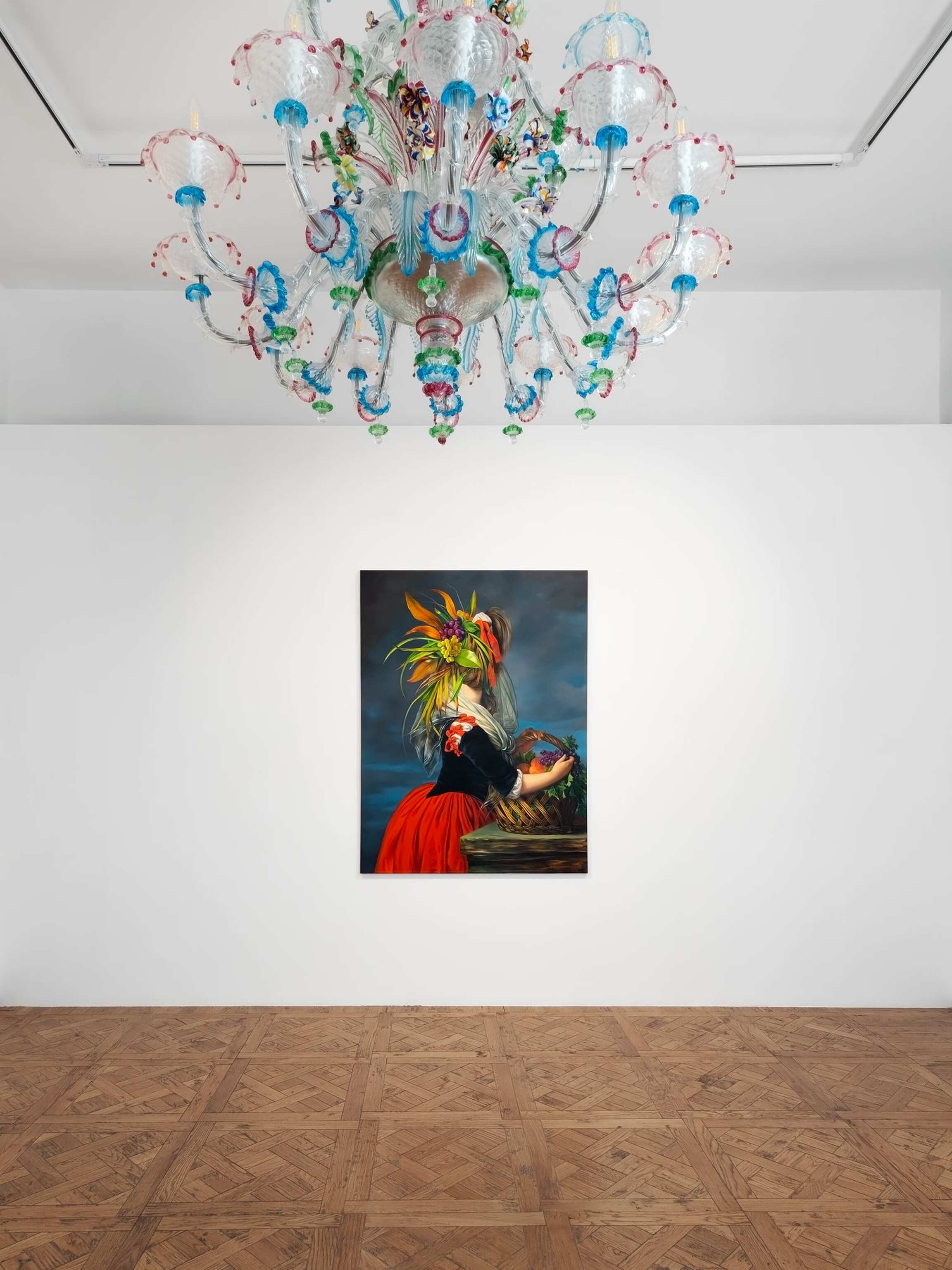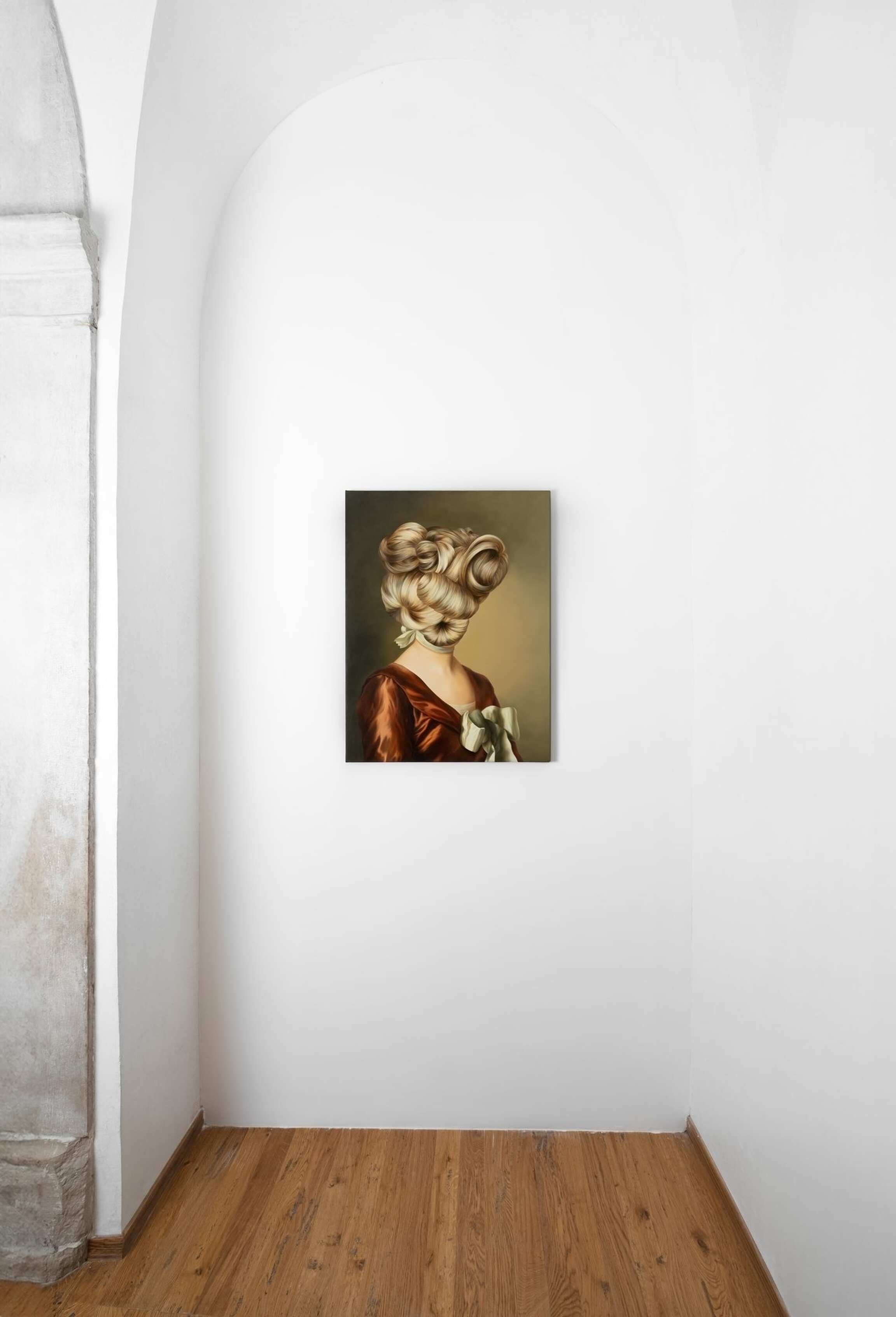 In her versions of old portraits, Juszkiewicz cultivates a traditional pictorial craft, painting in layers, with many glazes, following the brushstrokes of the original work. But her technical virtuosity would be useless if it were not at the service of a transgressive project. By covering the face of historical portraits, Juszkiewicz challenges the very essence of this genre: she destroys the portrait as such. Her paintings based on old portraits are no longer portraits of anyone in particular, but representations of the condition of women under patriarchy. And, as she has pointed out, at the heart of the intervened portrait she drives the stake of another genre: the still life, to which belong the fabrics, flowers, fruits, and other objects she uses as masks, subverting the traditional hierarchy of genres and the culture/nature dichotomy. Juszkiewicz's painting style differs slightly from the inspiration she seeks in the originals: almost all her versions have a larger (sometimes much larger) format than the originals, and a palette that is more vivid, and saturated, with a more luminous effect. Her pictorial treatment is unmistakably contemporary.