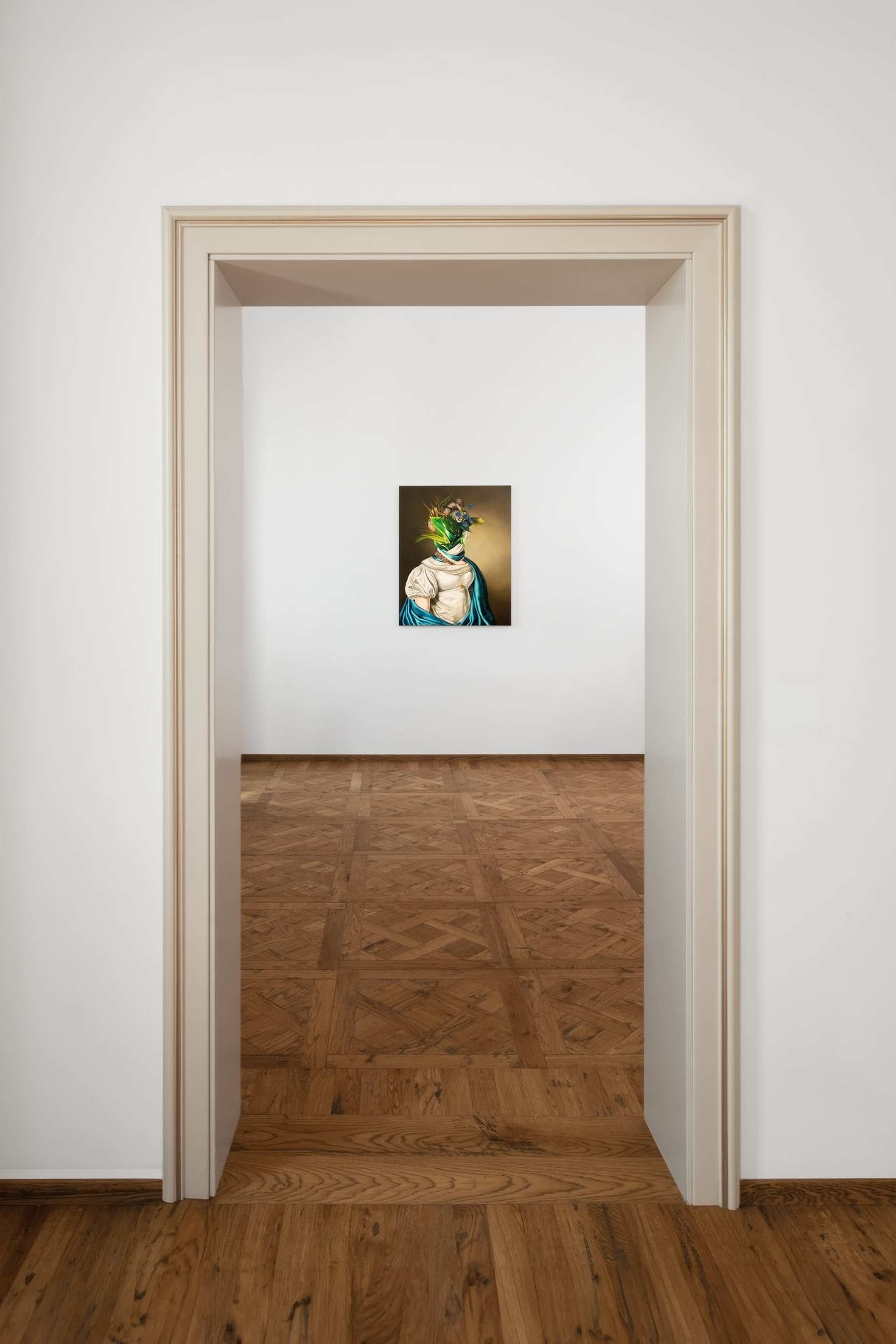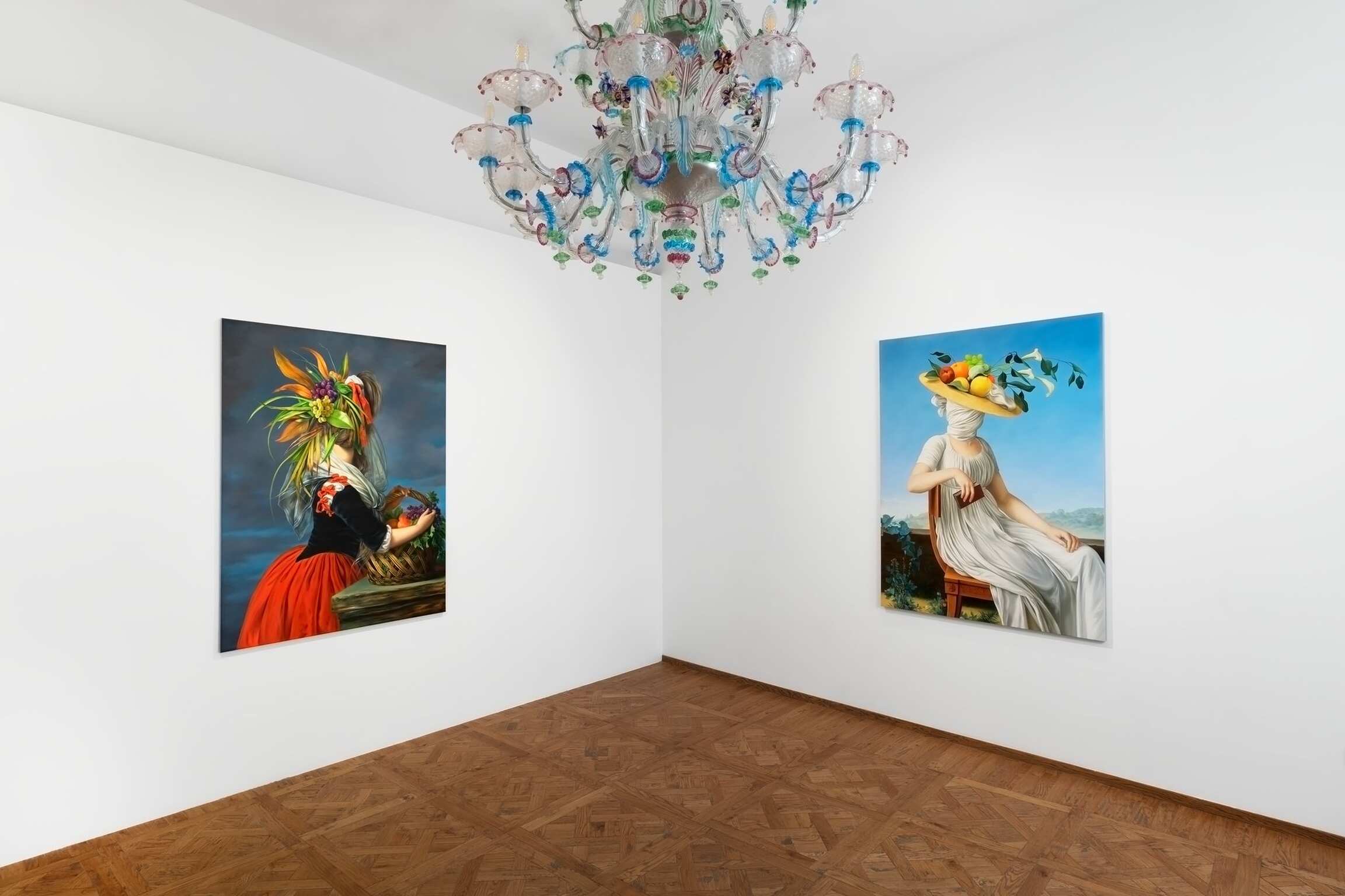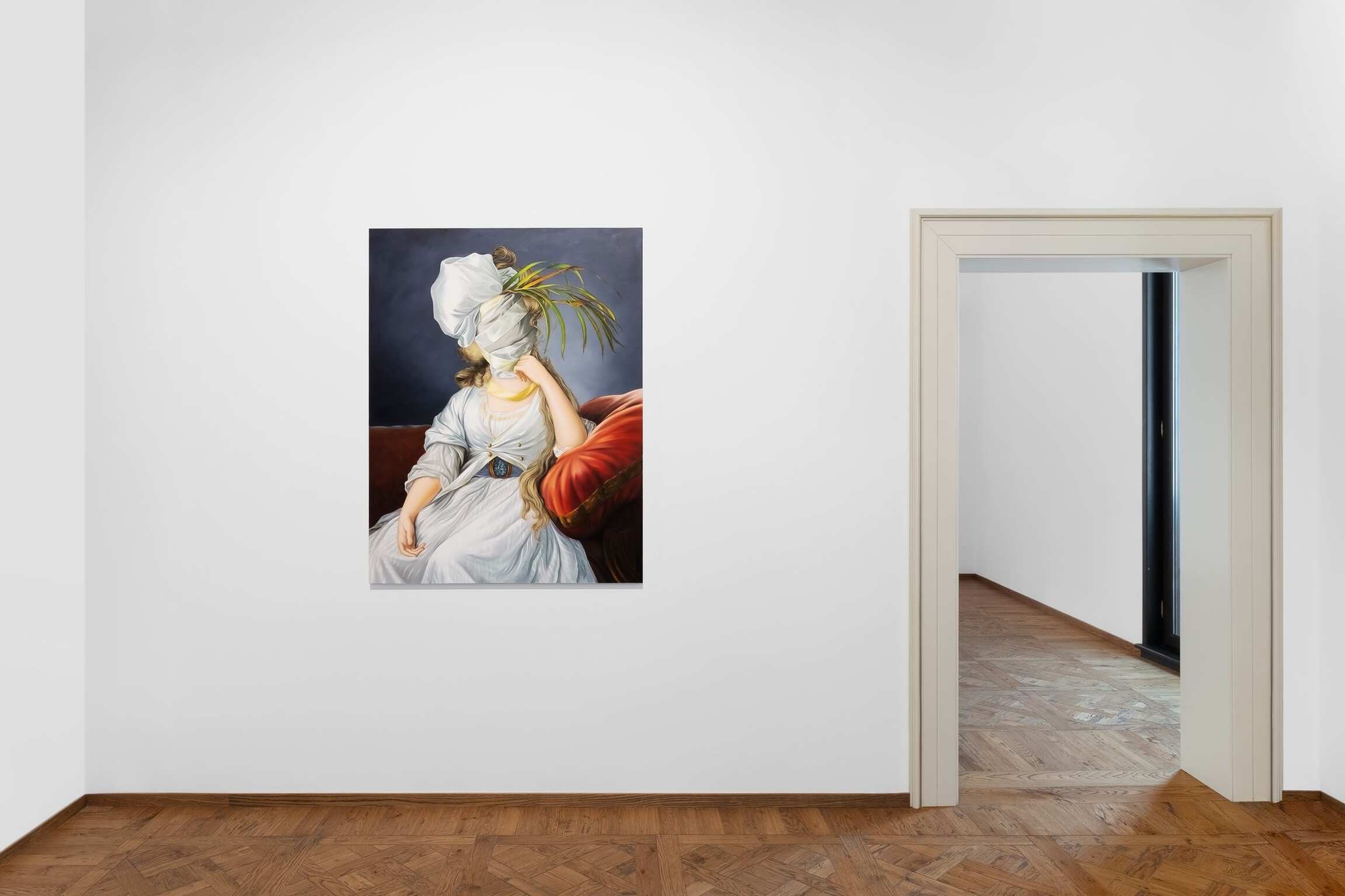 In her versions of old portraits, Juszkiewicz cultivates a traditional pictorial craft, painting in layers, with many glazes, following the brushstrokes of the original work. But her technical virtuosity would be useless were it not at the service of a transgressive project. By covering the face of historical portraits, Juszkiewicz challenges the very essence of this genre: she destroys the portrait as such. Her paintings are no longer portraits of anyone in particular, but representations of the condition of women under patriarchy. And, as she points out, at the heart of the intervened portrait she drives the stake of another genre: the still life, to which belong the fabrics, flowers, fruits, and other objects the artist uses as masks, subverting the traditional hierarchy of genres and the culture/nature dichotomy.