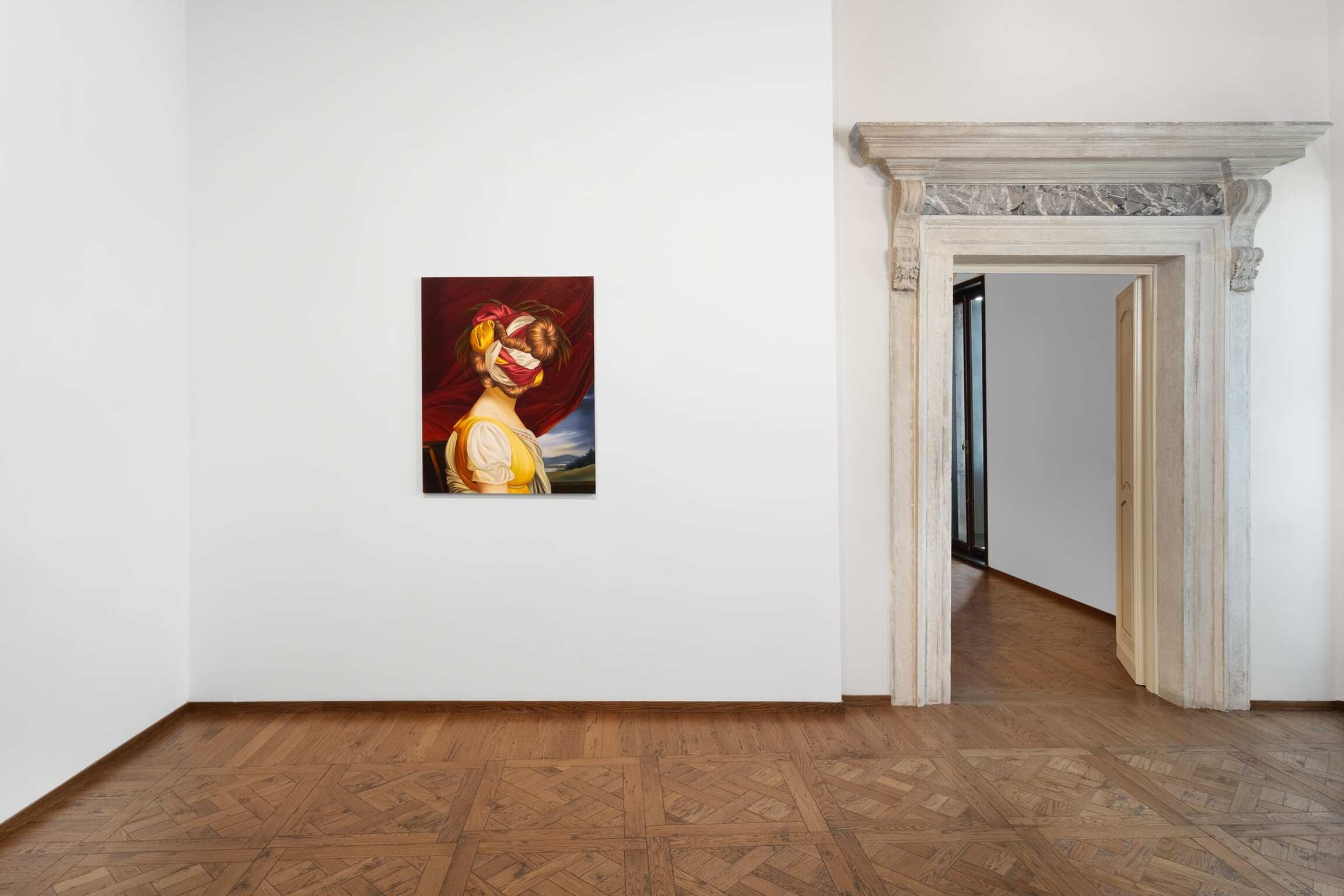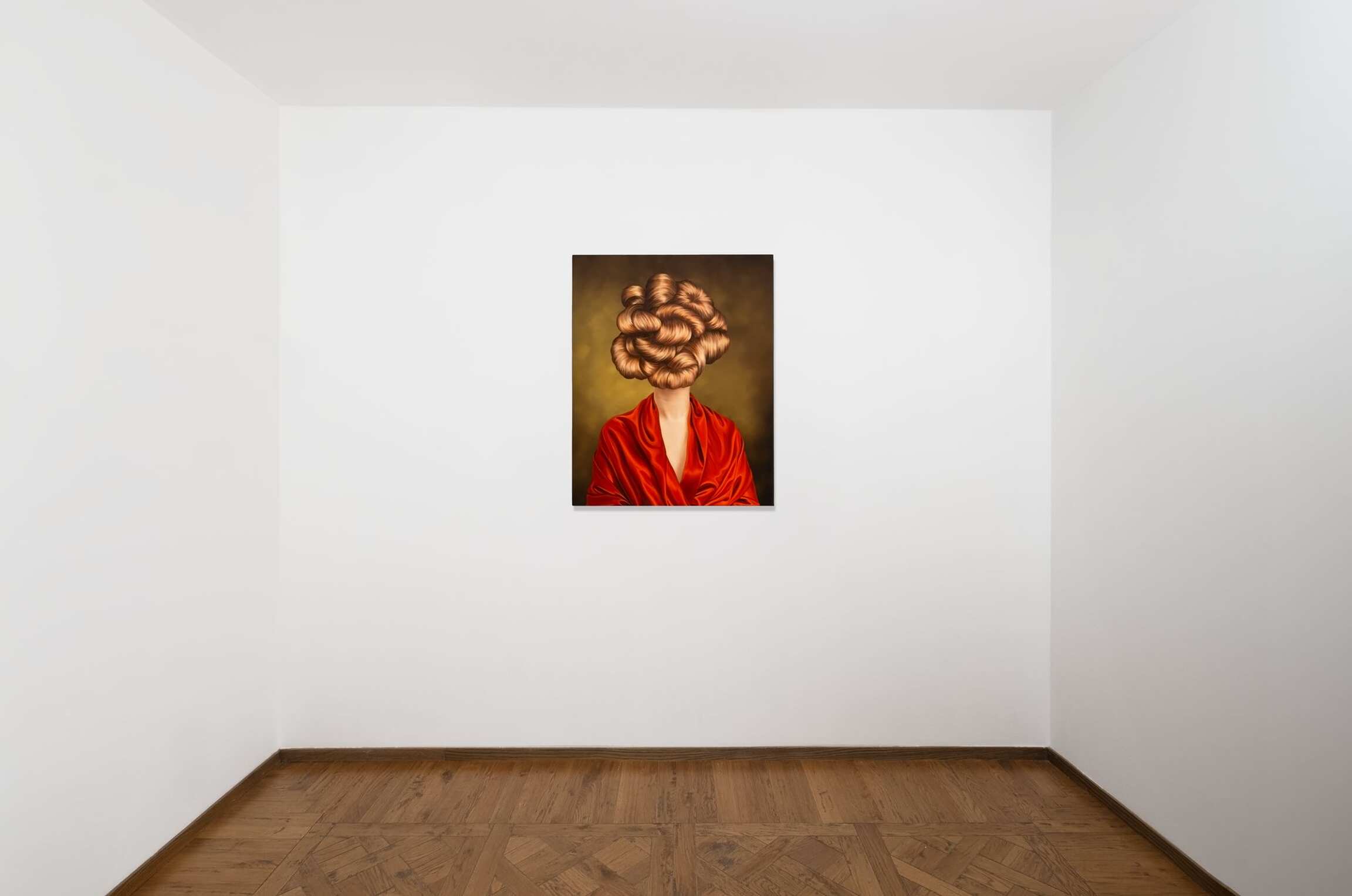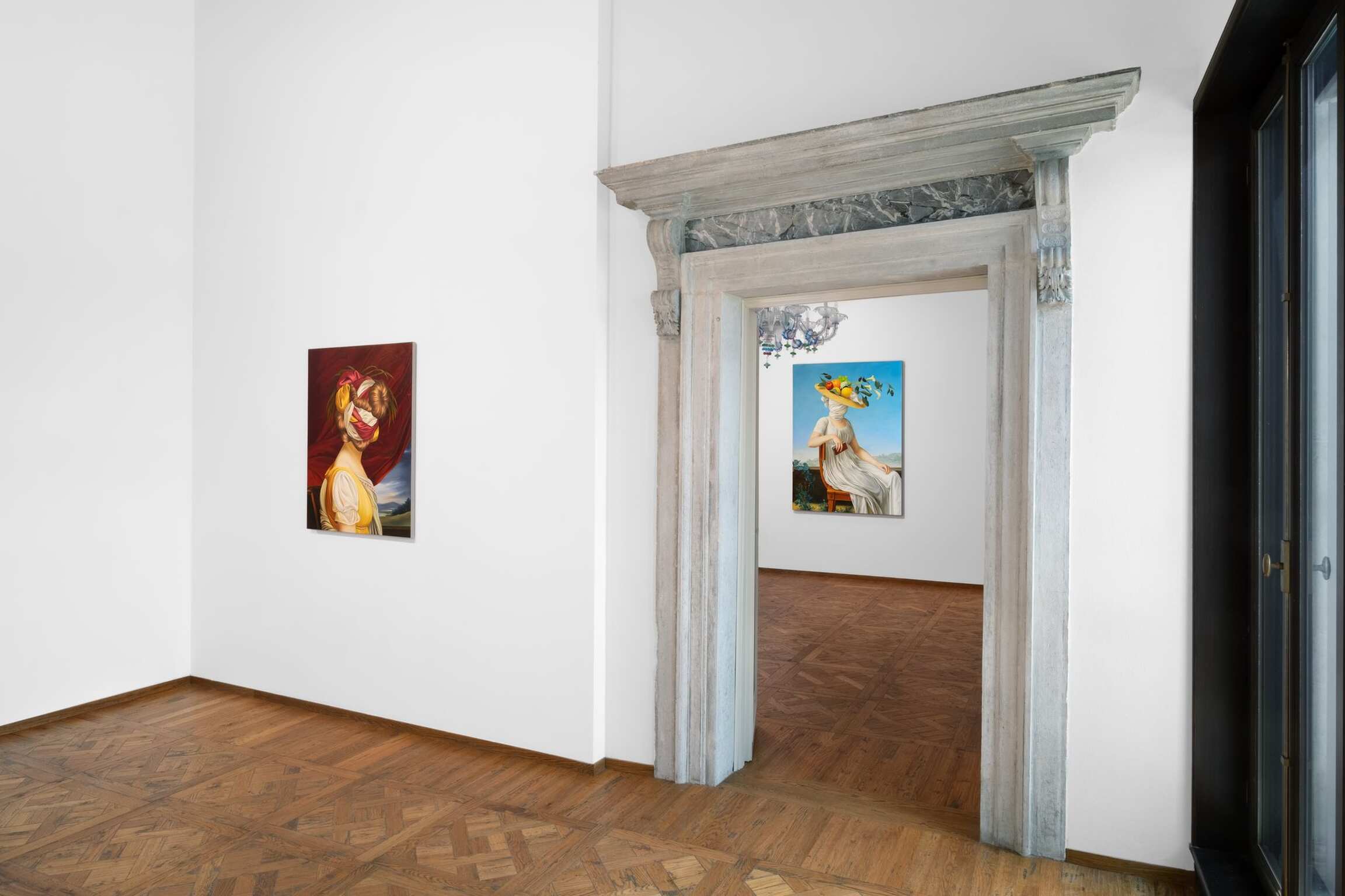 In her versions of old portraits, Juszkiewicz cultivates a traditional pictorial craft, painting in layers, with many glazes, following the brushstrokes of the original work. But her technical virtuosity would be useless were it not at the service of a transgressive project. By covering the face of historical portraits, Juszkiewicz challenges the very essence of this genre: she destroys the portrait as such. Her paintings are no longer portraits of anyone in particular, but representations of the condition of women under patriarchy. And, as she points out, at the heart of the intervened portrait she drives the stake of another genre: the still life, to which belong the fabrics, flowers, fruits, and other objects the artist uses as masks, subverting the traditional hierarchy of genres and the culture/nature dichotomy.