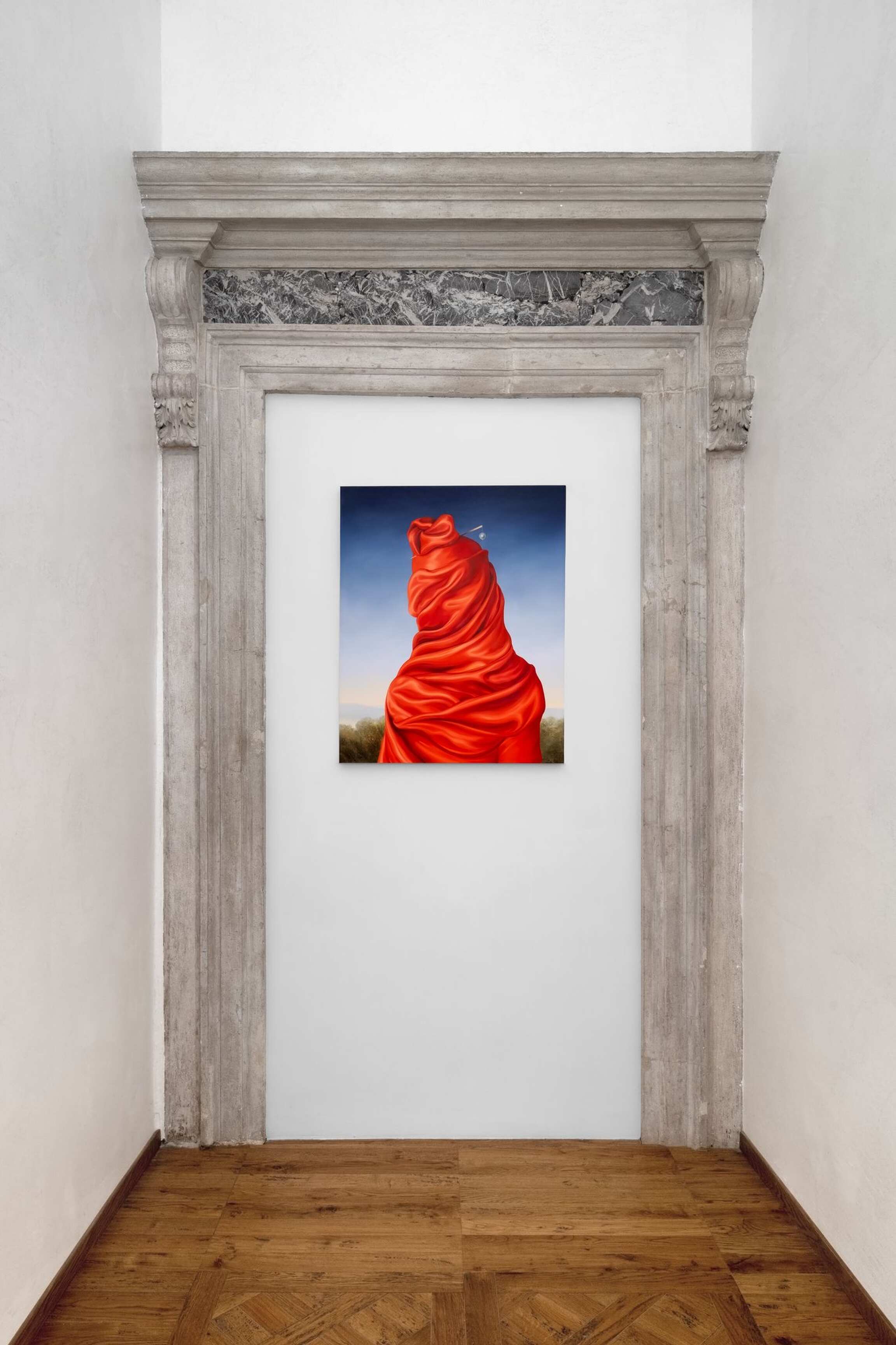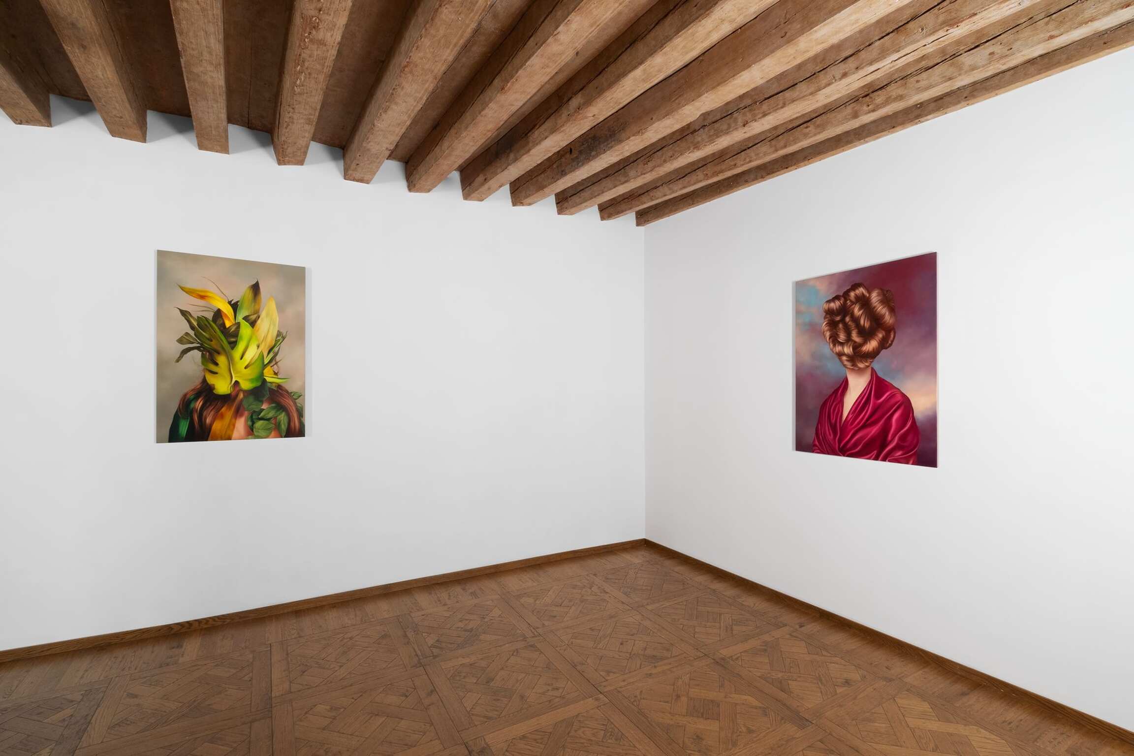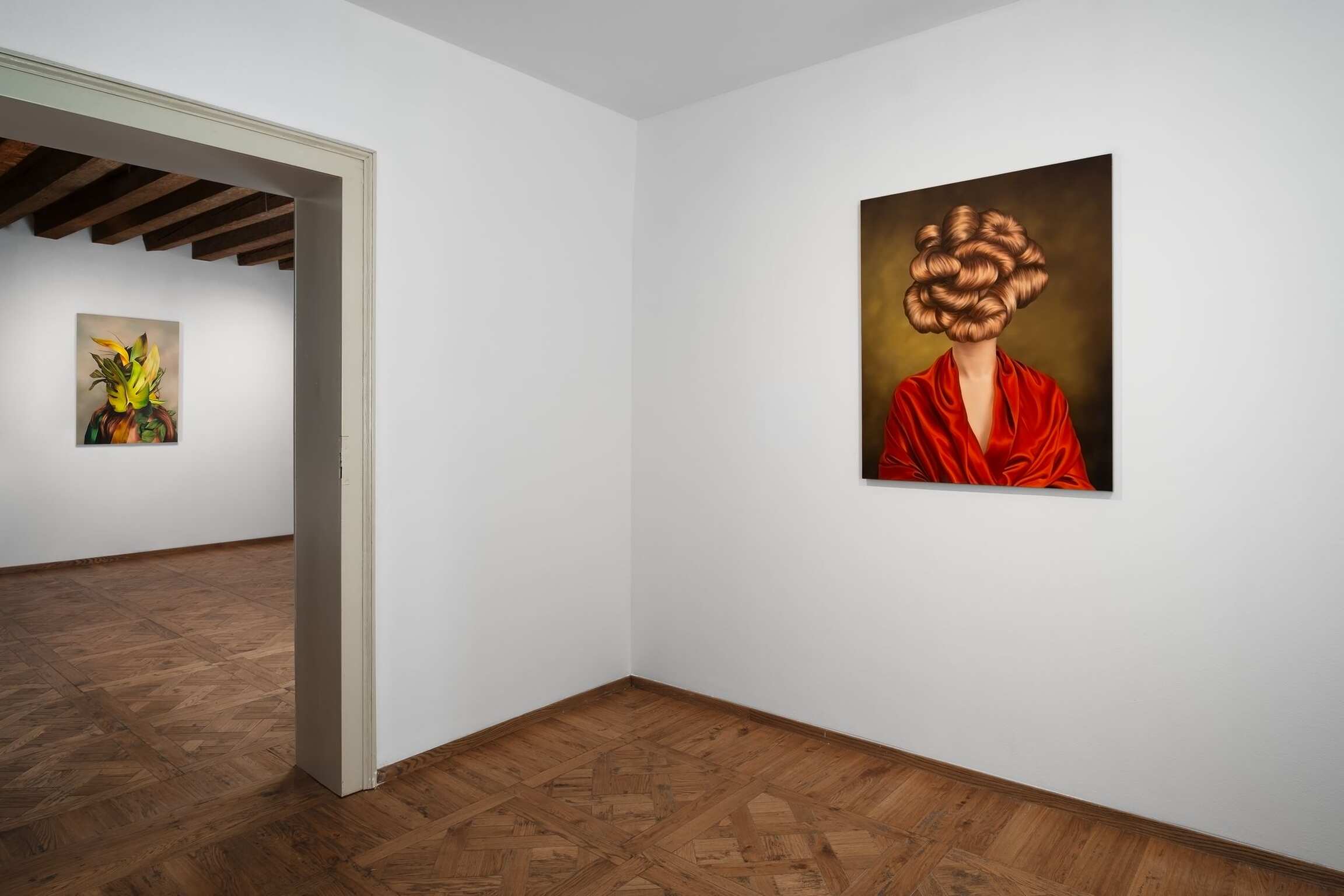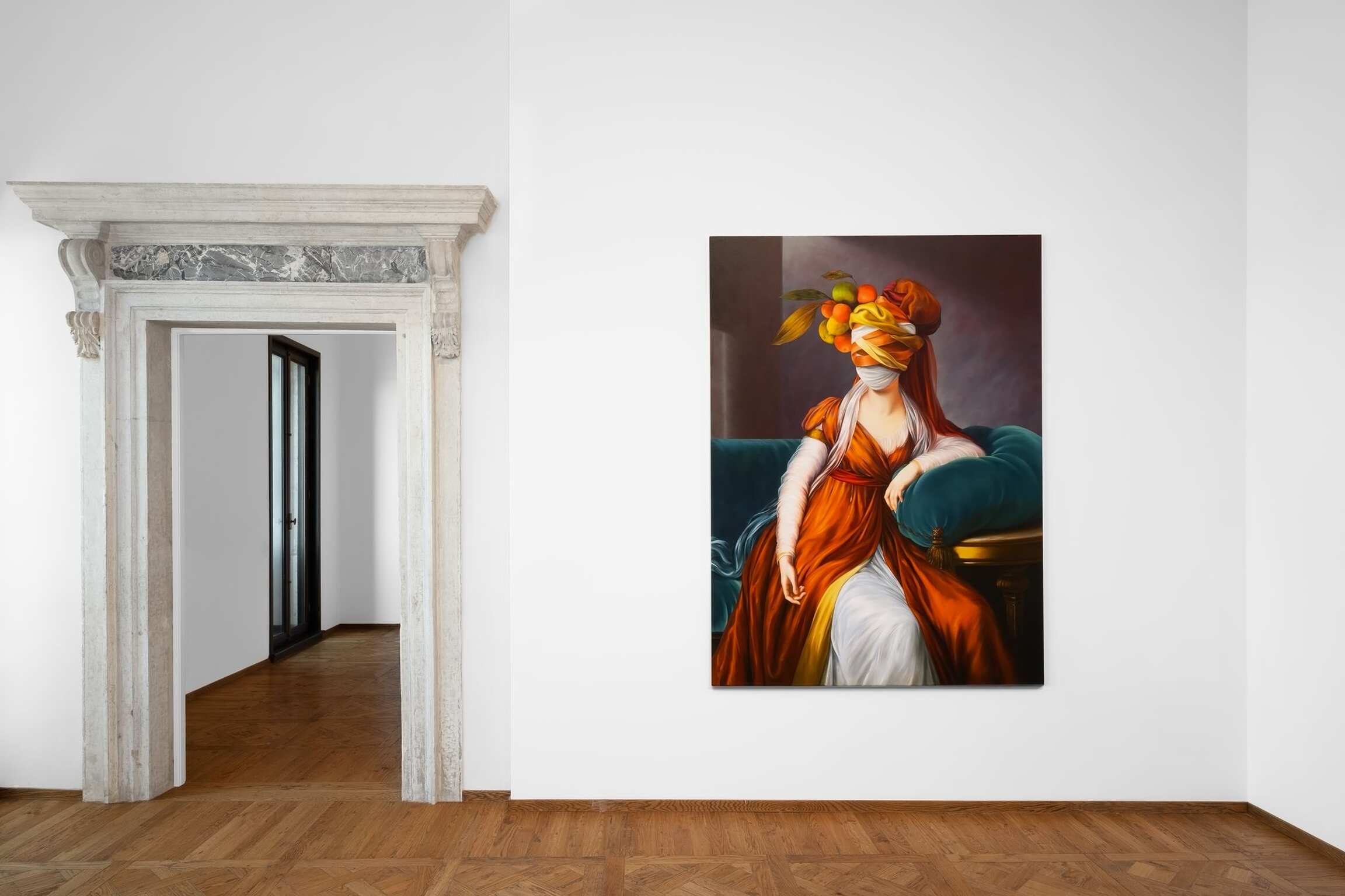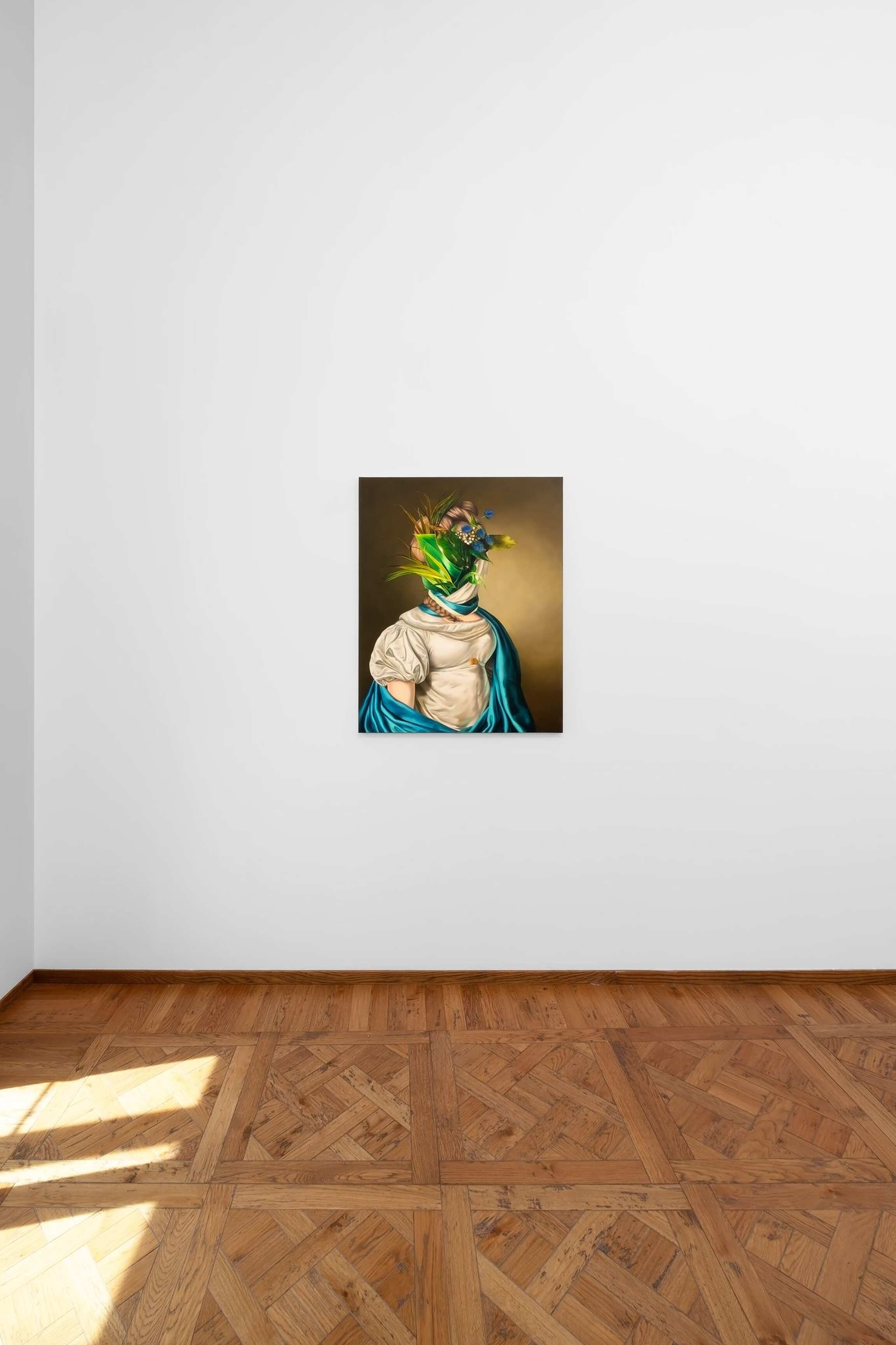 In her versions of old portraits, Juszkiewicz cultivates a traditional pictorial craft, painting in layers, with many glazes, following the brushstrokes of the original work. But her technical virtuosity would be useless were it not at the service of a transgressive project. By covering the face of historical portraits, Juszkiewicz challenges the very essence of this genre: she destroys the portrait as such. Her paintings are no longer portraits of anyone in particular, but representations of the condition of women under patriarchy. And, as she points out, at the heart of the intervened portrait she drives the stake of another genre: the still life, to which belong the fabrics, flowers, fruits, and other objects the artist uses as masks, subverting the traditional hierarchy of genres and the culture/nature dichotomy.