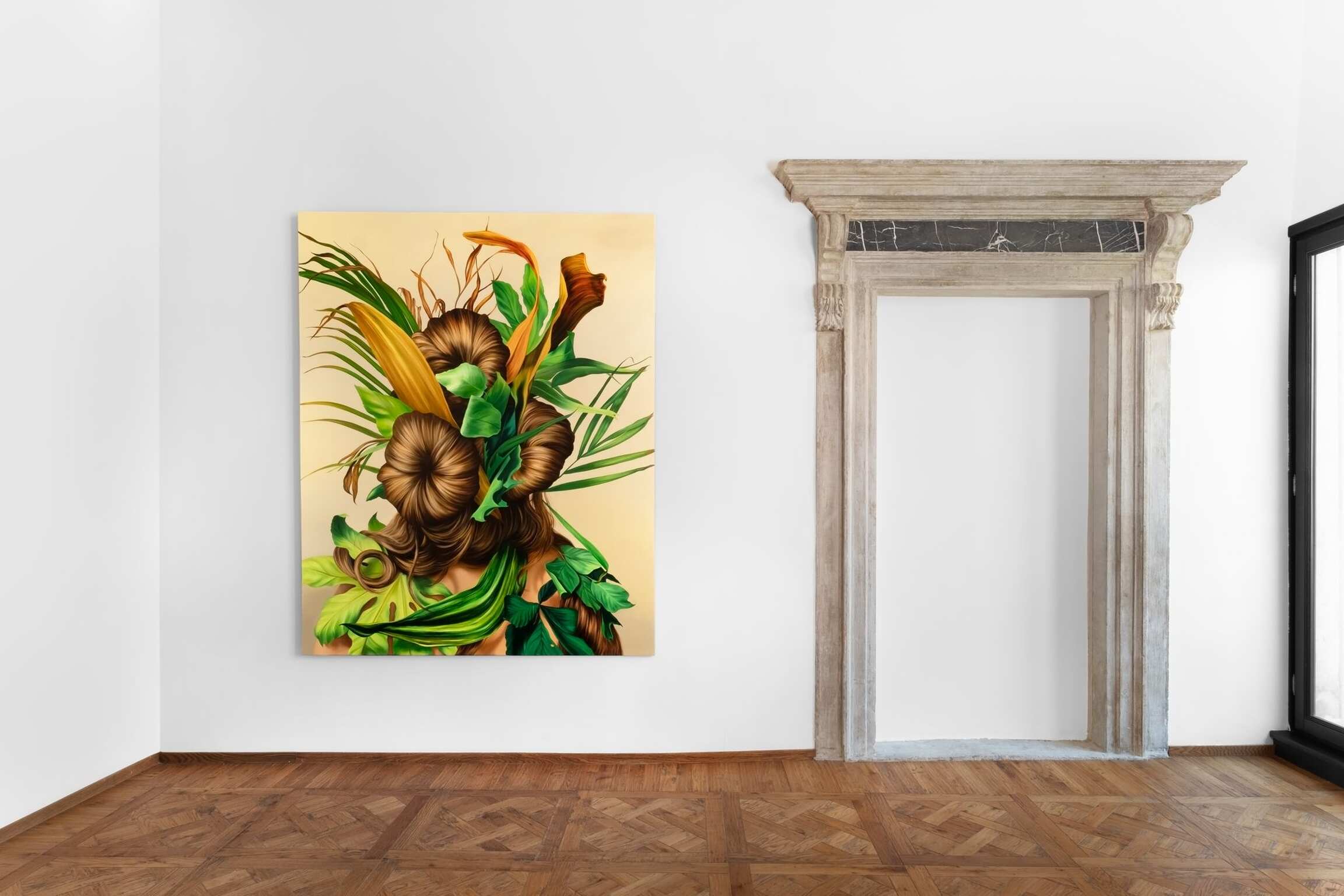 Così è per i capelli, considerati uno degli elementi chiave dell'identità femminile in secoli di cultura patriarcale e uno degli elementi simbolici dell'ansia sessuale maschile e della mitologia del potere sessuale femminile. Nelle opere di Juszkiewicz, i capelli sono presentati in due modalità antitetiche. Da un lato, ci sono le teste con i capelli raccolti e rigorosamente pettinati o intrecciati o arricciati, che sono l'antitesi dell'apertura del volto: qualcosa senza occhi o bocca, incapace di parlare o di rivolgerci lo sguardo. Poi ci sono i capelli aggrovigliati, intrecciati con foglie e rami, che avvolgono la testa come la vegetazione invade le rovine. Lisa Small, curatrice di arte Europea al Brooklyn Museum, inizia il suo brillante saggio sull'opera di Juszkiewicz evocando la metamorfosi di Dafne.9 La trasformazione dei capelli della ninfa in foglie affonda le sue radici in una parola greca, κόμη, che indica sia i capelli sia il fogliame degli alberi. Quando Juszkiewicz intreccia capelli e fibre vegetali, avviene una regressione, come se i capelli tornassero alla loro origine naturale. Una regressione che rappresenta ancora una volta un significato ambiguo; sembra avvalorare il cliché sessista delle donne che aspirano alla natura e sfidare il regime patriarcale con un desiderio capace di diventare selvaggio: 'Unendo mondi apparentemente incompatibili, voglio rovesciare un equilibrio noto e una sensualità libera. I miei dipinti nascono da un profondo desiderio di rompere gli schemi esistenti e di far emergere emozioni, sentimenti e passioni'.10