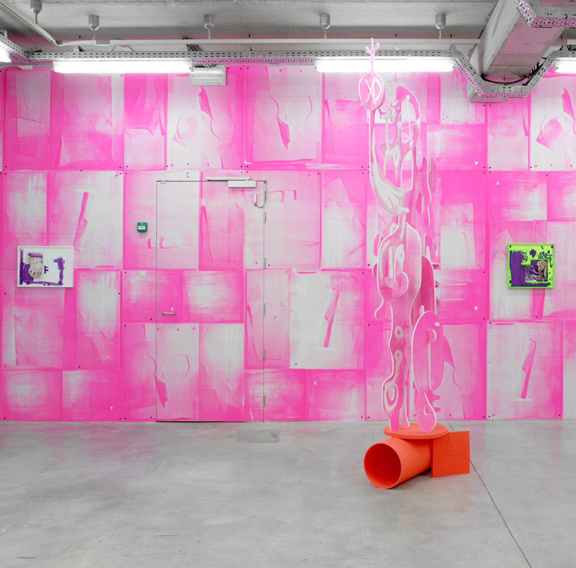 J’ai visité la galerie il y a quelques mois et j’ai simplement commencé par faire des croquis en réponse à l’espace. Mes dernières expositions étaient basées sur une idée d’abstraction assez vague qui reposait sur différentes formes de camouflage, à partir de motifs que j’avais créés sur ordinateur. J’ai recouvert les salles et les sculptures du même motif de sorte que les formes s’effacent selon l’angle de vue et changent au fur et à mesure de la visite. Pour cette exposition, j’ai décidé de me servir de ce qui était déjà là, c’est-à-dire les murs blancs. La salle principale se compose de sculptures et d’œuvres murales toutes blanches.