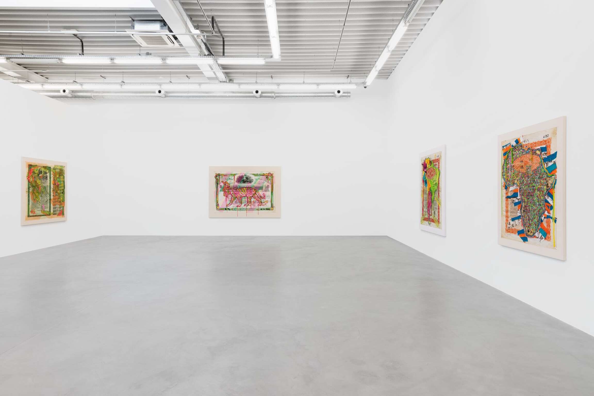 HL : En 2008, j'ai fait une exposition à New-York et trois jours après le vernissage, Lehman Brothers s'est effondré et tout s'est écroulé dans une crise financière mondiale. De retour à Londres, me demandant comment réagir à cette situation, je suis tombé sur de vieux documents d'actions financières d'entreprises qui avaient fait faillite des décennies plus tôt. Je voulais investir dans des entreprises fermées. Elles sont devenues pour moi une fascination et un symbole d'espoir : nous avions déjà traversé cela, nous avions survécu à une crise... L'histoire est un mouvement cyclique. J'étais fasciné par le fait que nous nous en étions remis. Nous sommes, en tant qu'êtres humains, une espèce très optimiste – nous fondons toujours de nouvelles entreprises. Trouver les bons certificats pour raconter une histoire est devenu une obsession. Par exemple, l'action en bourse de l'Indemnisation des réfugiés grecs de 1924 : cette année-là, le gouvernement grec en semi-faillite a signé des contrats avec des banques grecques, britanniques et américaines pour un prêt de plus de 12 millions de livres sterling. Le produit de ce prêt était spécifiquement destiné à la Commission d'établissement des réfugiés. Cent ans plus tard, la Grèce est à nouveau un centre d'accueil pour les réfugiés. Ainsi, cette œuvre – et toutes les œuvres – portent sur les cycles de l'histoire, sans nécessairement se répéter, mais en se rapprochant d'incidents similaires antérieurs.