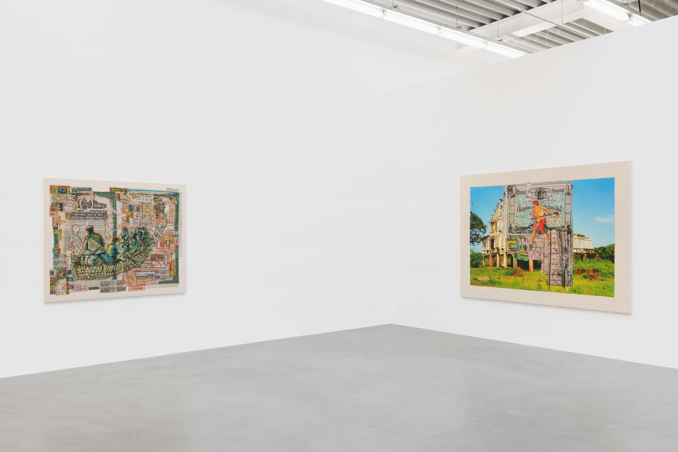 HL: Eigenlijk niet, ze tonen het verstrijken van de tijd, van de geschiedenis: ooit waren het prachtige koloniale houten huizen, in Guyana, maar het zijn geen geweldige huizen meer omdat ze economisch gezien moeilijk te conserveren zijn. Ze zijn uiteengevallen. Dat maakt me verdrietig, omdat het voor mij persoonlijk betekent dat mijn kindertijd verdwijnt. Door ze in Brussel te tonen, toon ik het voorbijgaan van een koloniaal tijdperk. En wanneer je door de straten van deze stad loopt, krijg je misschien hetzelfde gevoel. Het zijn niet zomaar spookhuizen, er is veel meer aan de hand. In Raw Materials 18 maakte ik kennis met de eigenaar van dat huis, een zwarte man, wiens vader ooit werkte voor de eigenaars van dat huis en wenste dat hij ‘dat huis ooit zou bezitten’. En nu is hij de eigenaar van dat huis, maar het is een bezit dat geleidelijk verdwijnt. Dus in feite bezit hij alleen de ruïne. In deze afbeelding zijn veel verschillende verhalen verwerkt: de man met het geweer is een ontsnapte slaaf, een marron, en het Panamakanaal-aandelencertificaat was van een Franse onderneming die het kanaal probeerde aan te leggen, maar daar niet in slaagde. De onderneming had veel Caraïbische arbeiders in dienst. Het huis staat symbool voor onze laatkapitalistische samenleving. Deze valt uiteen en slaagt er niet in om al zijn inwoners onderdak te bieden. Deze huizen vertegenwoordigen het verstrijken van de tijd.