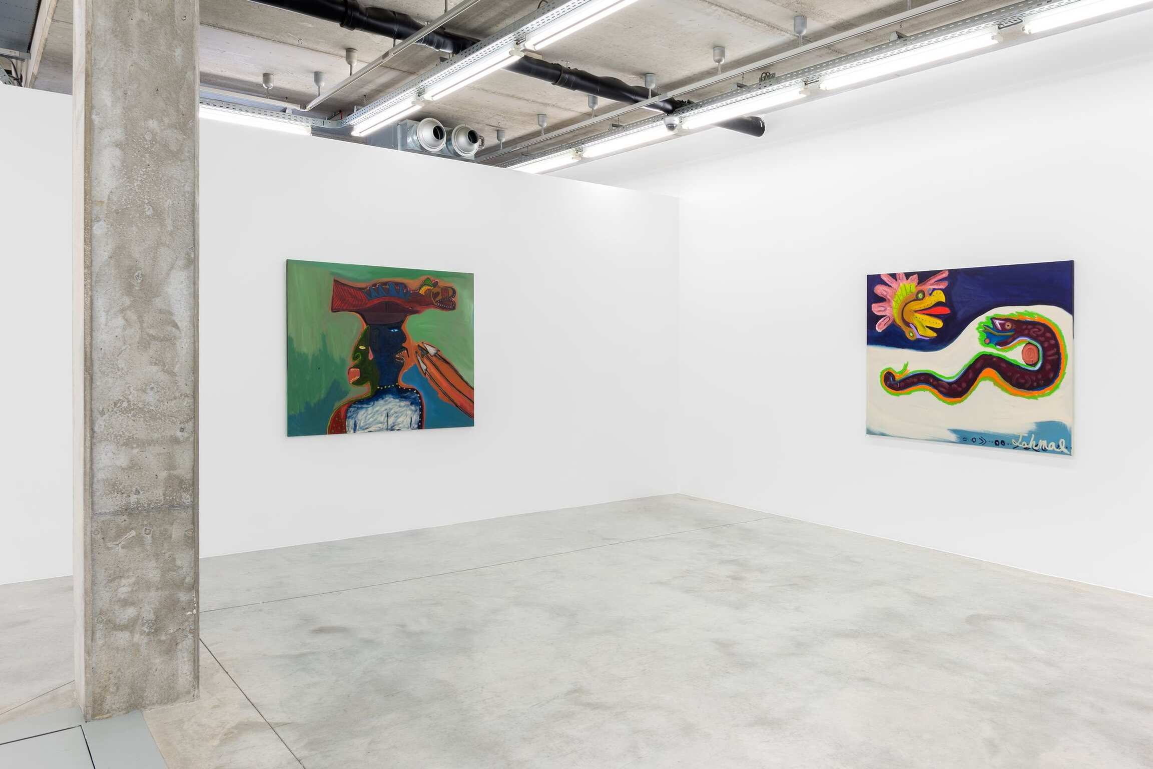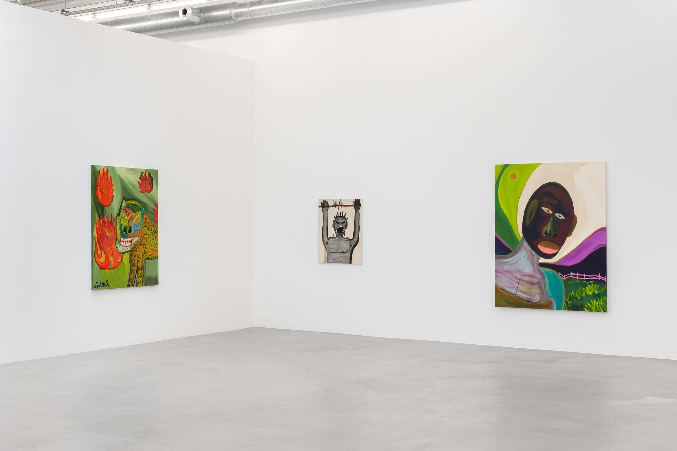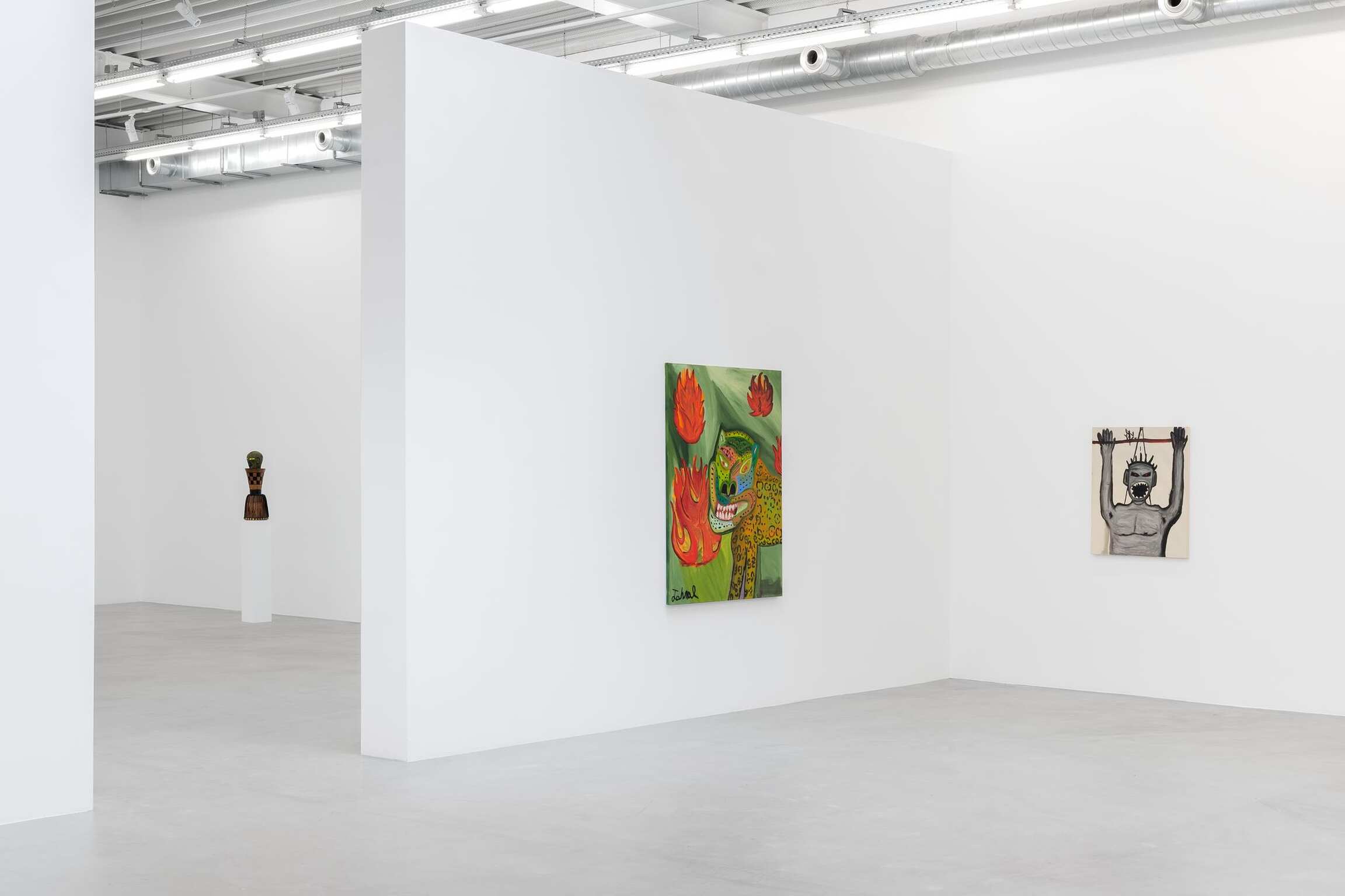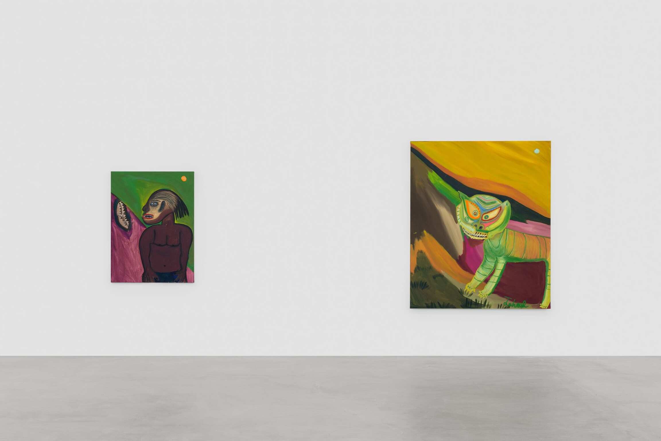 The paintings exhibited at Almine Rech Gallery Brussels belong to this latest series. Interior spaces have made way for dreamscapes where jungle, savannah and desert mesh together. Planes of violently and flamboyantly contrasting colour constitute a dry, abstract background from which characters, masks, shamans, and wild animals burst forth. Hallucinations and oniric visions bear witness to Marcus Jahmal’s recent interest in Dogon culture, from which we can also identify certain masks. Like his Fauvist, Cubist, and Expressionist predecessors, Jahmal takes inspiration from Africa and beyond: tigers and paddy fields glance to Asia while skeletons hint at Mexican culture, resulting in an incantatory and archaic impression. Jahmal has preserved the sheer expressiveness of colour present in his modestly-sized and intimate early works but has left the everyday behind, opening up to strange and distant horizons by widening the frame and flattening perspectives. Here, the figures dominate their surrounding environment: while oscillating between submission and threat, human and animal, they haunt the pictorial plane. Their stance evokes not only physical control but also suggests their capacity to access immaterial forces, be they creative or destructive: constituting perhaps a polymorphic portrait of the artist himself.