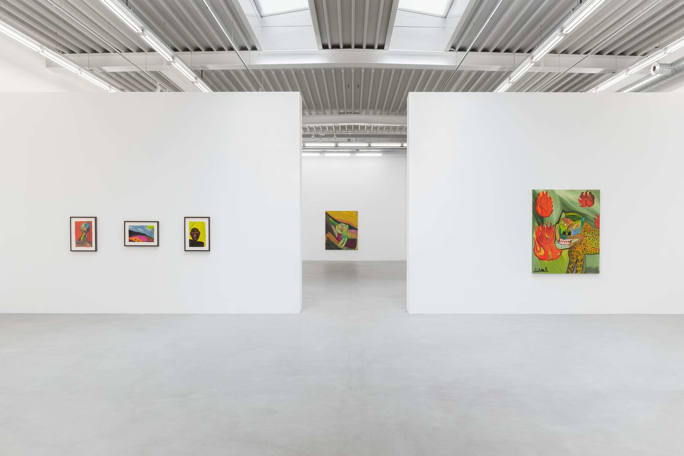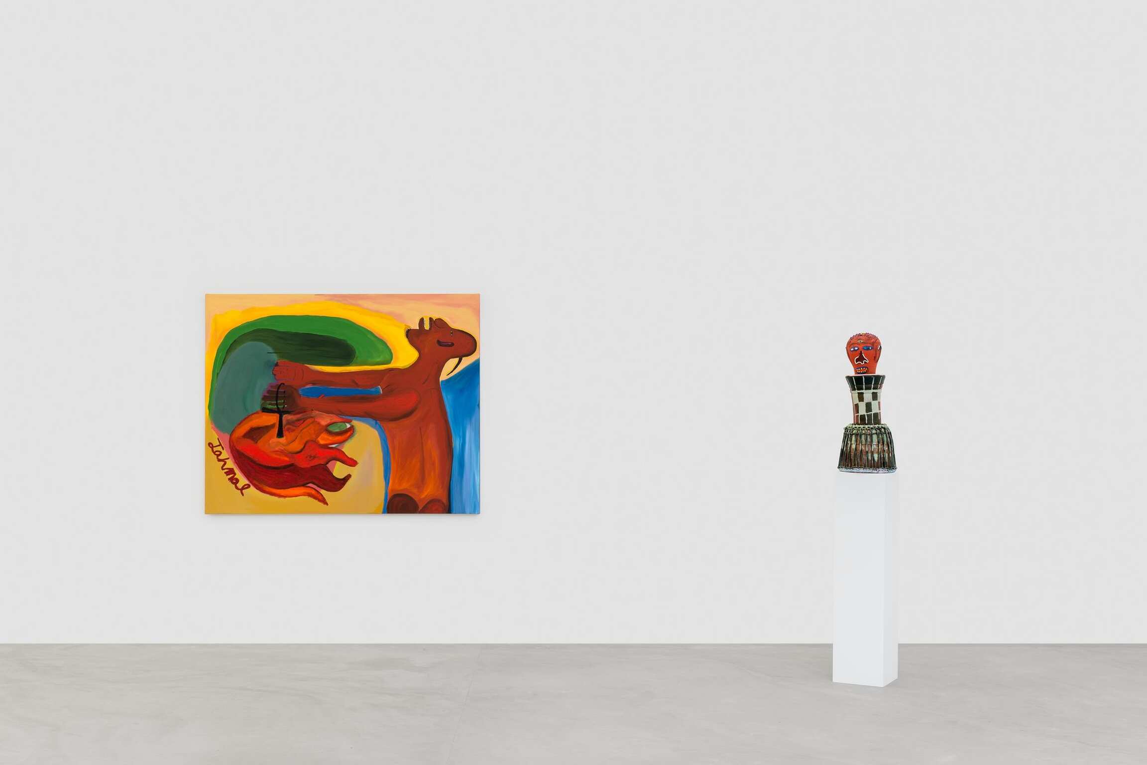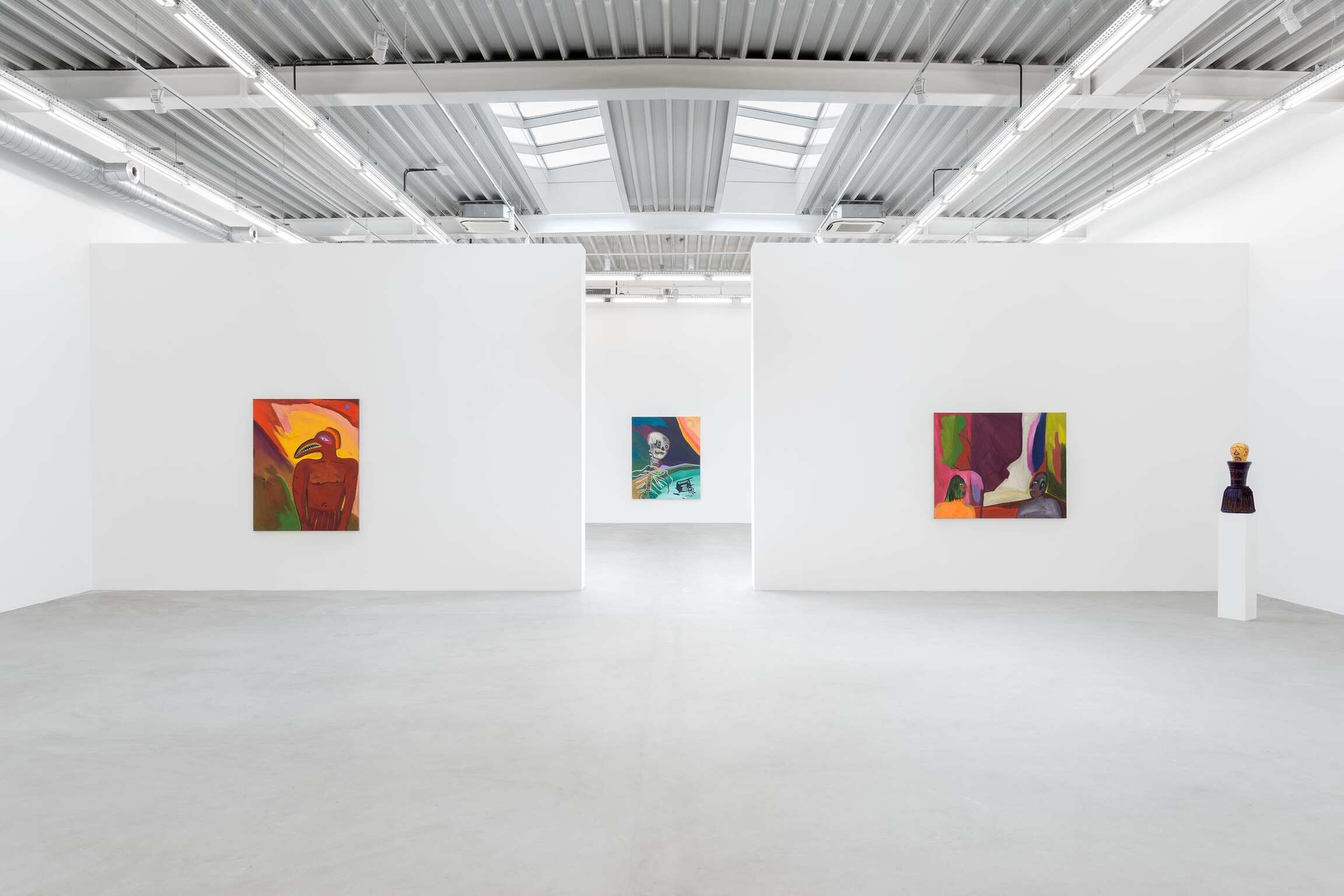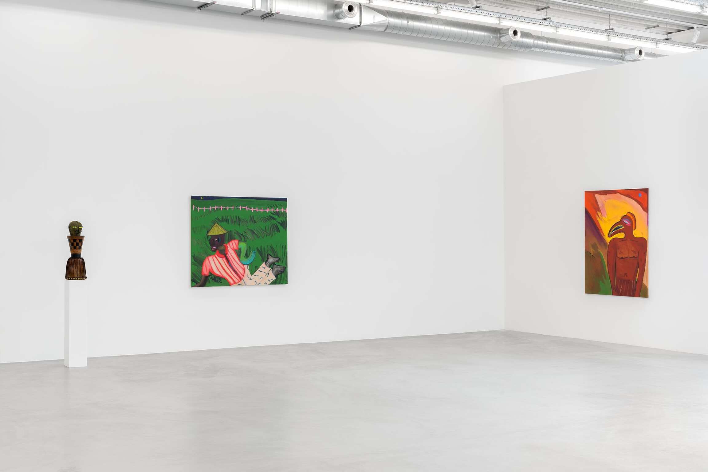 The paintings exhibited at Almine Rech Gallery Brussels belong to this latest series. Interior spaces have made way for dreamscapes where jungle, savannah and desert mesh together. Planes of violently and flamboyantly contrasting colour constitute a dry, abstract background from which characters, masks, shamans, and wild animals burst forth. Hallucinations and oniric visions bear witness to Marcus Jahmal’s recent interest in Dogon culture, from which we can also identify certain masks. Like his Fauvist, Cubist, and Expressionist predecessors, Jahmal takes inspiration from Africa and beyond: tigers and paddy fields glance to Asia while skeletons hint at Mexican culture, resulting in an incantatory and archaic impression. Jahmal has preserved the sheer expressiveness of colour present in his modestly-sized and intimate early works but has left the everyday behind, opening up to strange and distant horizons by widening the frame and flattening perspectives. Here, the figures dominate their surrounding environment: while oscillating between submission and threat, human and animal, they haunt the pictorial plane. Their stance evokes not only physical control but also suggests their capacity to access immaterial forces, be they creative or destructive: constituting perhaps a polymorphic portrait of the artist himself.