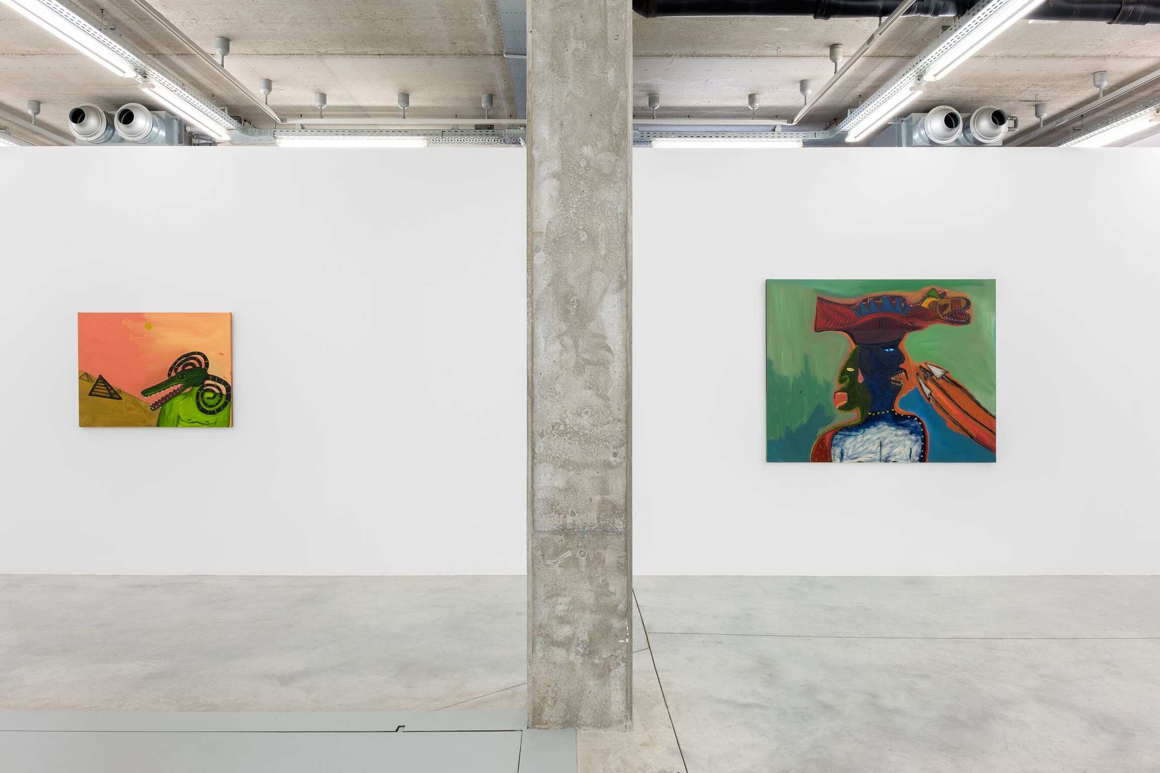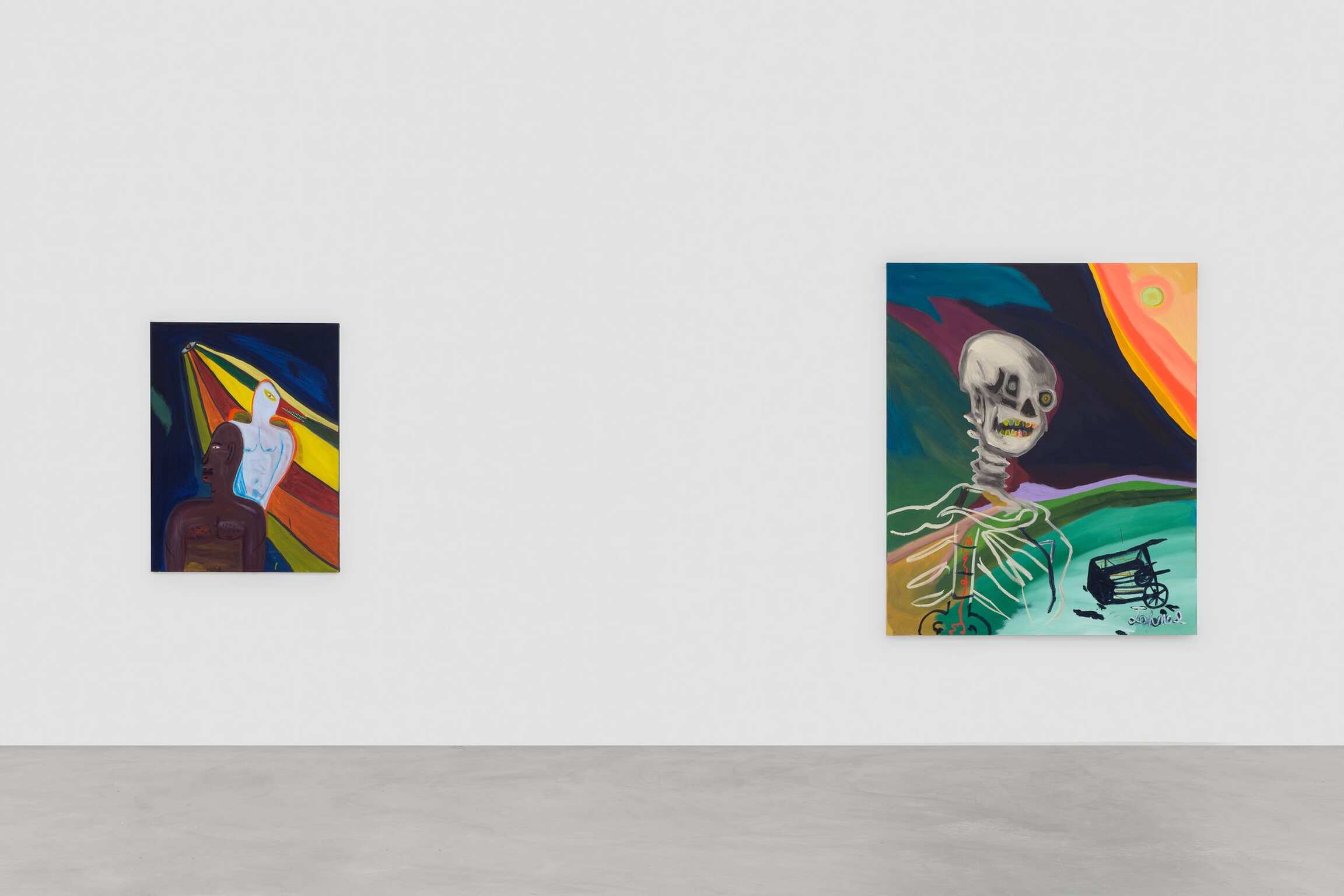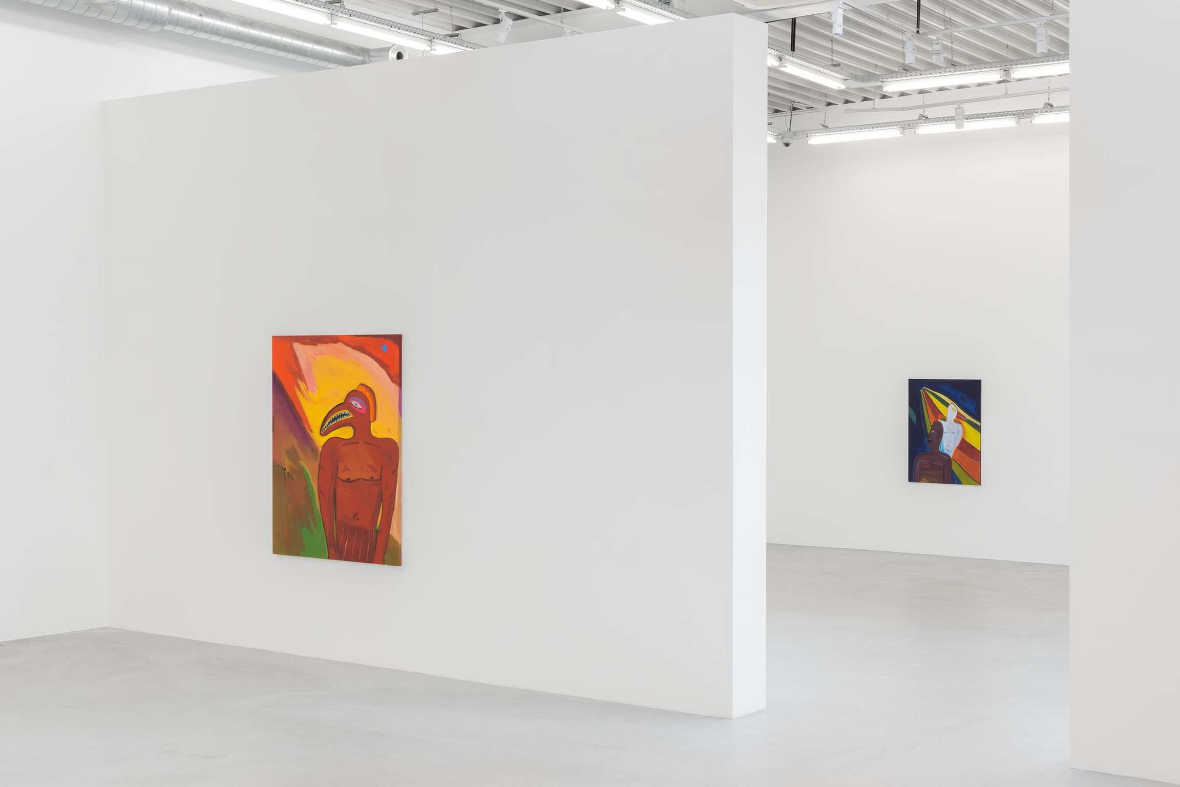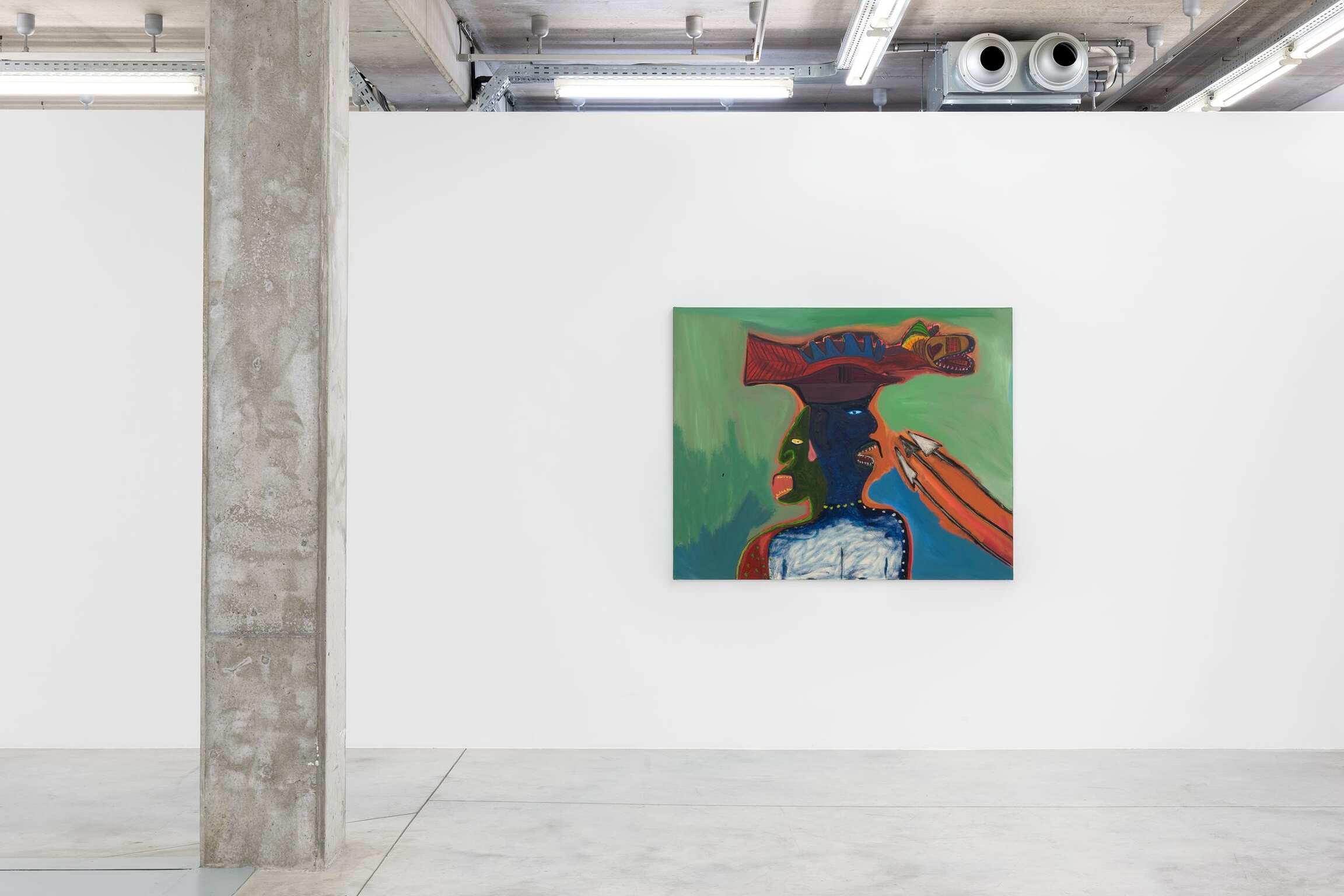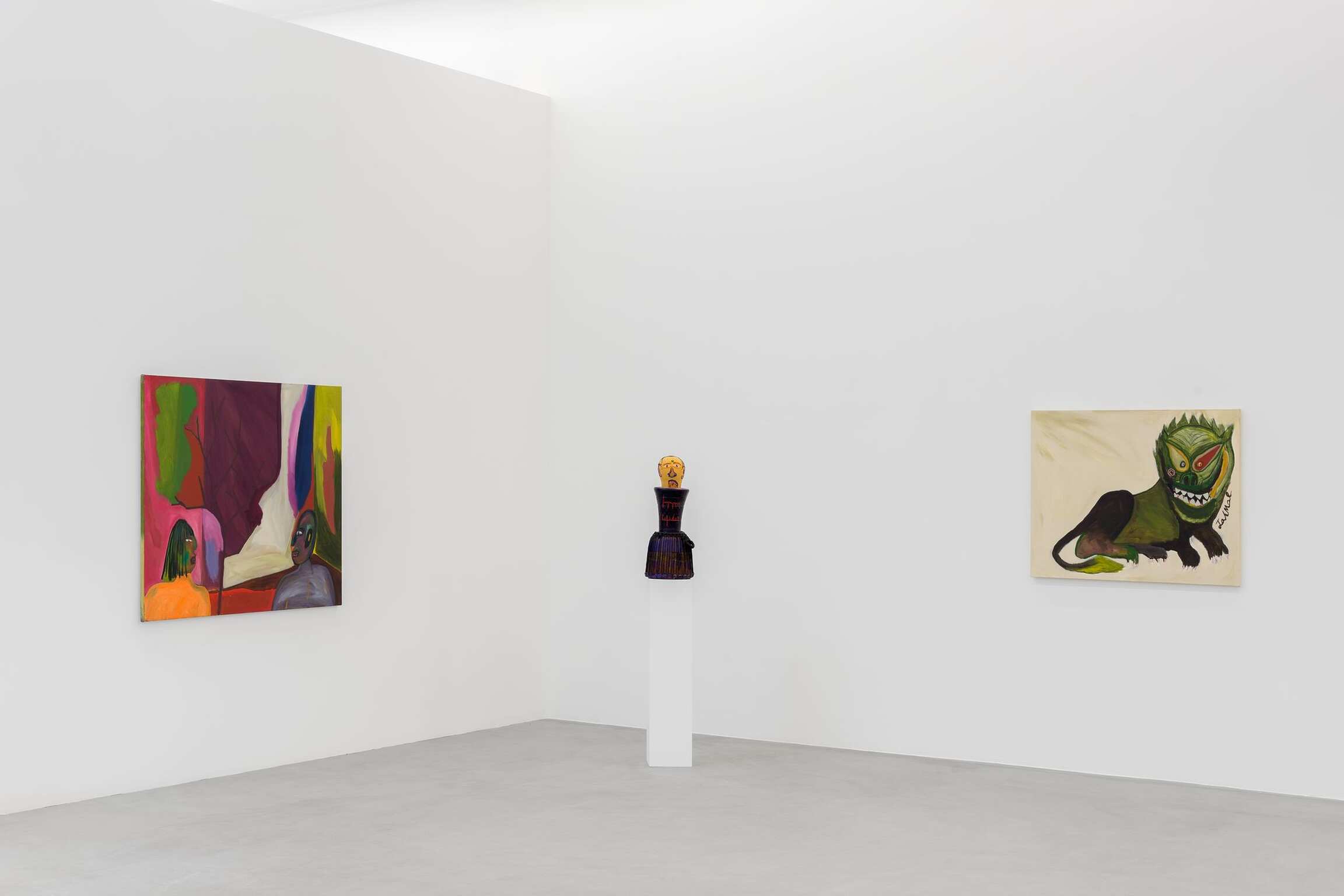 The paintings exhibited at Almine Rech Gallery Brussels belong to this latest series. Interior spaces have made way for dreamscapes where jungle, savannah and desert mesh together. Planes of violently and flamboyantly contrasting colour constitute a dry, abstract background from which characters, masks, shamans, and wild animals burst forth. Hallucinations and oniric visions bear witness to Marcus Jahmal’s recent interest in Dogon culture, from which we can also identify certain masks. Like his Fauvist, Cubist, and Expressionist predecessors, Jahmal takes inspiration from Africa and beyond: tigers and paddy fields glance to Asia while skeletons hint at Mexican culture, resulting in an incantatory and archaic impression. Jahmal has preserved the sheer expressiveness of colour present in his modestly-sized and intimate early works but has left the everyday behind, opening up to strange and distant horizons by widening the frame and flattening perspectives. Here, the figures dominate their surrounding environment: while oscillating between submission and threat, human and animal, they haunt the pictorial plane. Their stance evokes not only physical control but also suggests their capacity to access immaterial forces, be they creative or destructive: constituting perhaps a polymorphic portrait of the artist himself.