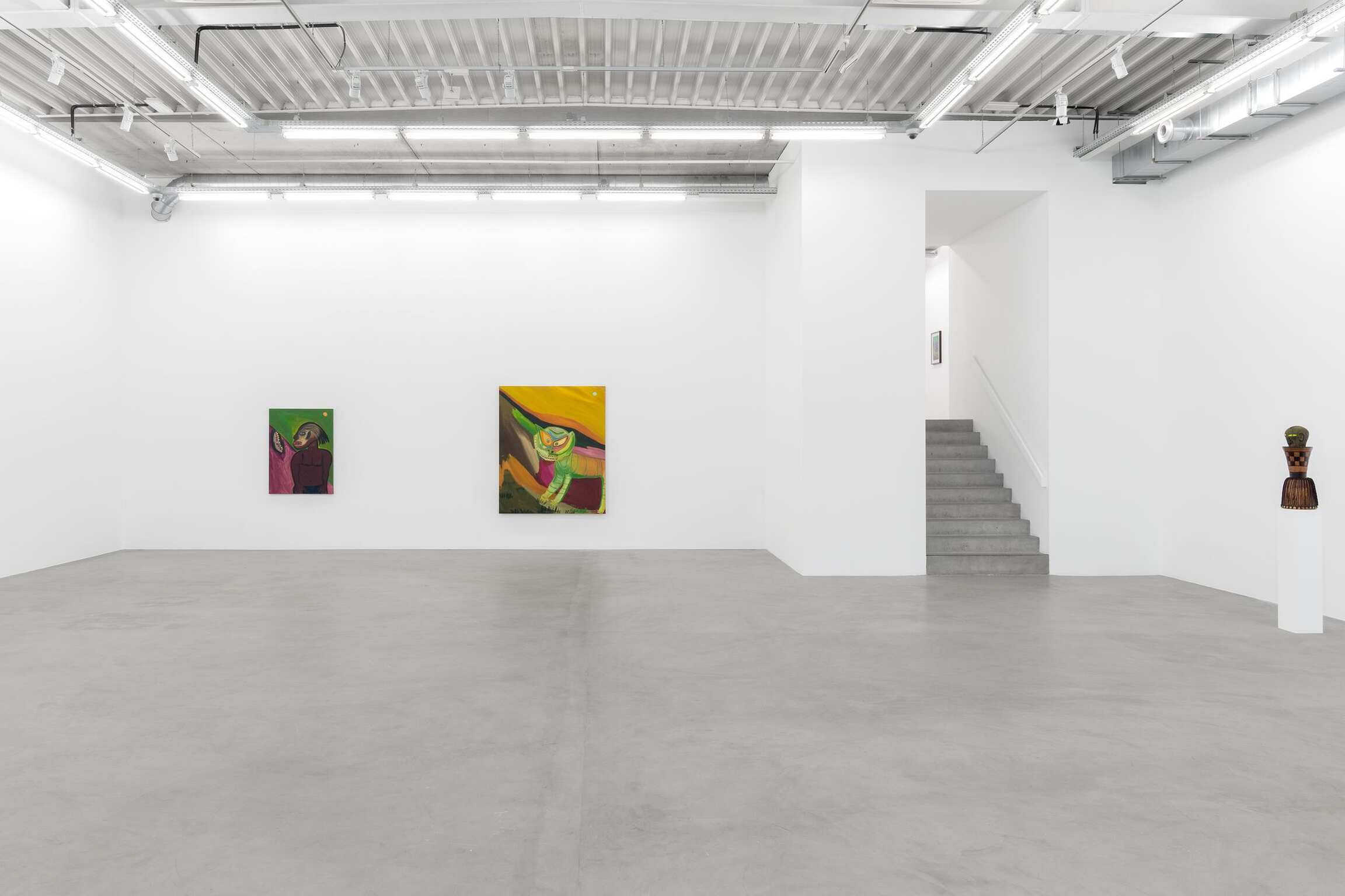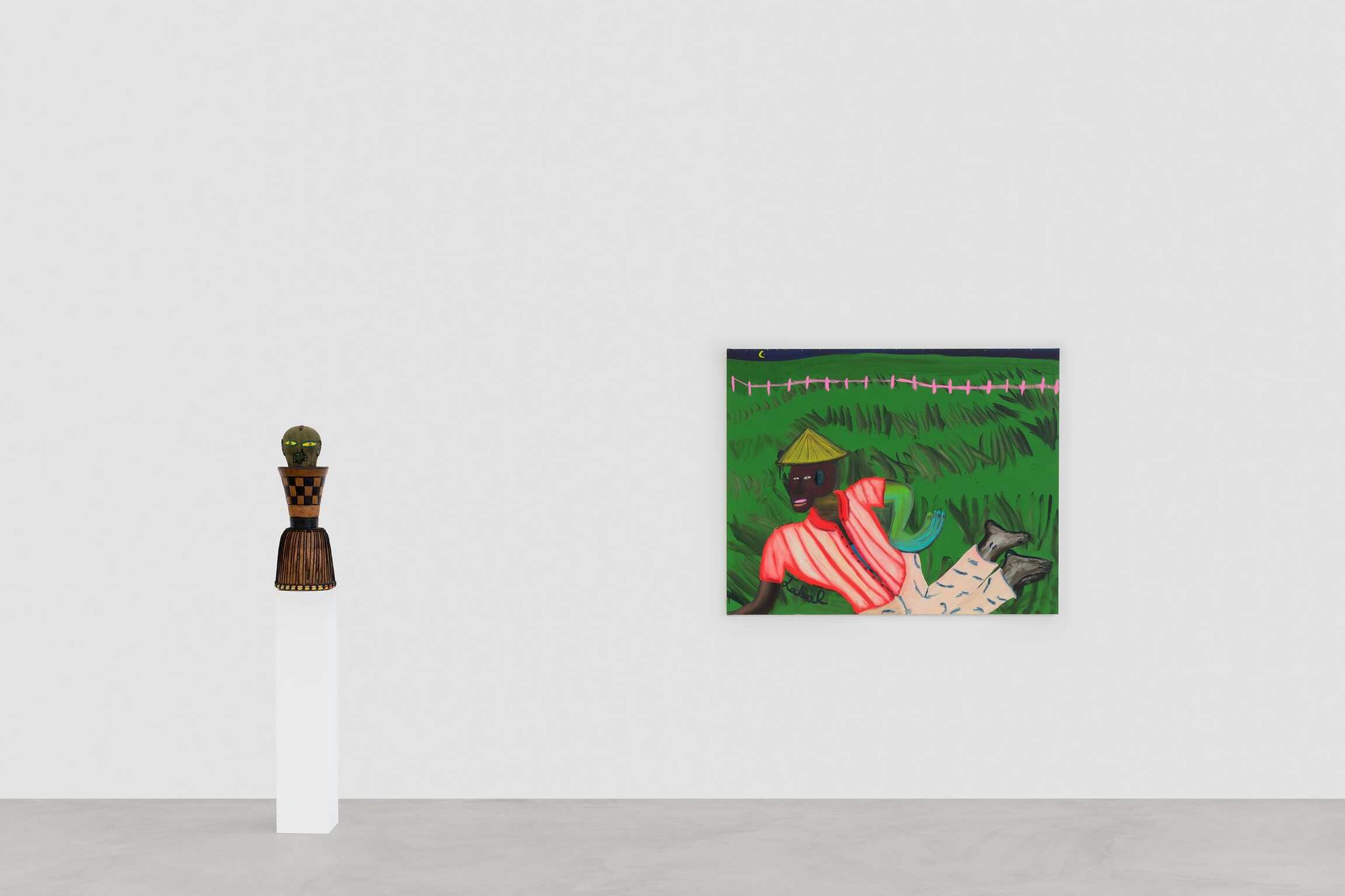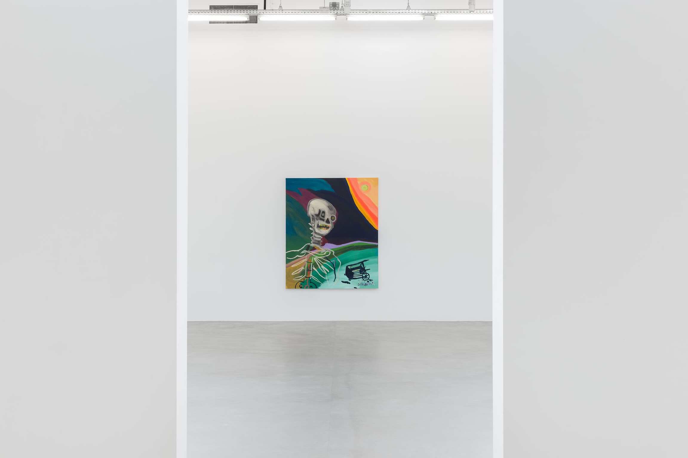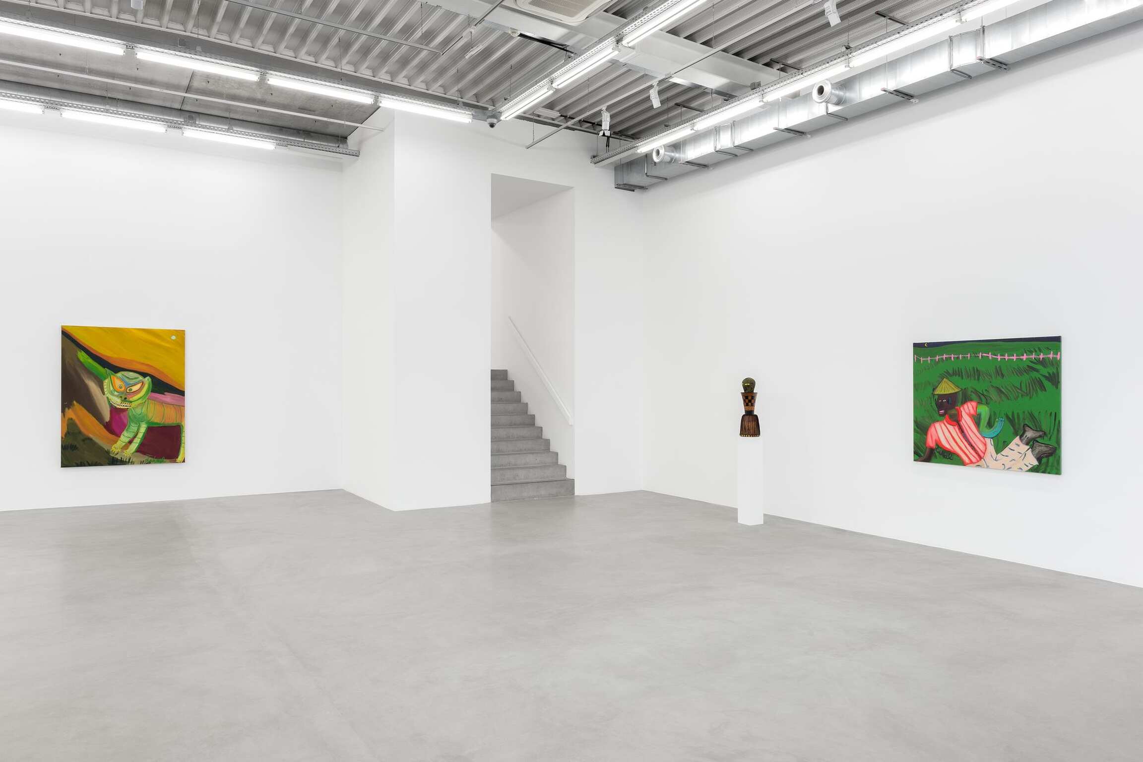 The paintings exhibited at Almine Rech Gallery Brussels belong to this latest series. Interior spaces have made way for dreamscapes where jungle, savannah and desert mesh together. Planes of violently and flamboyantly contrasting colour constitute a dry, abstract background from which characters, masks, shamans, and wild animals burst forth. Hallucinations and oniric visions bear witness to Marcus Jahmal’s recent interest in Dogon culture, from which we can also identify certain masks. Like his Fauvist, Cubist, and Expressionist predecessors, Jahmal takes inspiration from Africa and beyond: tigers and paddy fields glance to Asia while skeletons hint at Mexican culture, resulting in an incantatory and archaic impression. Jahmal has preserved the sheer expressiveness of colour present in his modestly-sized and intimate early works but has left the everyday behind, opening up to strange and distant horizons by widening the frame and flattening perspectives. Here, the figures dominate their surrounding environment: while oscillating between submission and threat, human and animal, they haunt the pictorial plane. Their stance evokes not only physical control but also suggests their capacity to access immaterial forces, be they creative or destructive: constituting perhaps a polymorphic portrait of the artist himself.